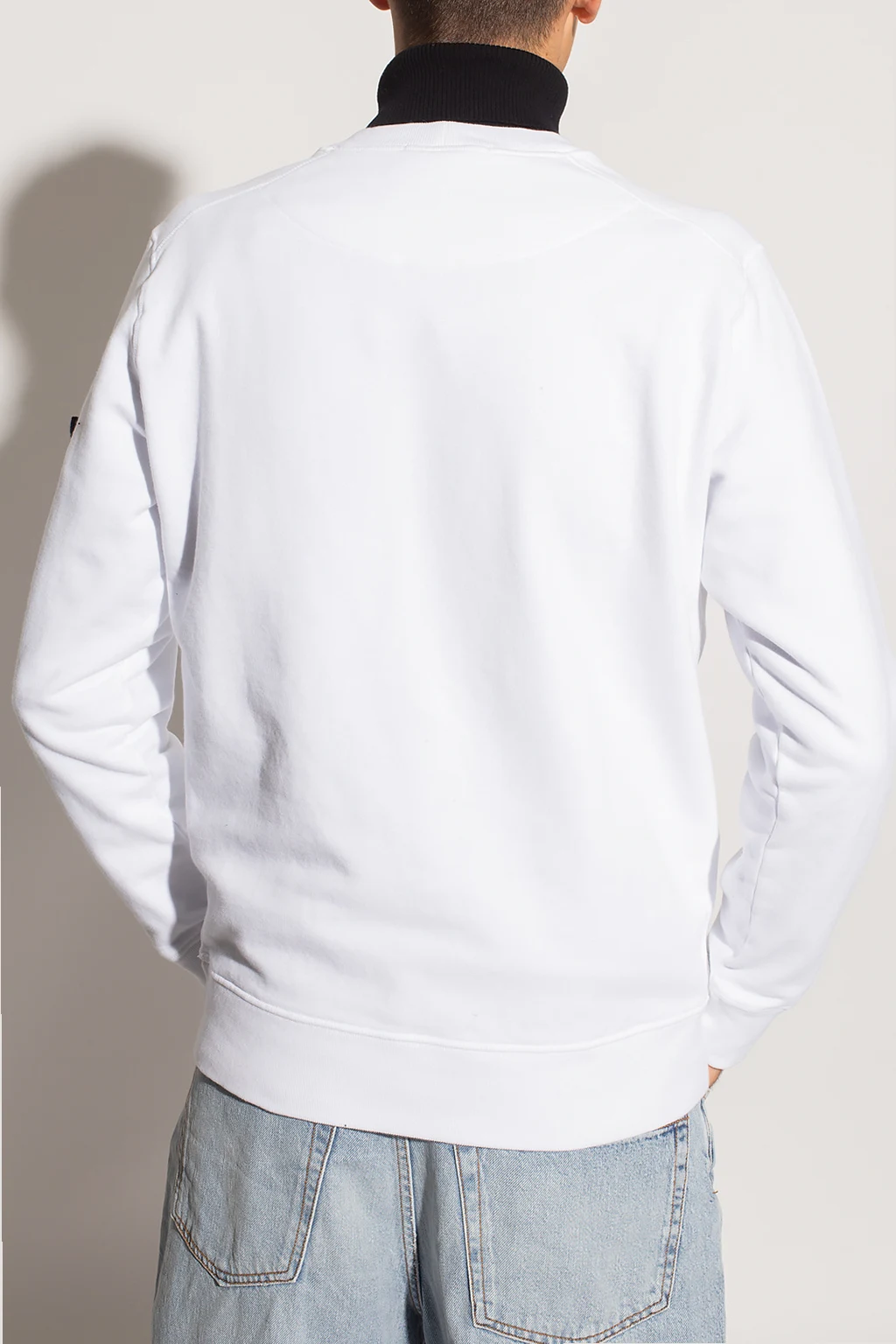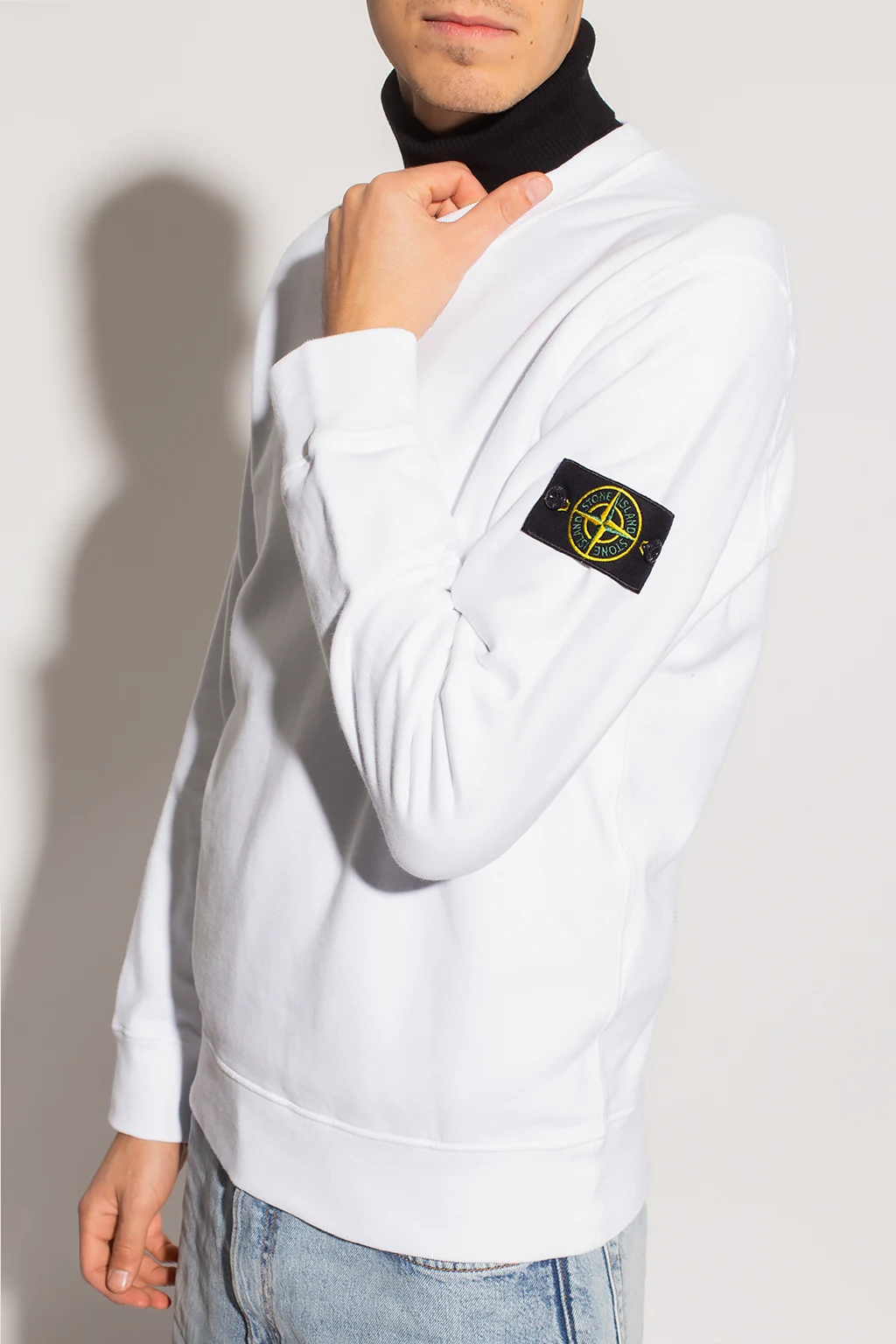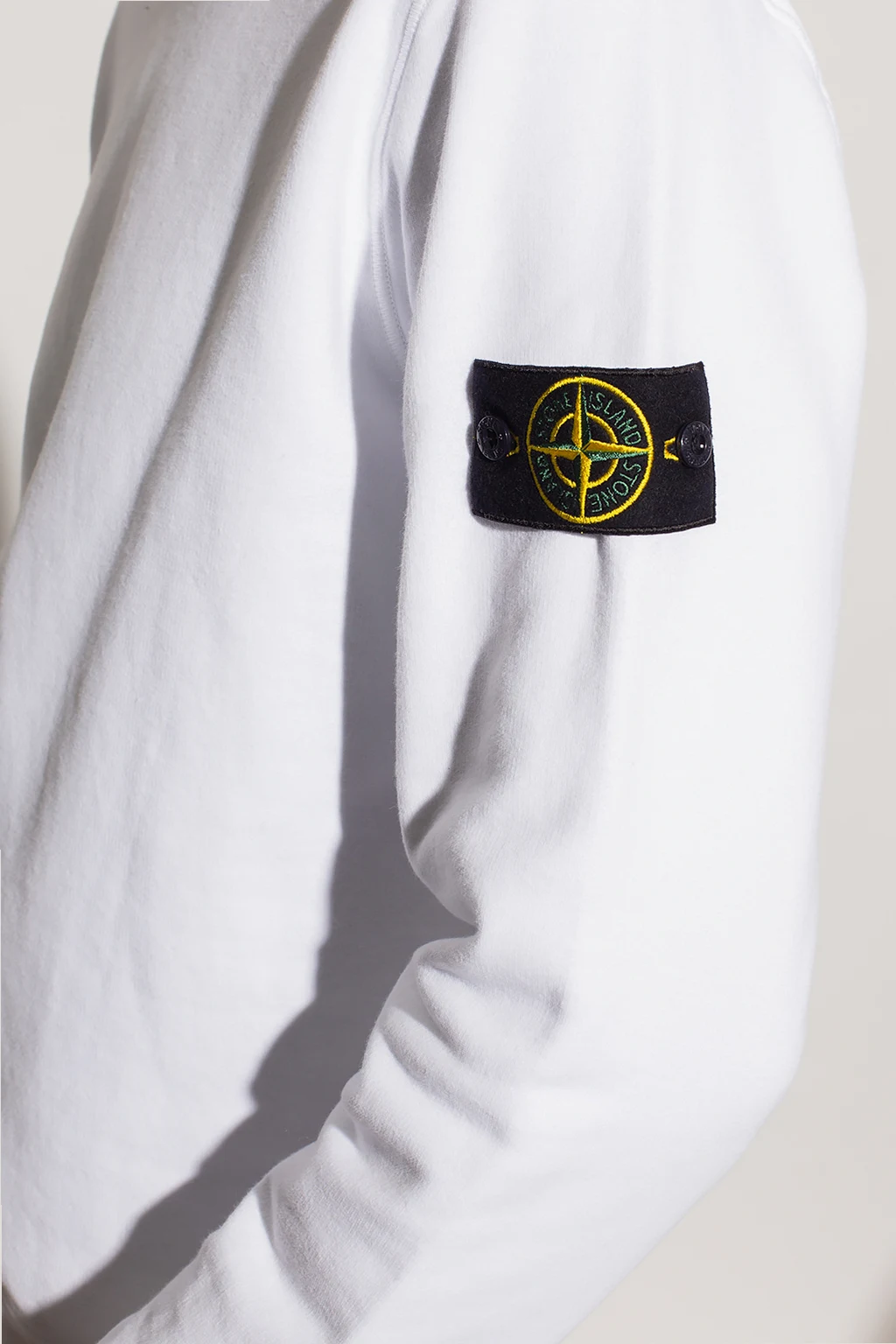 White crewneck sweatshirt from Stone Island. Crafted from cotton jersey, this style features a detachable logo patch on the sleeve and elasticized trims on the bottom hem and cuffs.