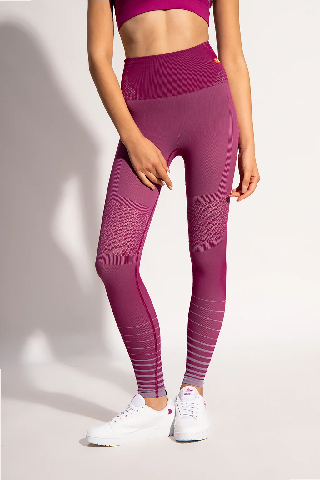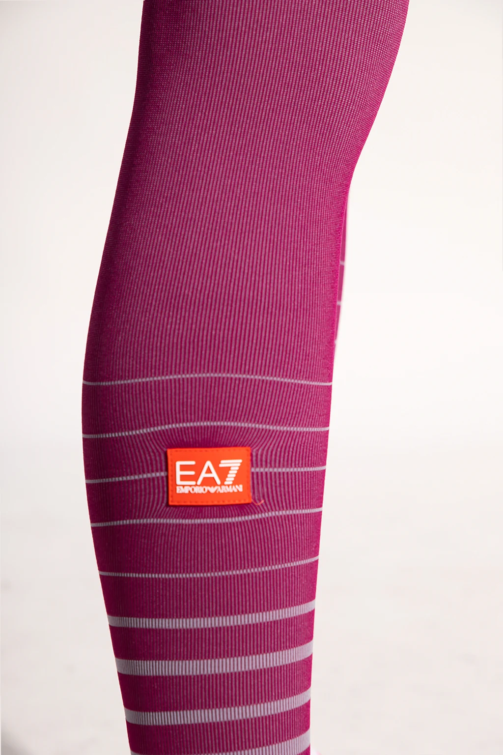 Purple leggings from EA7 Emporio Armani. This pair falls down with tapered legs and is enriched by stitching details and a logo patch in red and white.