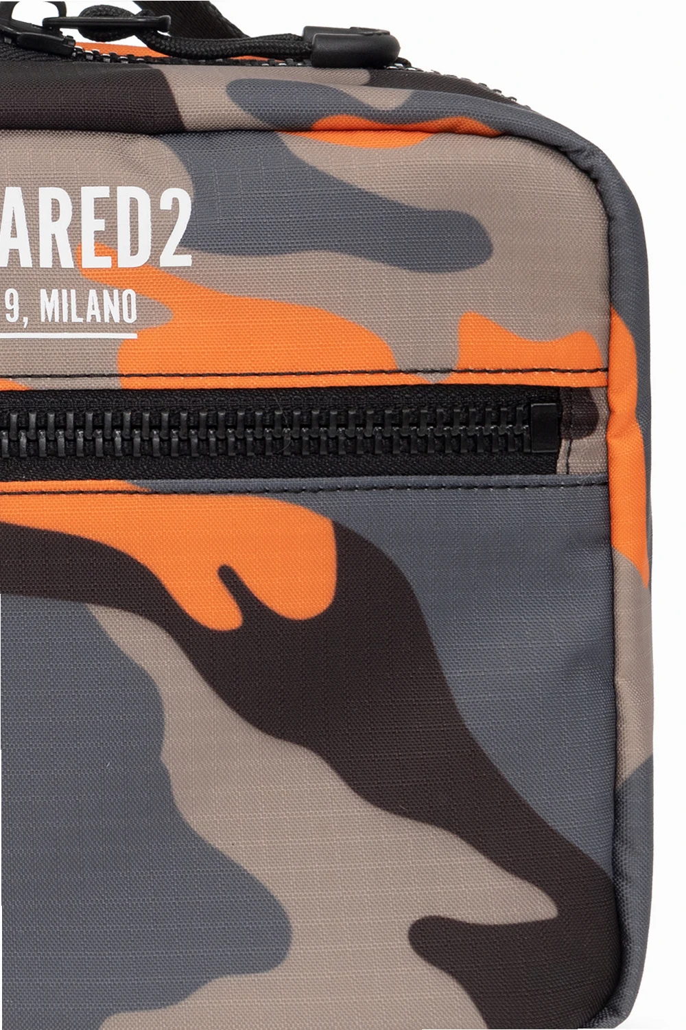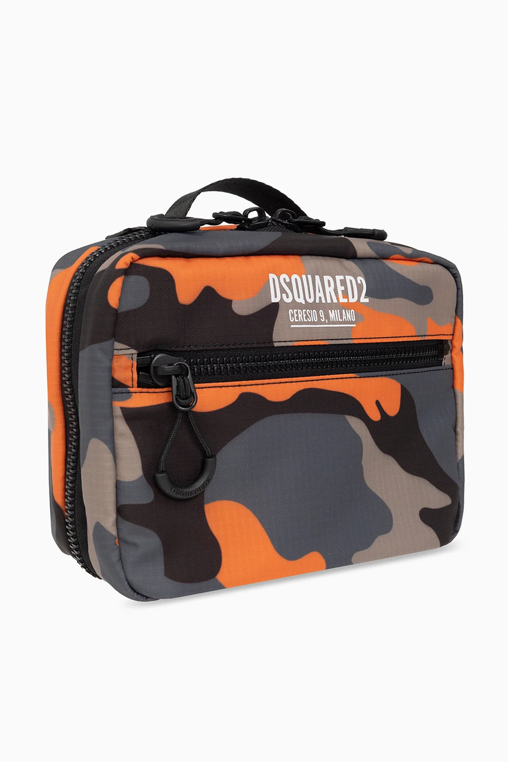 Multicoloured \'Ceresio 9’ pouch from Dsquared2. Crafted from lightweight, waterproof Ripstop fabric with an all-over camo pattern, this design secures with a two-way zip and features a white logo print and a zip pocket on the front, a top handle and two zip pockets and one slip pocket inside.
