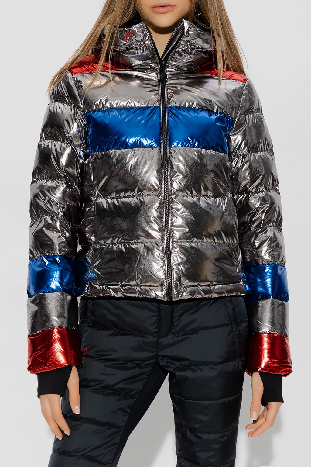 Grey, red and blue ‘Lily’ ski jacket from Perfect Moment. Fastened with a zip, this design features a logo embroidery, two front zip pockets, drawstring hem, internal ski goggles pocket and long sleeves with ribbed cuffs and thumb holes.