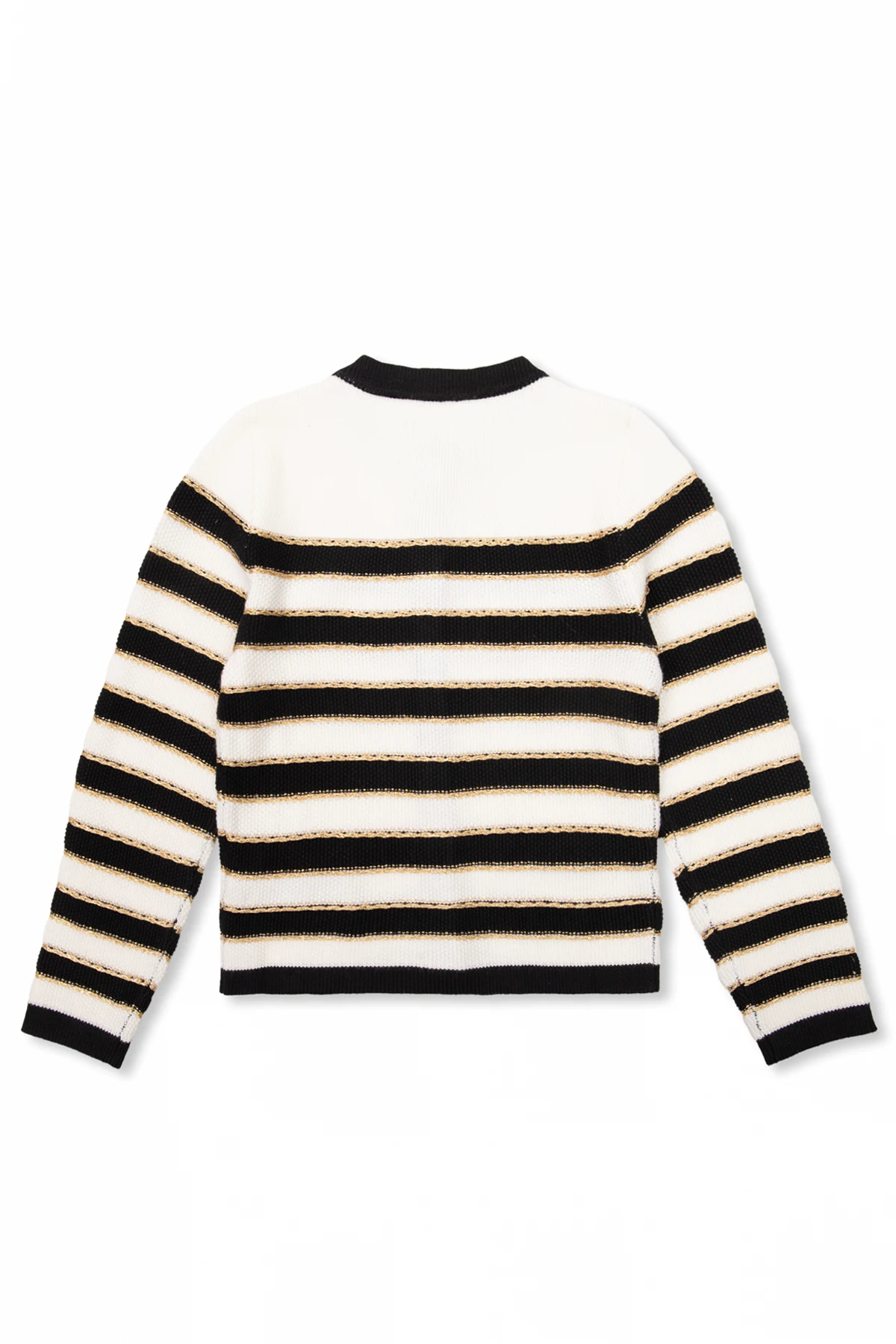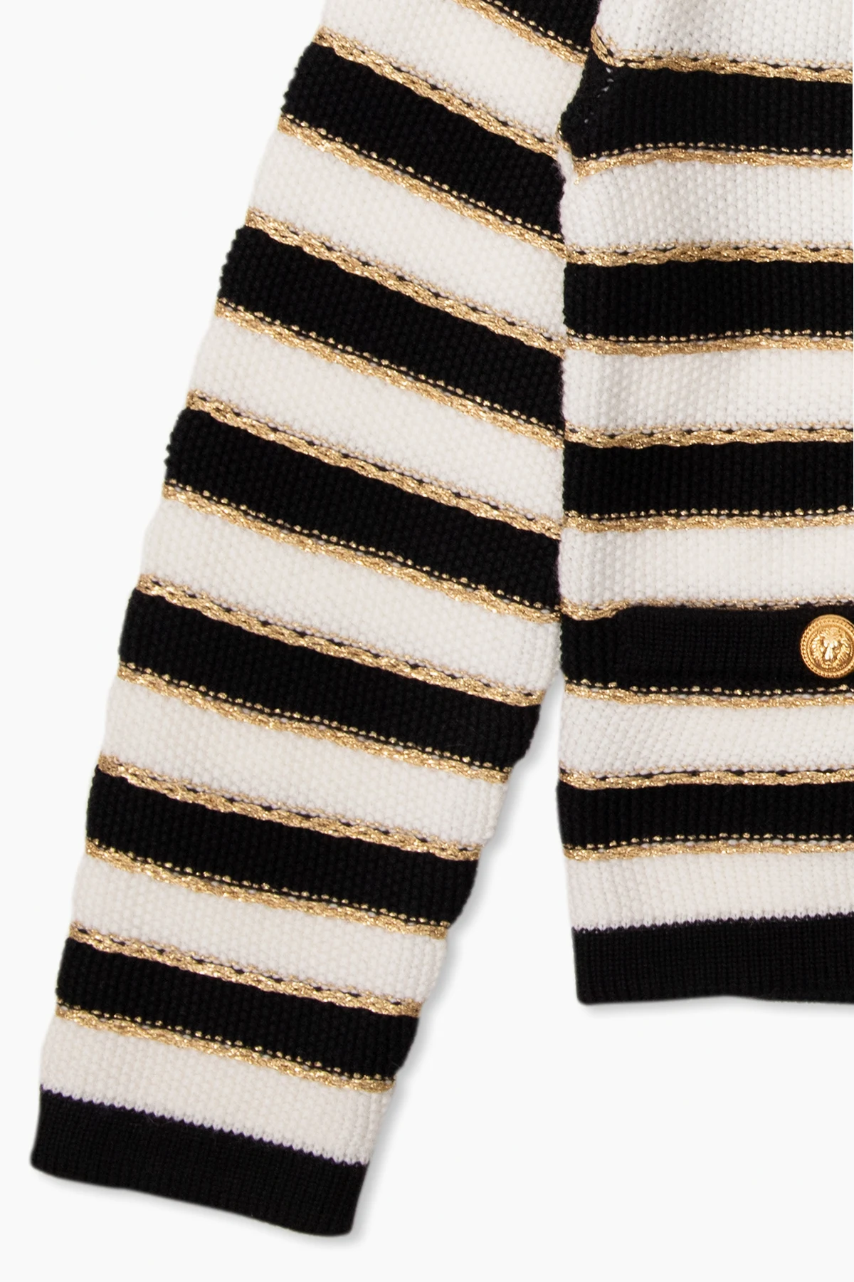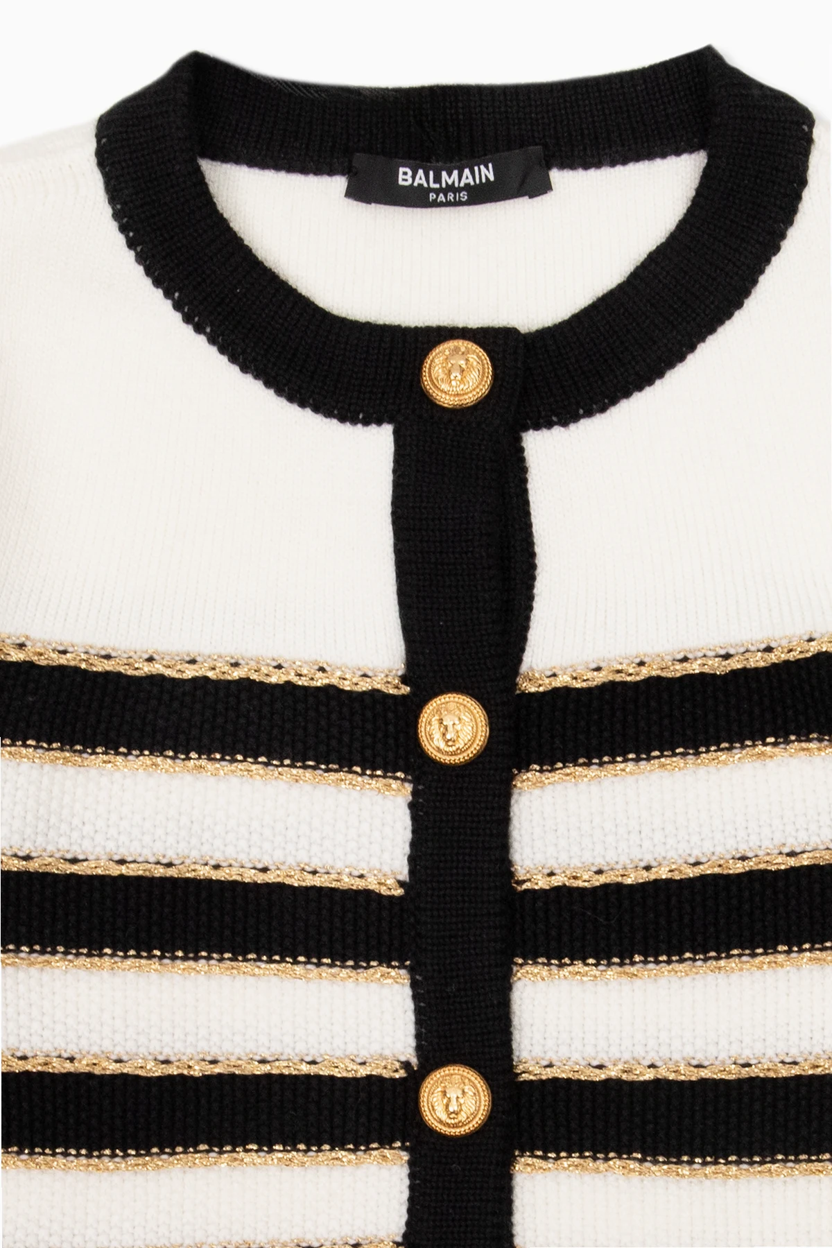 Cream cardigan from Balmain Kids. Made of wool, this style fastens with buttons showcasing the brand\'s signature motif of a lion and features a round neck, black and gold-tone stripes, two decorative pockets, removable shoulder padding and long sleeves.