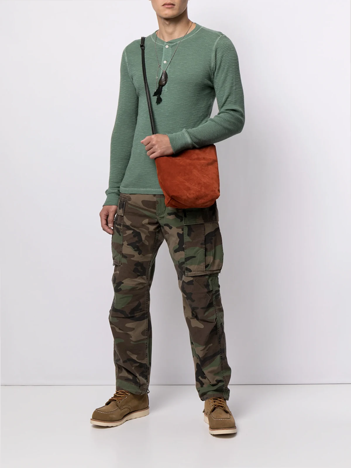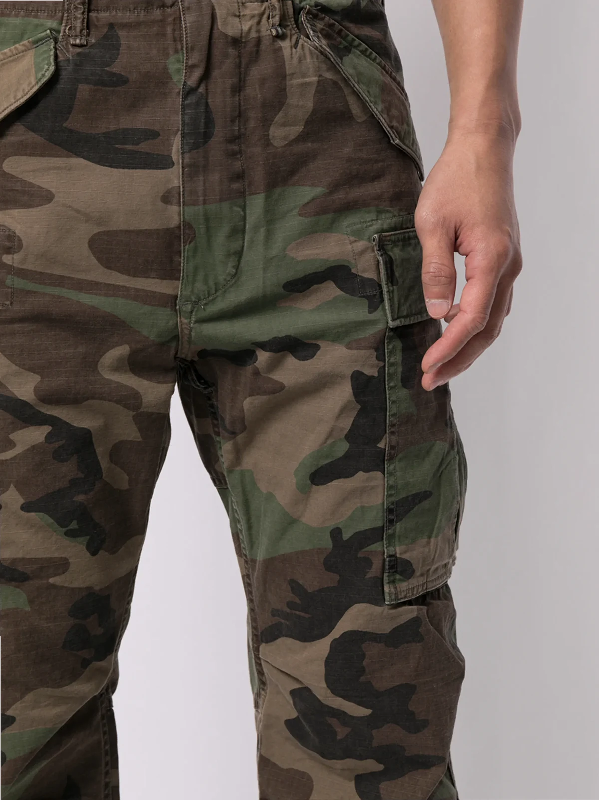 woodland green cotton camouflage pattern front button fastening belt loops front flap pockets two rear flap pockets