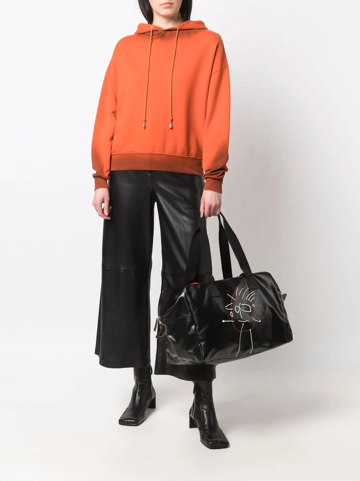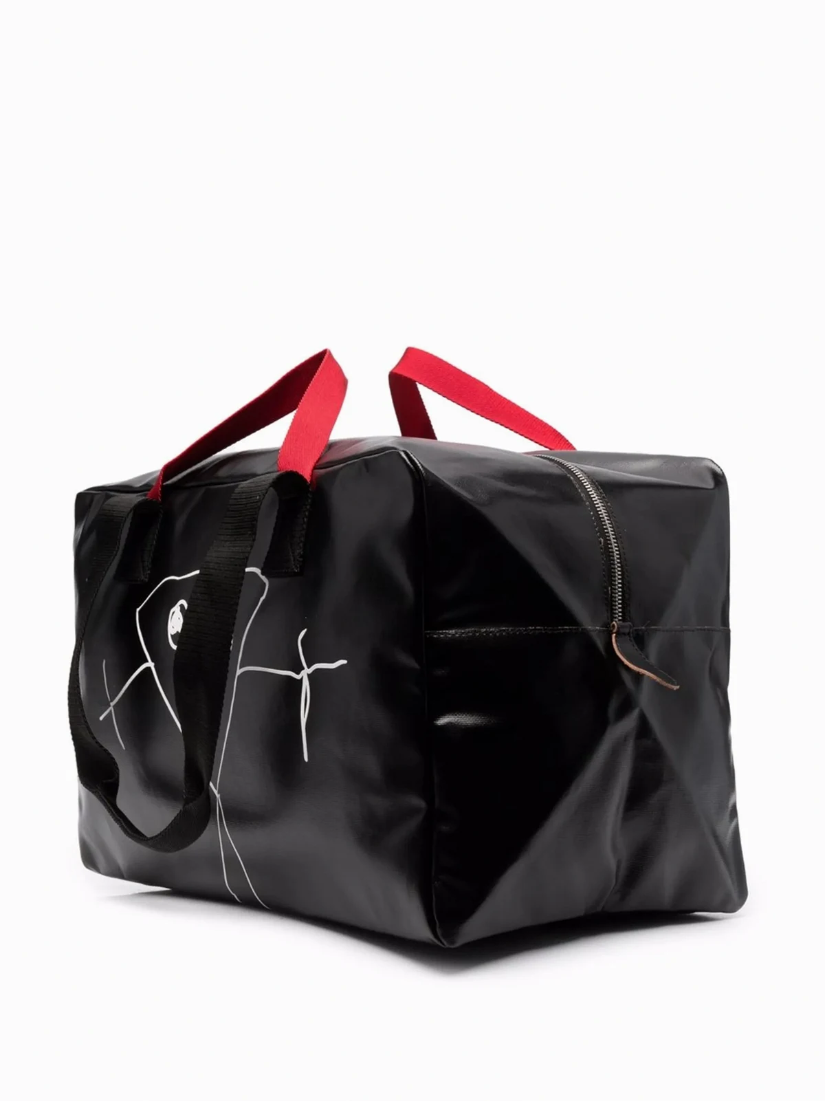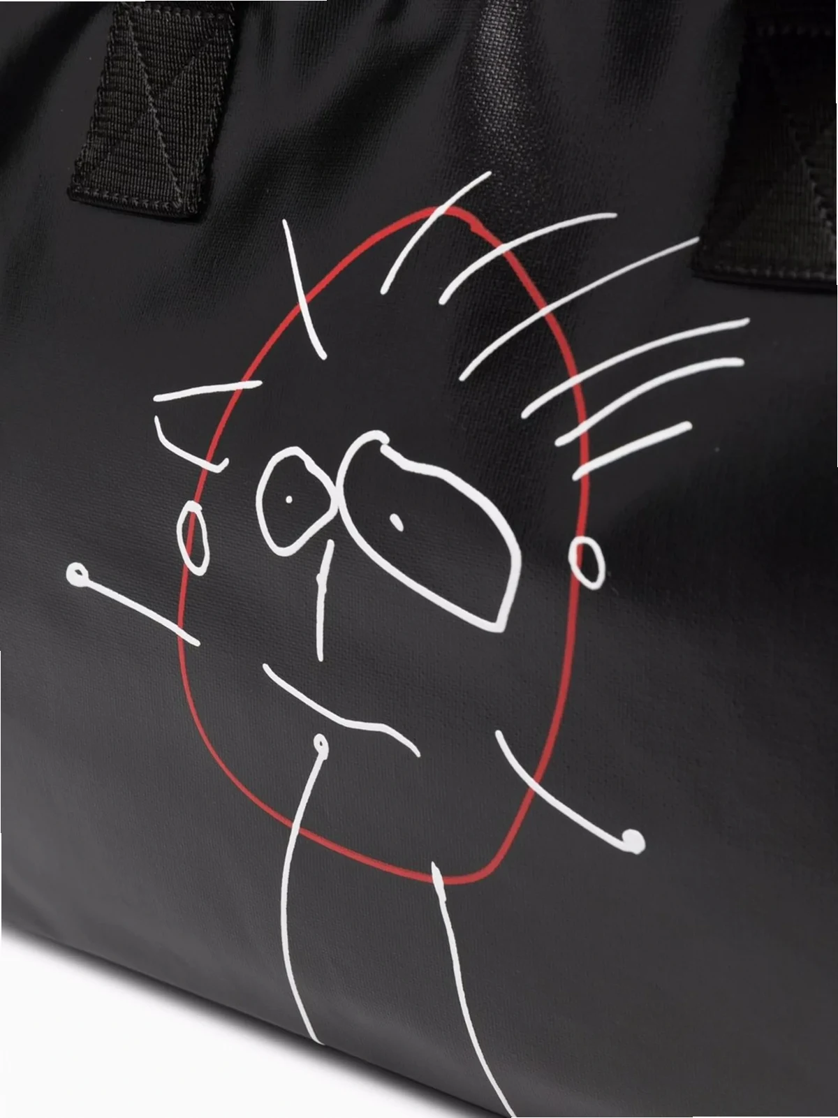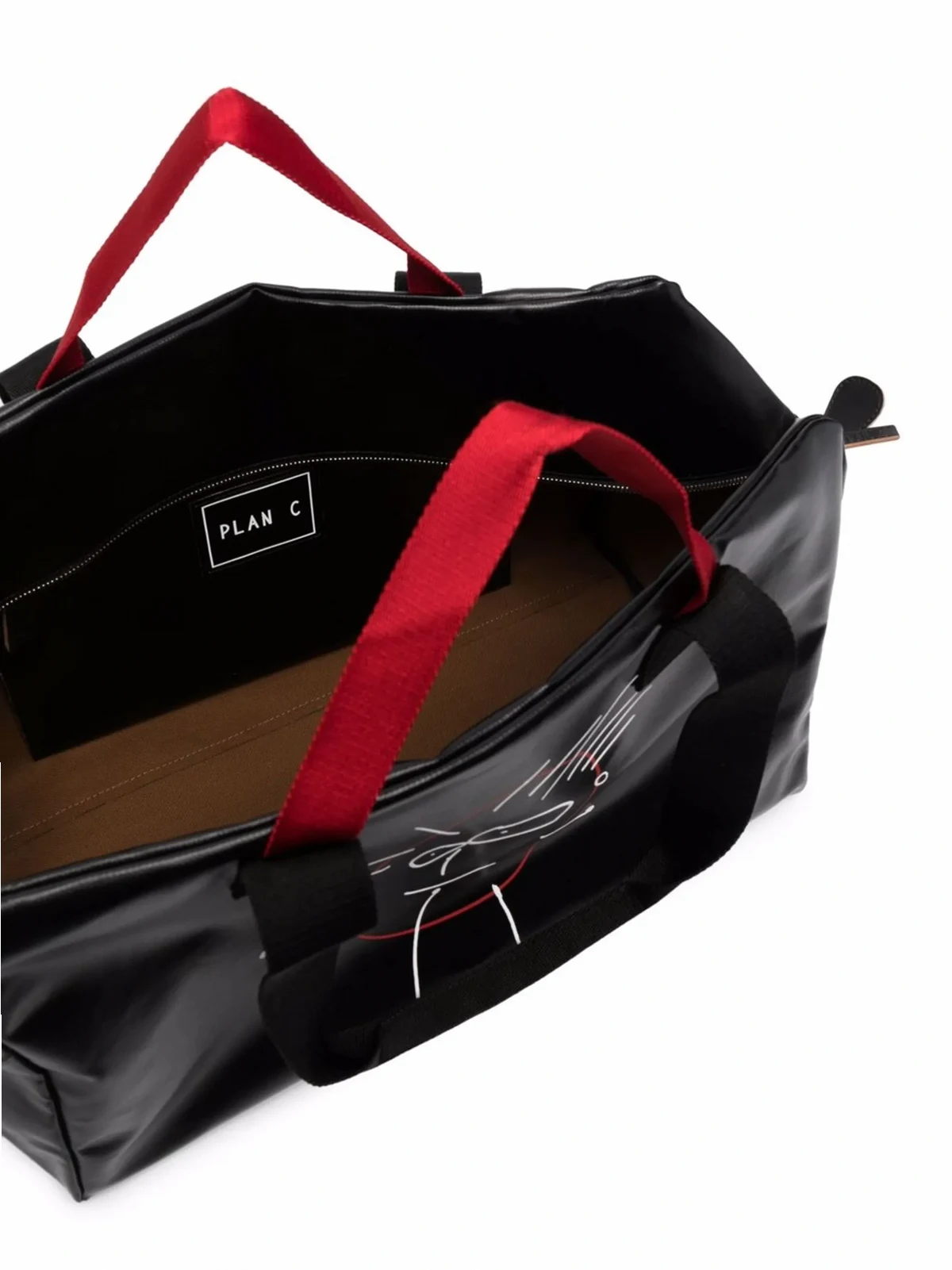 black/red cotton blend coated finish graphic print to the front graphic print to the rear two top handles two long top handles top zip fastening main compartment internal zip-fastening pocket
