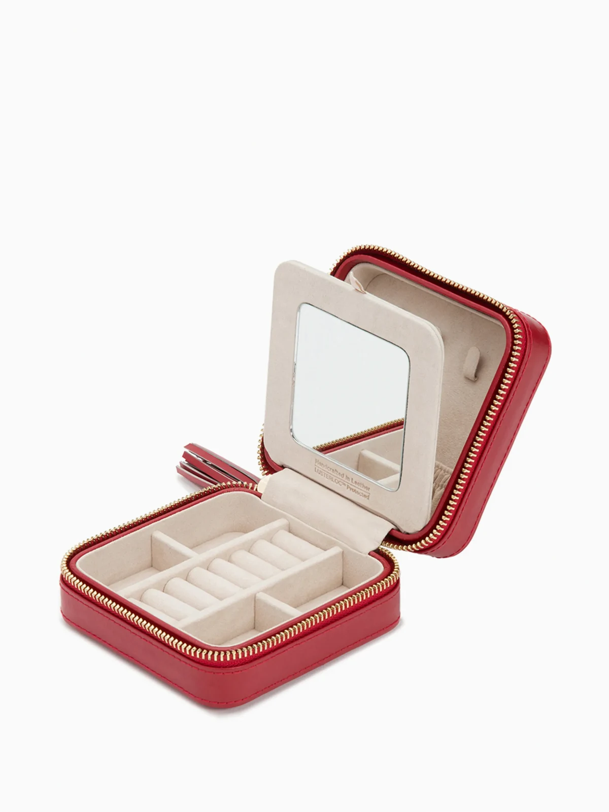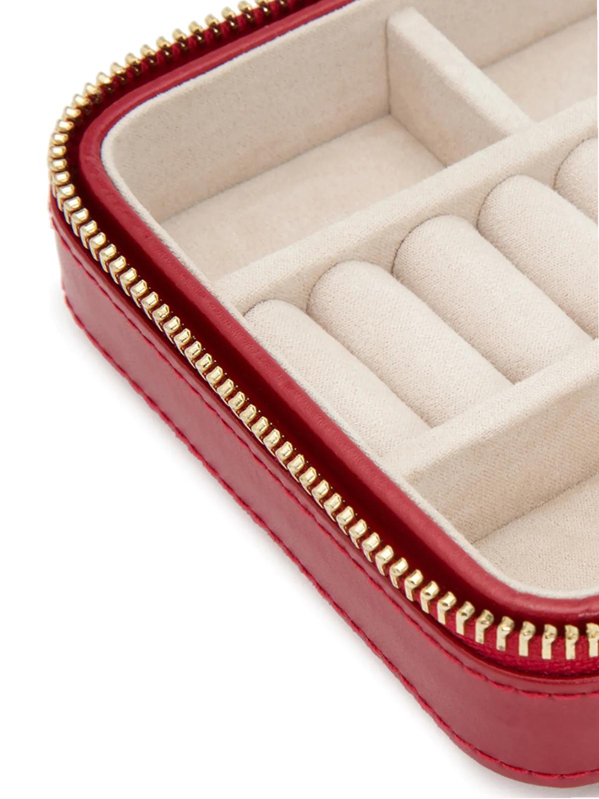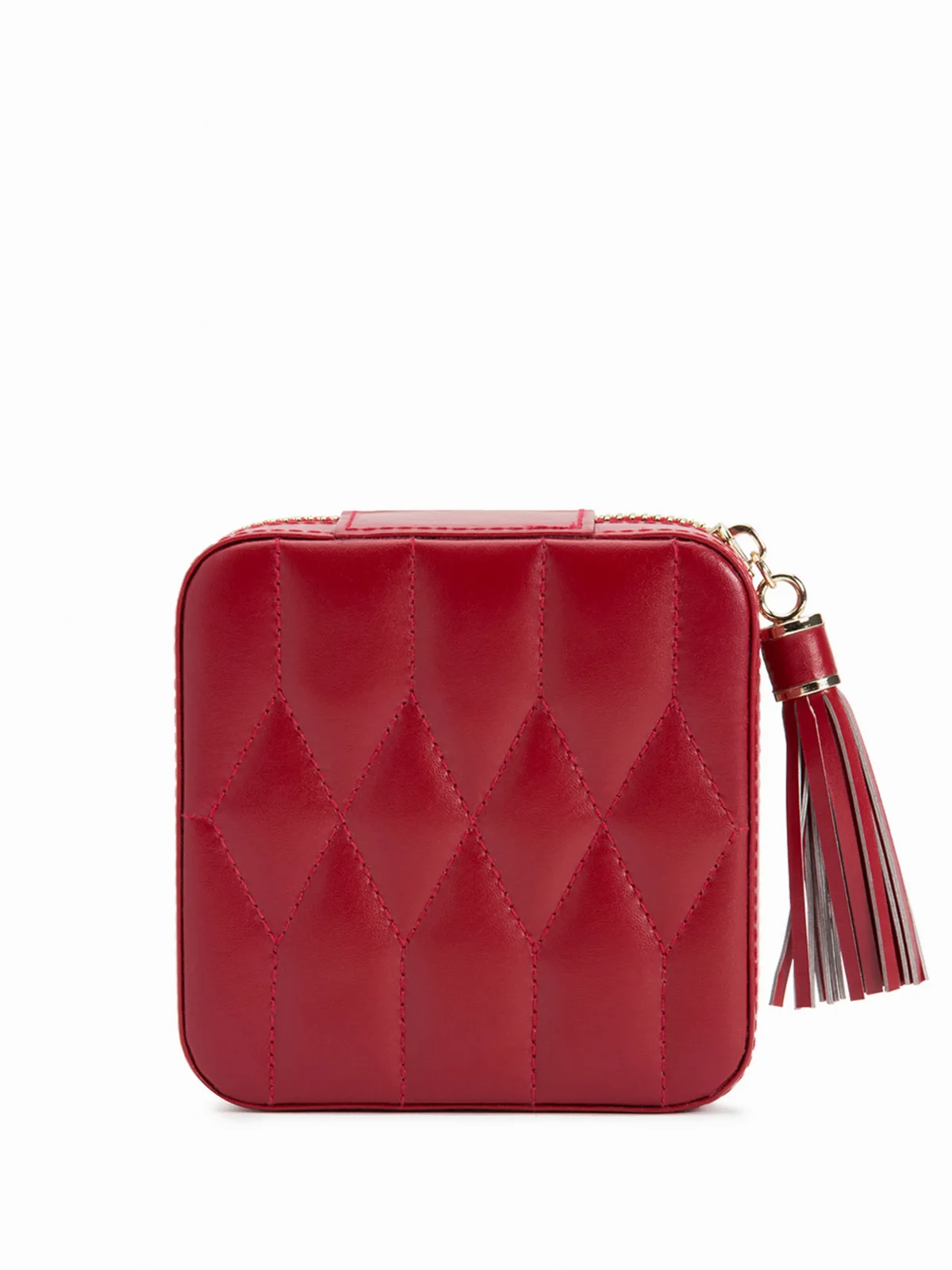 Red leather quilted jewellery box from WOLF featuring an all around zip fastening, a hanging tassel and multiple interior compartments.