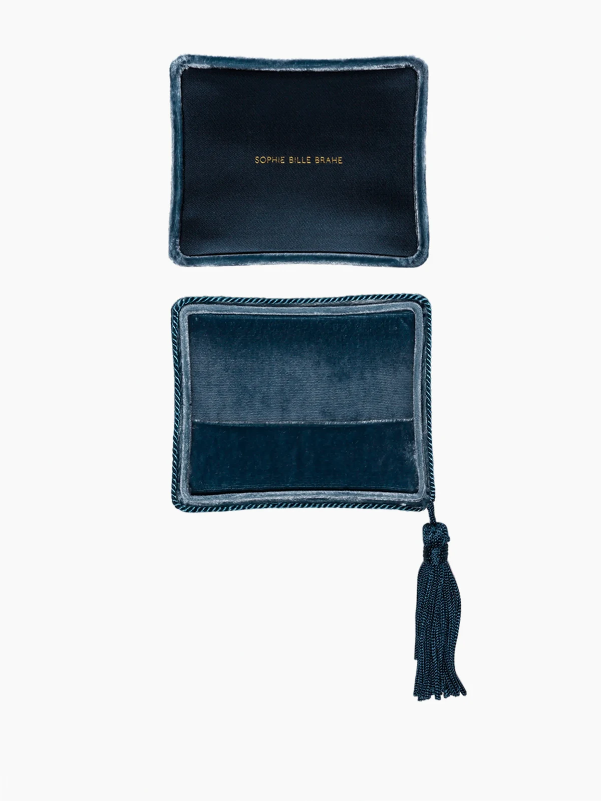 This blue Sophie Bille Brahe velvet jewellery box features a square shape, internal gold tone logo stamp and a tassel embellishment zip. Only your most precious pieces will go in this Sophie Bille Brahe box and all the while you'll be singing 'She wore Blue Velvet.'