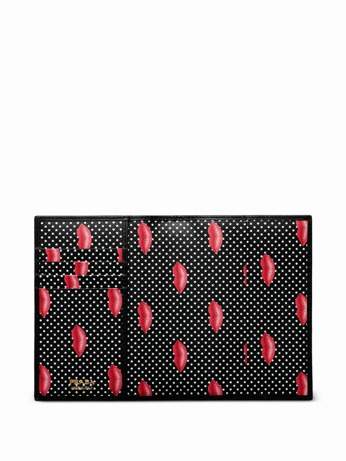 This passport holder with surprising details is made of Saffiano leather with a sleek design animated by the iconic Lips print that embellishes the interior of the accessory.