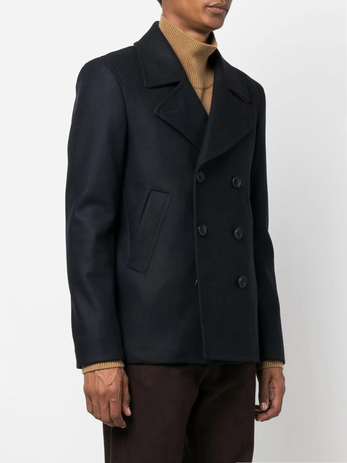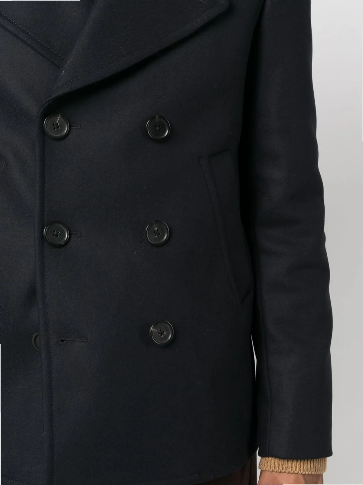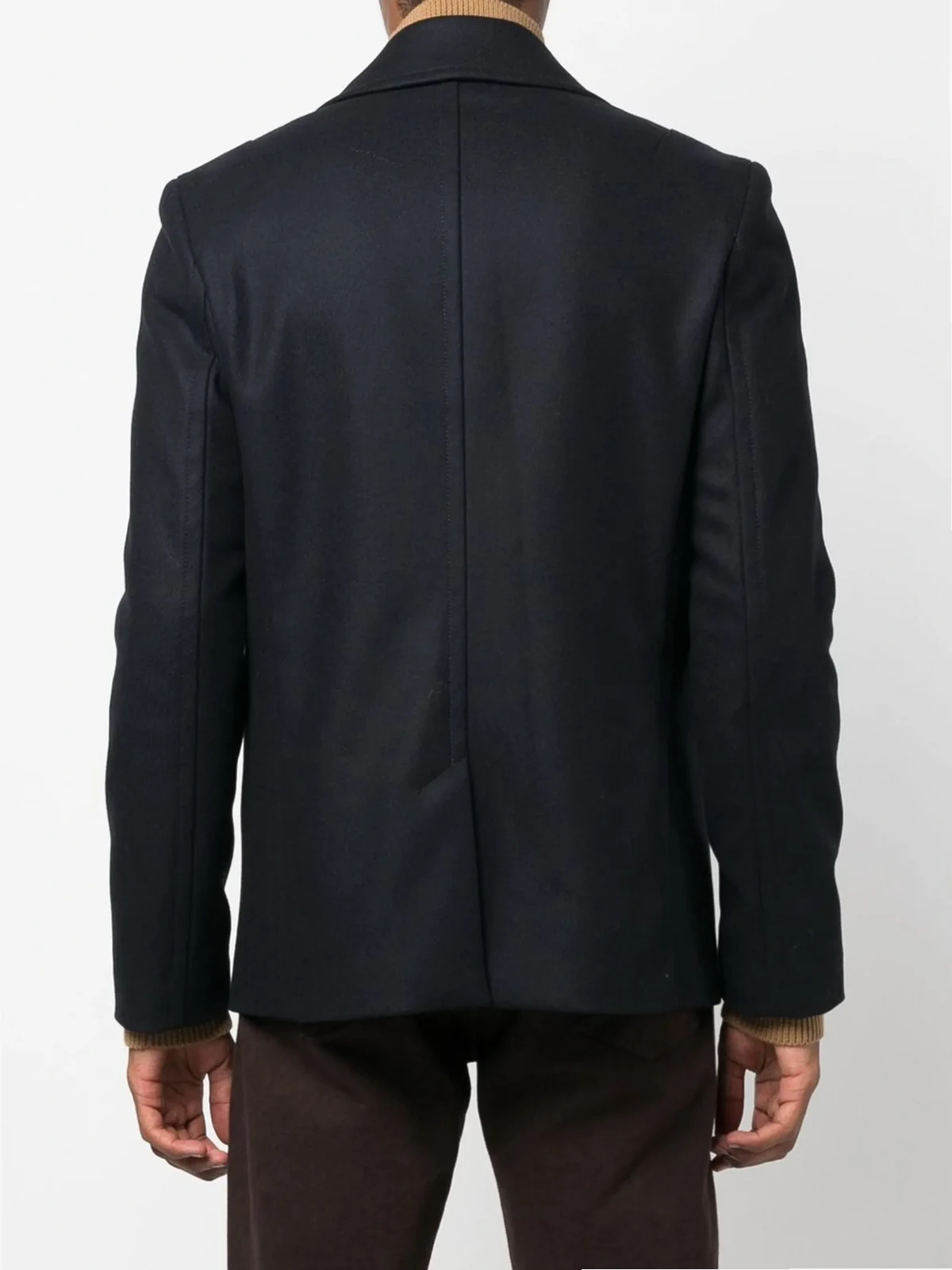 dark blue wool-cashmere blend classic lapels double-breasted button fastening long sleeves two front welt pockets