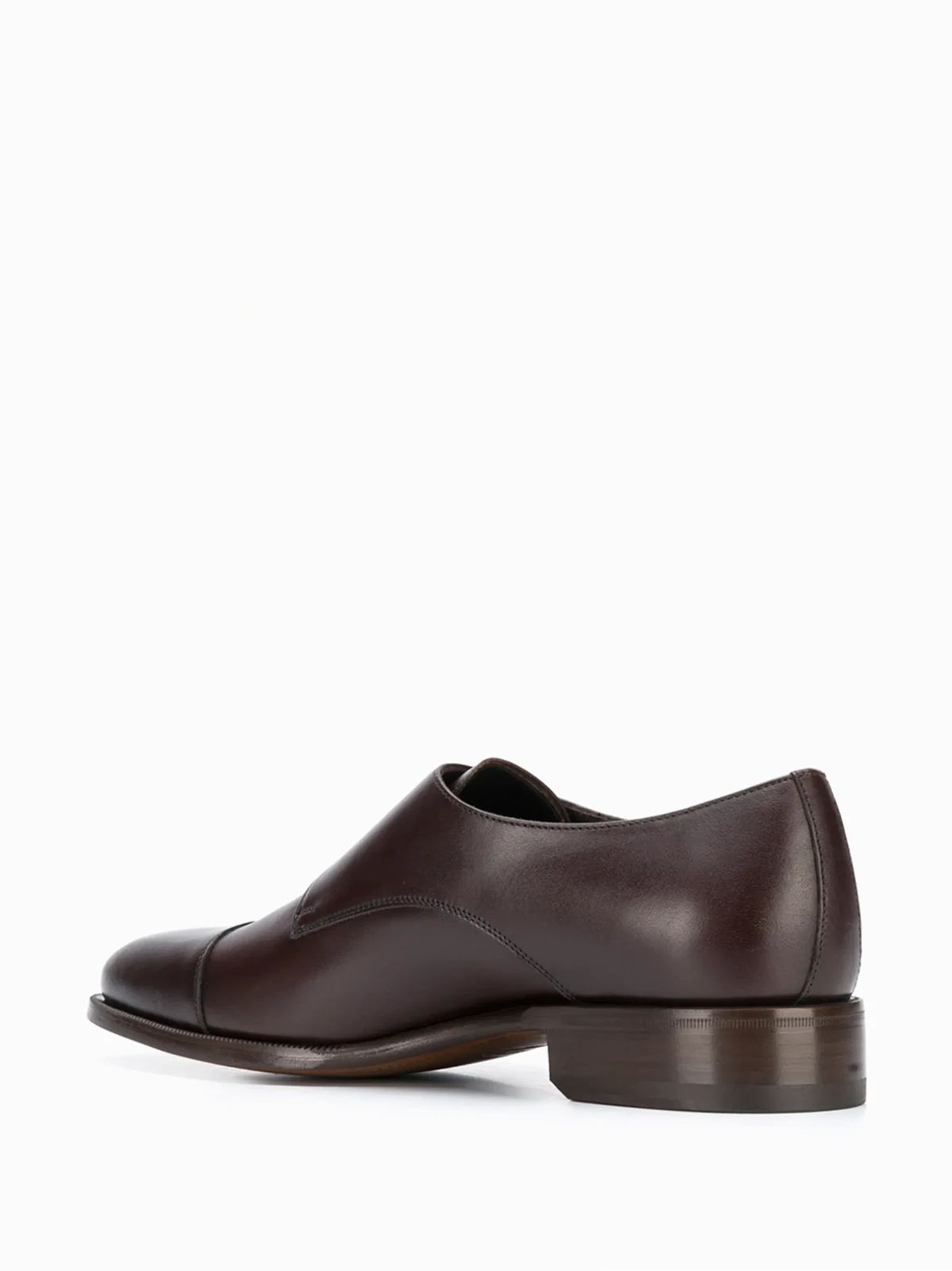 Brown leather classic monk shoes from Scarosso featuring a double-buckled flap, an almond toe and a low stacked heel.