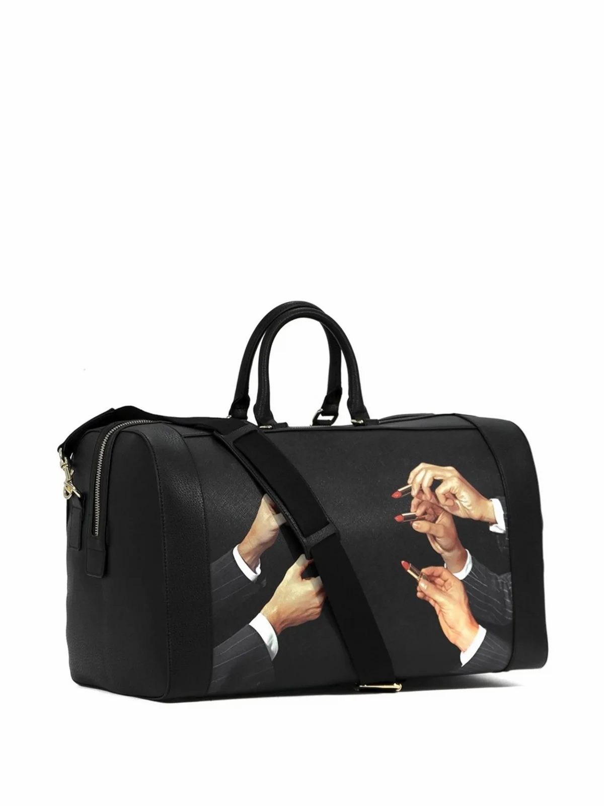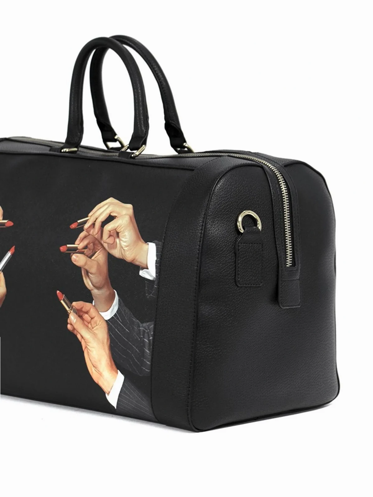 black/multicolour faux leather graphic print to the front top zip fastening two top handles single shoulder strap main compartment