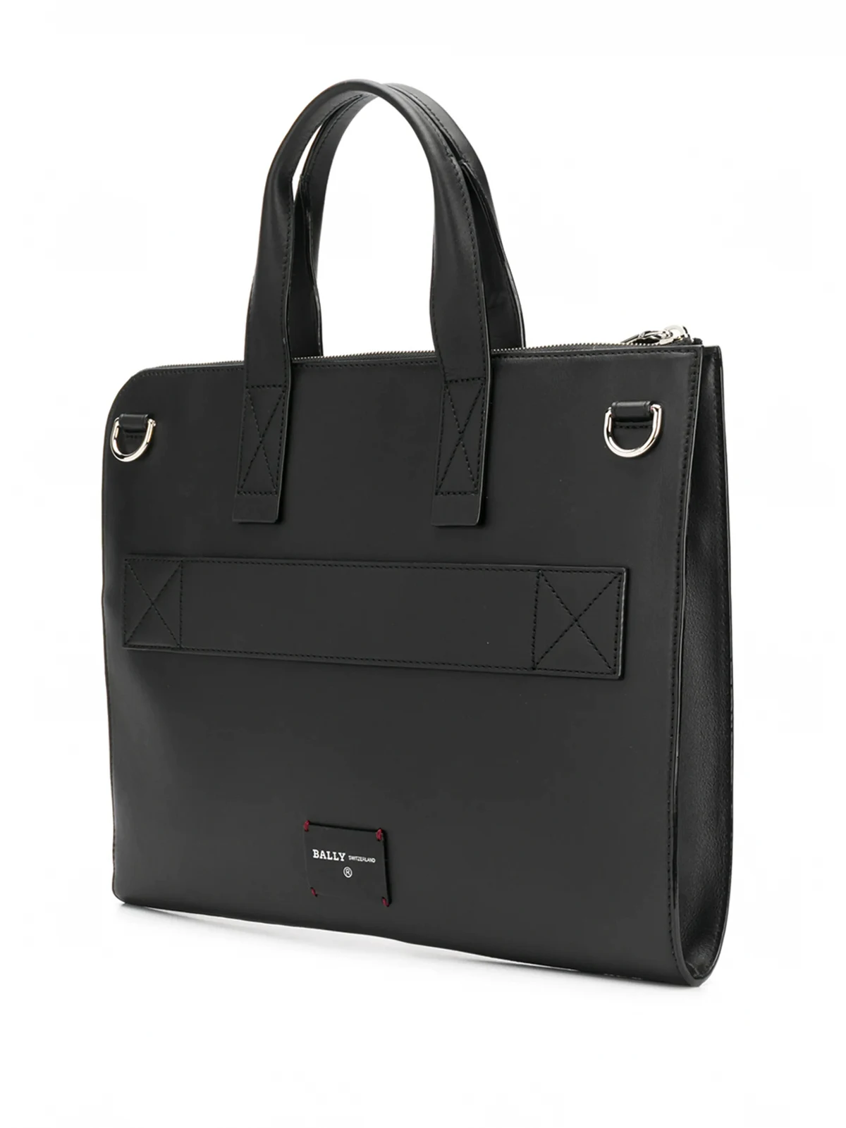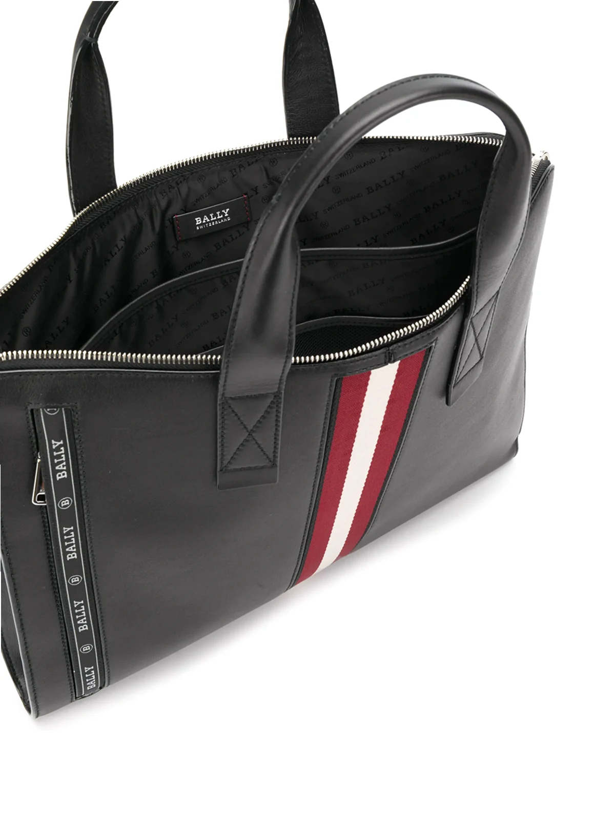 Black leather Henri slim briefcase from Bally featuring an embroidered logo to the front, a striped pattern, top handles, a top zip fastening, a shoulder strap and a rear logo stamp.