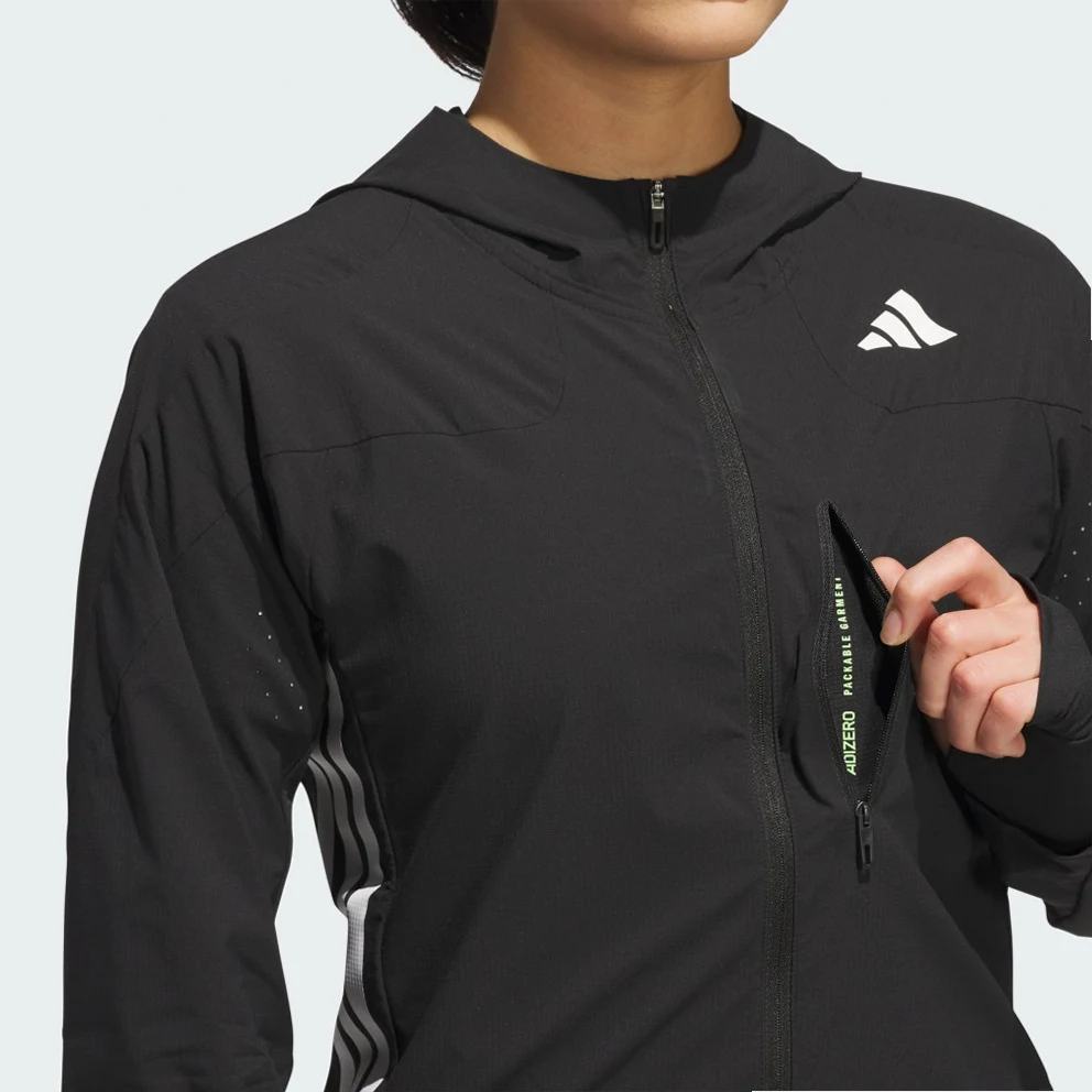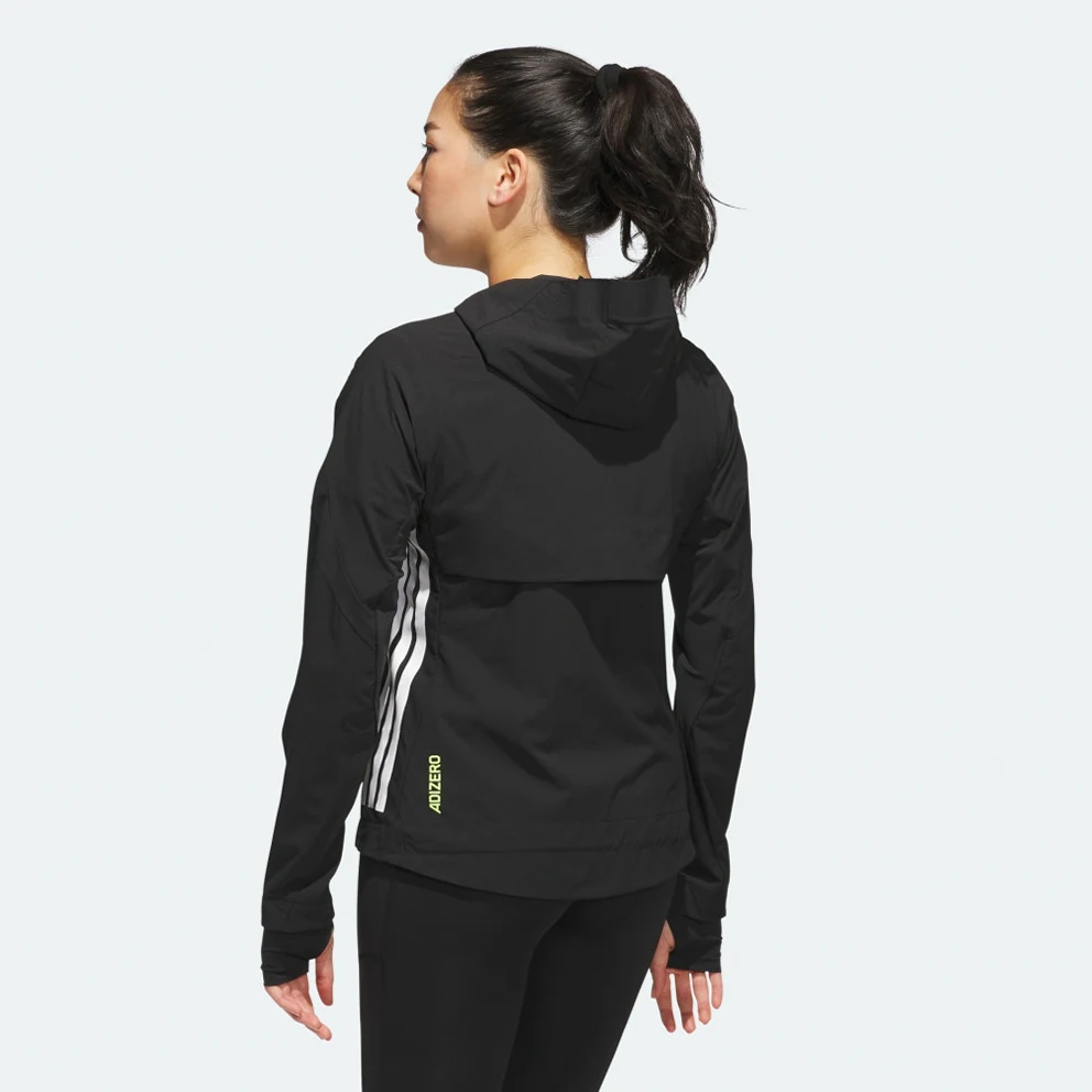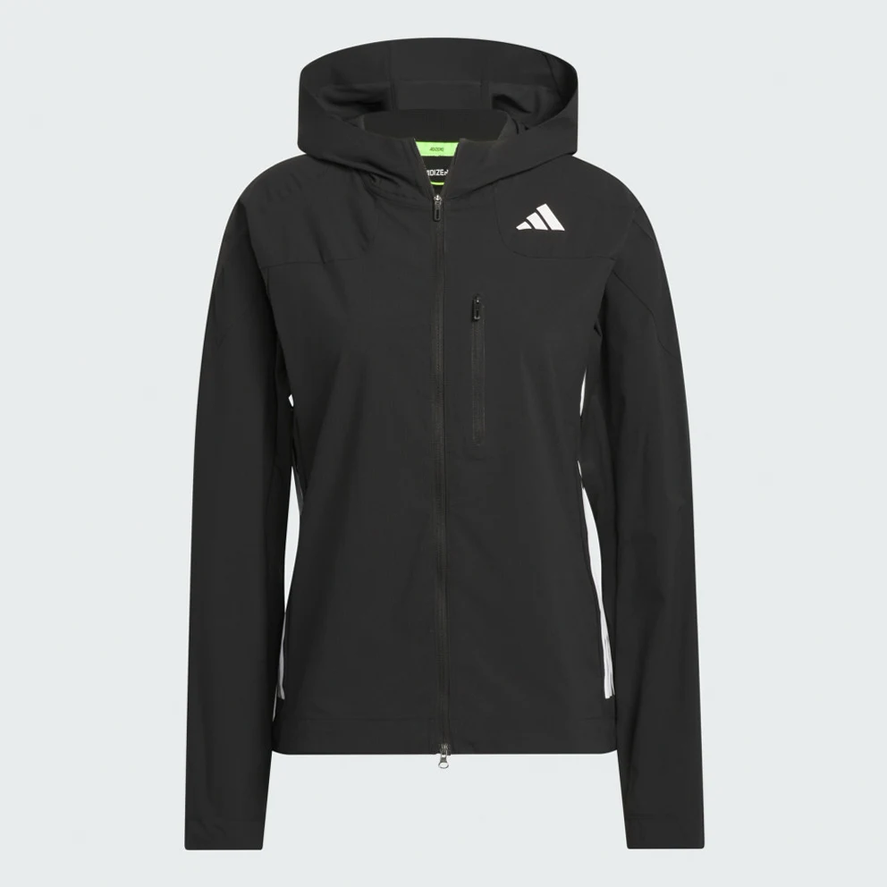 Zip up and keep training in cooler weather. With a slim, aerodynamic fit, built-in vents and wind resistance, this adidas running jacket is ready to help you make breakthroughs in your running. You can customise the fit with adjustable bungees at the hood and hem.This product is made with 100% recycled materials. By reusing materials that have already been created, adidas help to reduce waste and our reliance on finite resources and reduce the footprint of the products adidas make.
