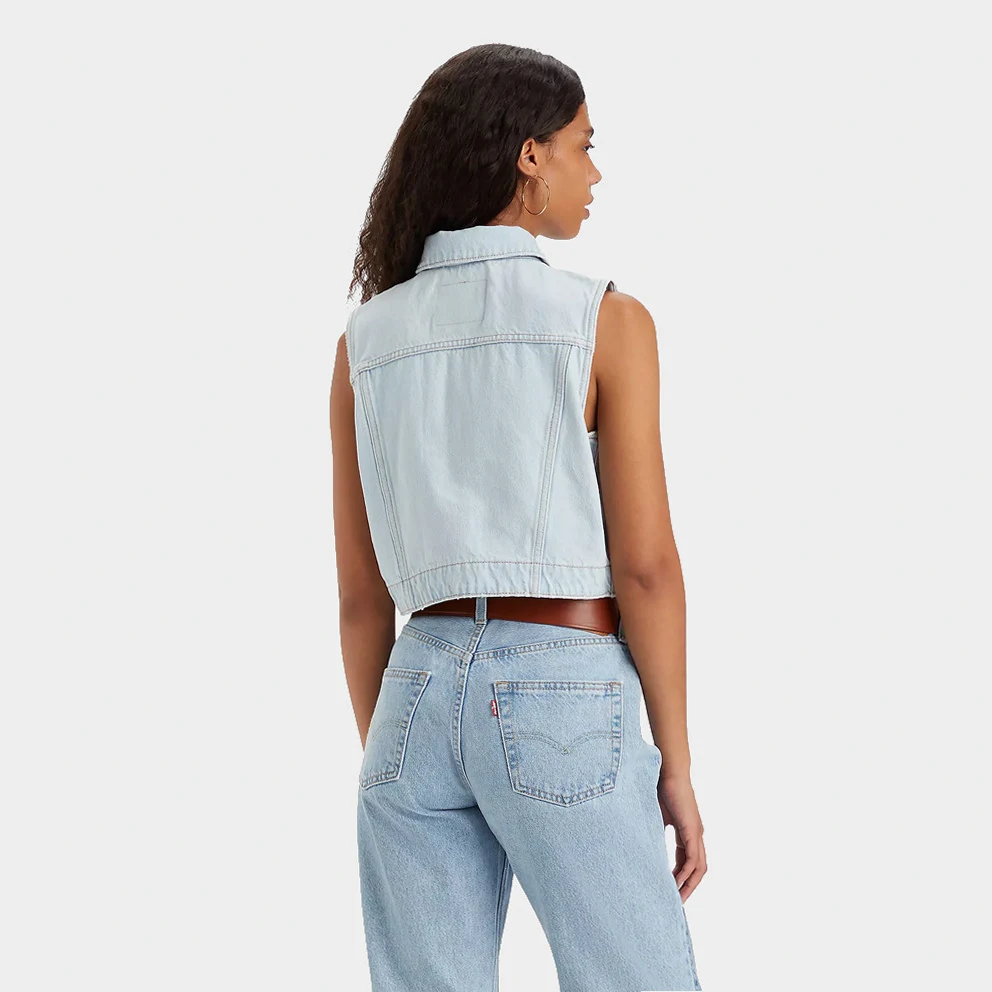 Stay stylish and always ready for any urban adventure with this fashionable cropped denim vest from Levis's. It has a full-length button closure and vertical pockets for storing small items give it a unique character. Combine it with your favorite t-shirts, shirts and jeans for unique looks.