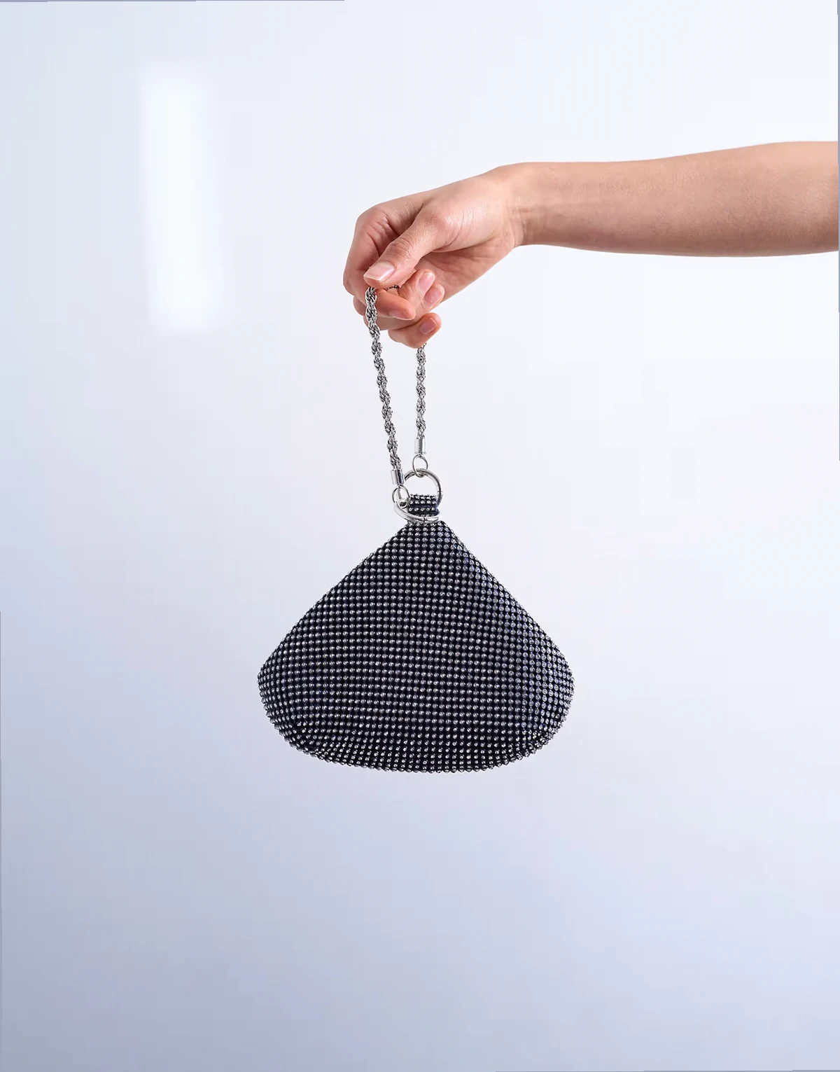 This bag is crafted from a woven fabric embellished with a diamante-studded mesh. It features a twisted chain strap, a magnetic clasp and a zip fastening to close.