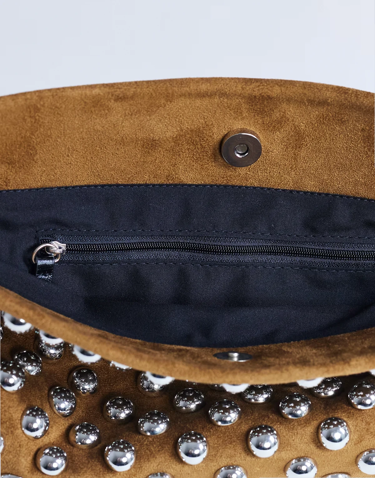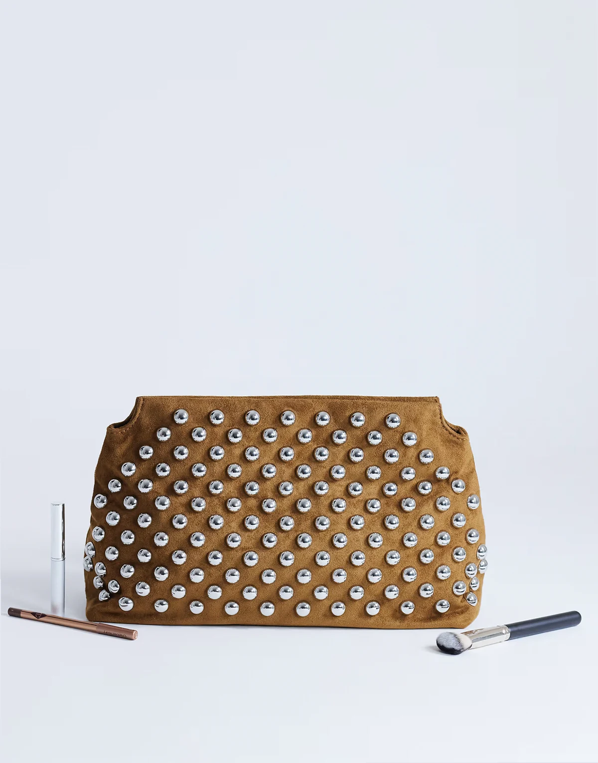 The Gideon bag is a clutch style complete with notch accents to the sides. It fastens via a magnetic clasp and features a zipped internal pocket. This style is crafted from soft, textured fabric complete with silver-tone studs. Styled with other products. Each item sold separately