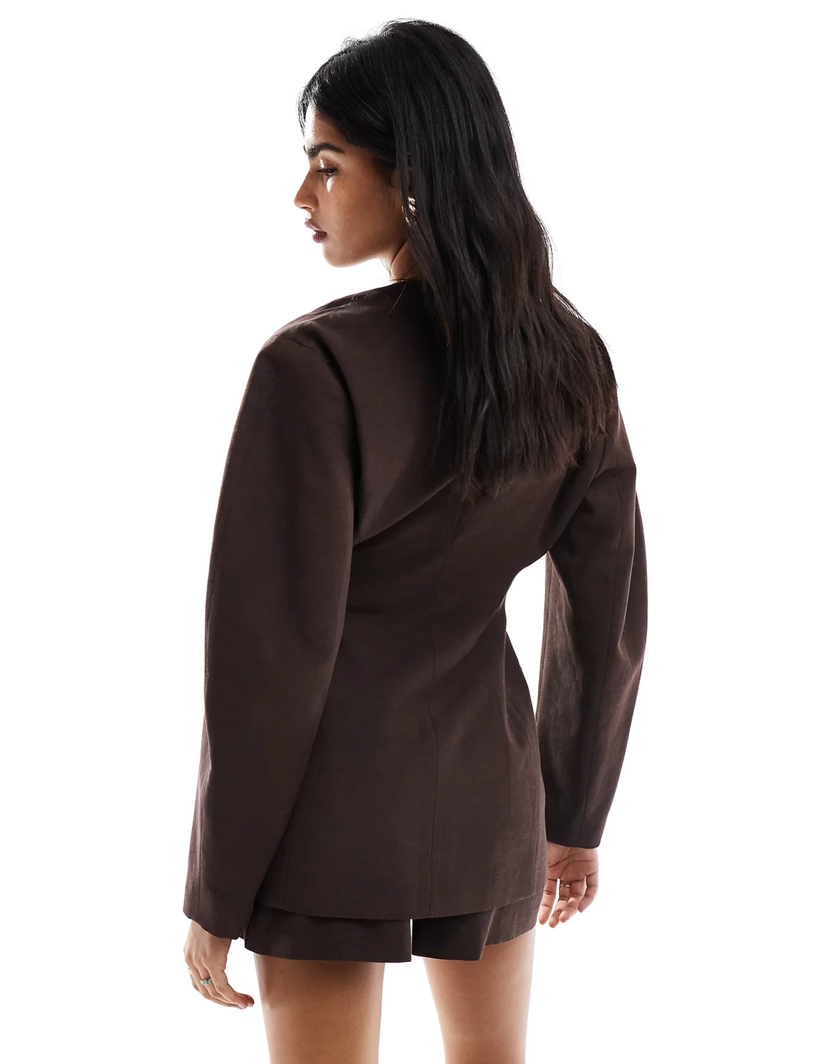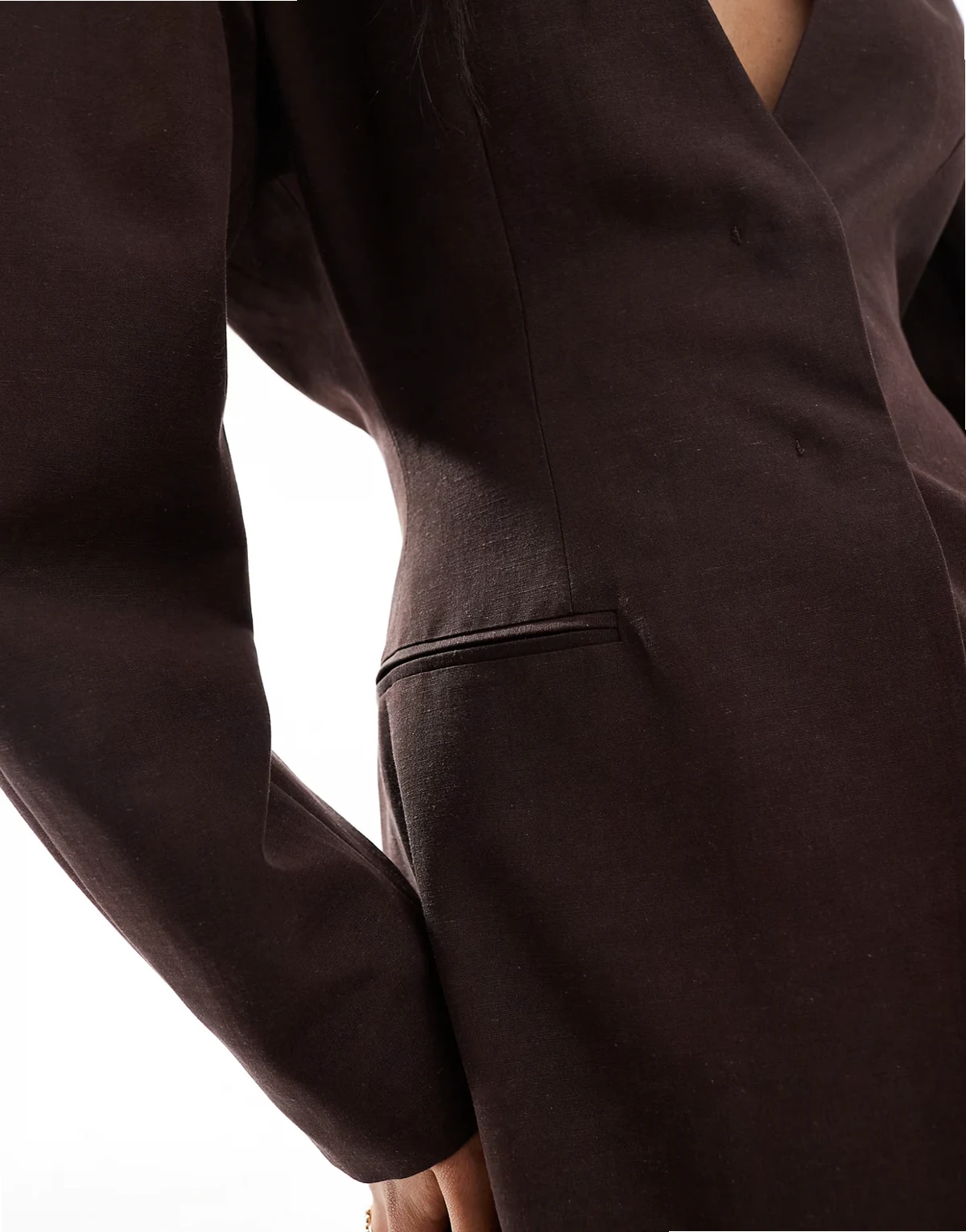 ASOS DESIGN linen blend cinch collarless blazer in chocolate