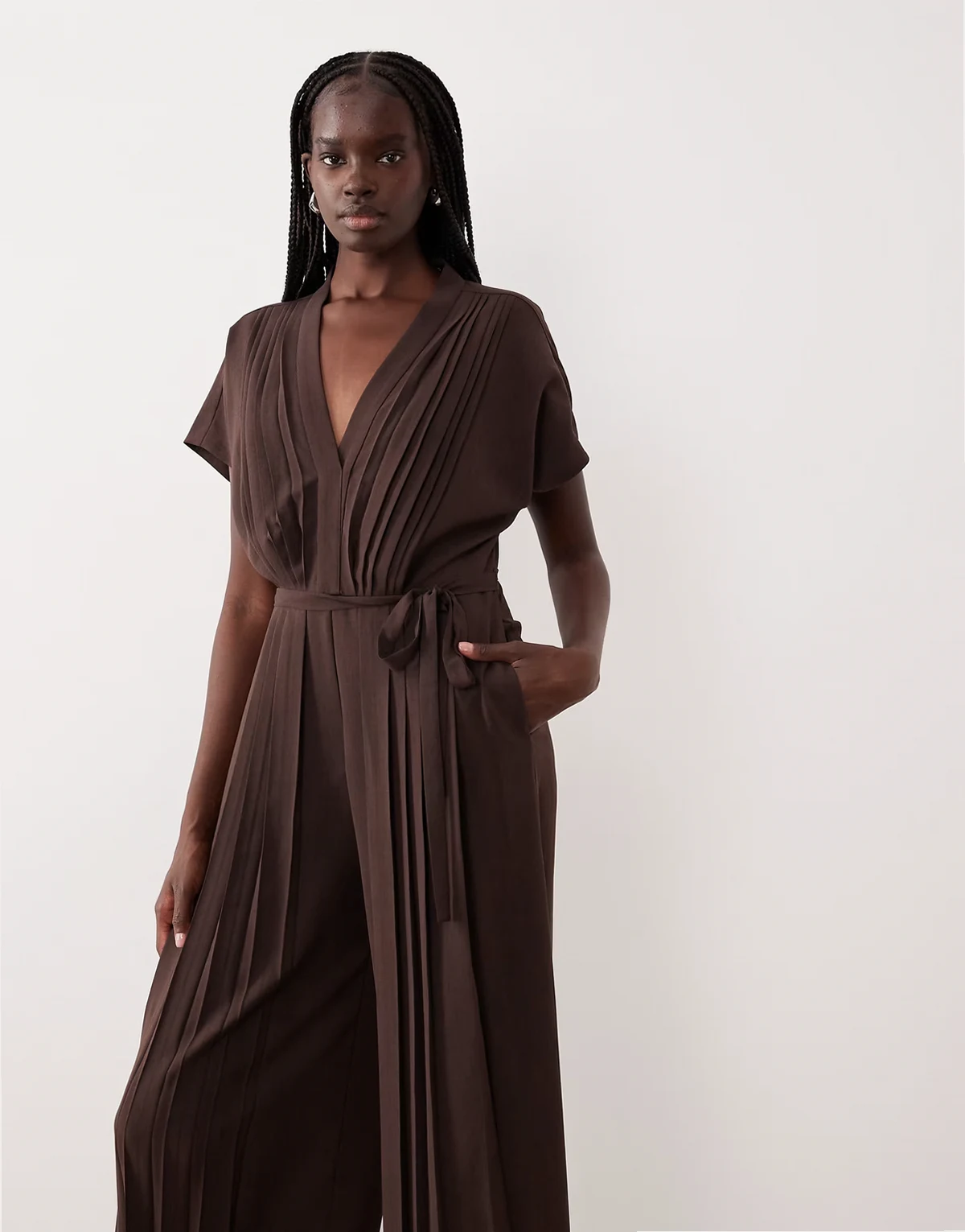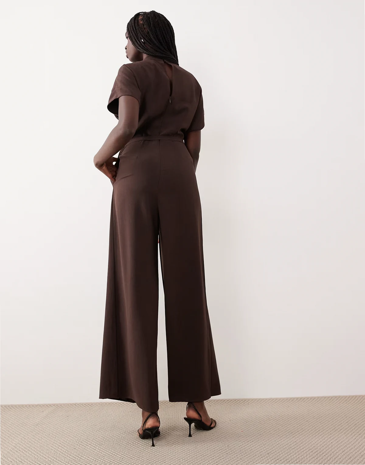 Mango pleat detail short sleeve jumpsuit in chocolate