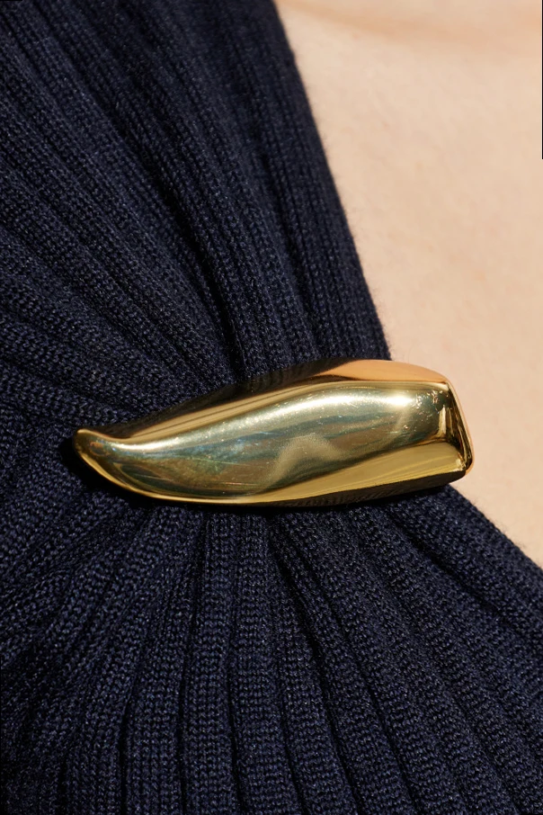 Luxuriously knitted from sumptuous cashmere and silk , the classic vertical rib texture accentuates and visually elongates your figure. A distinctive wide V-neckline is adorned with two lavish, sculptural gold-tone clasps, imparting a sense of refined extravagance without any overt branding. This piece is a unique statement of elevated taste and sophisticated distinction.