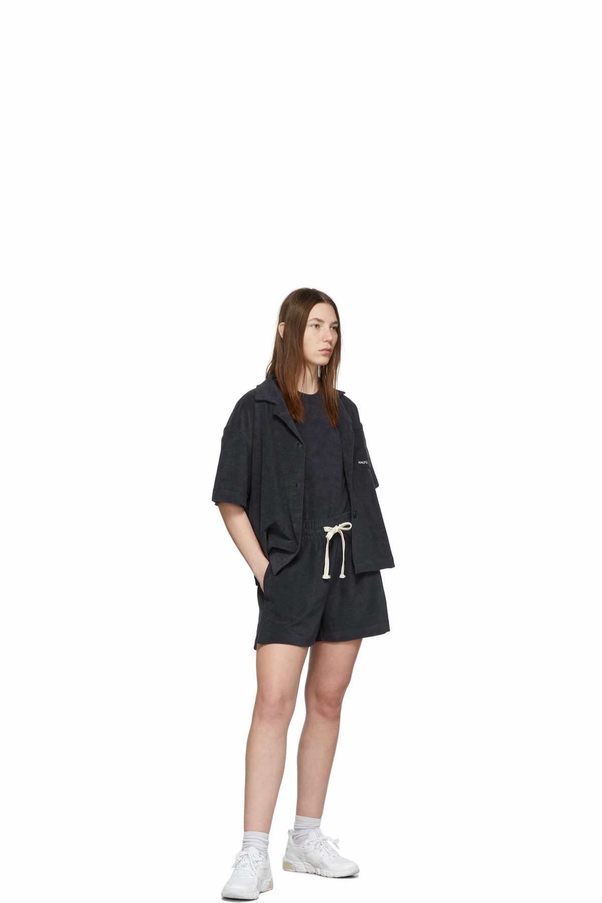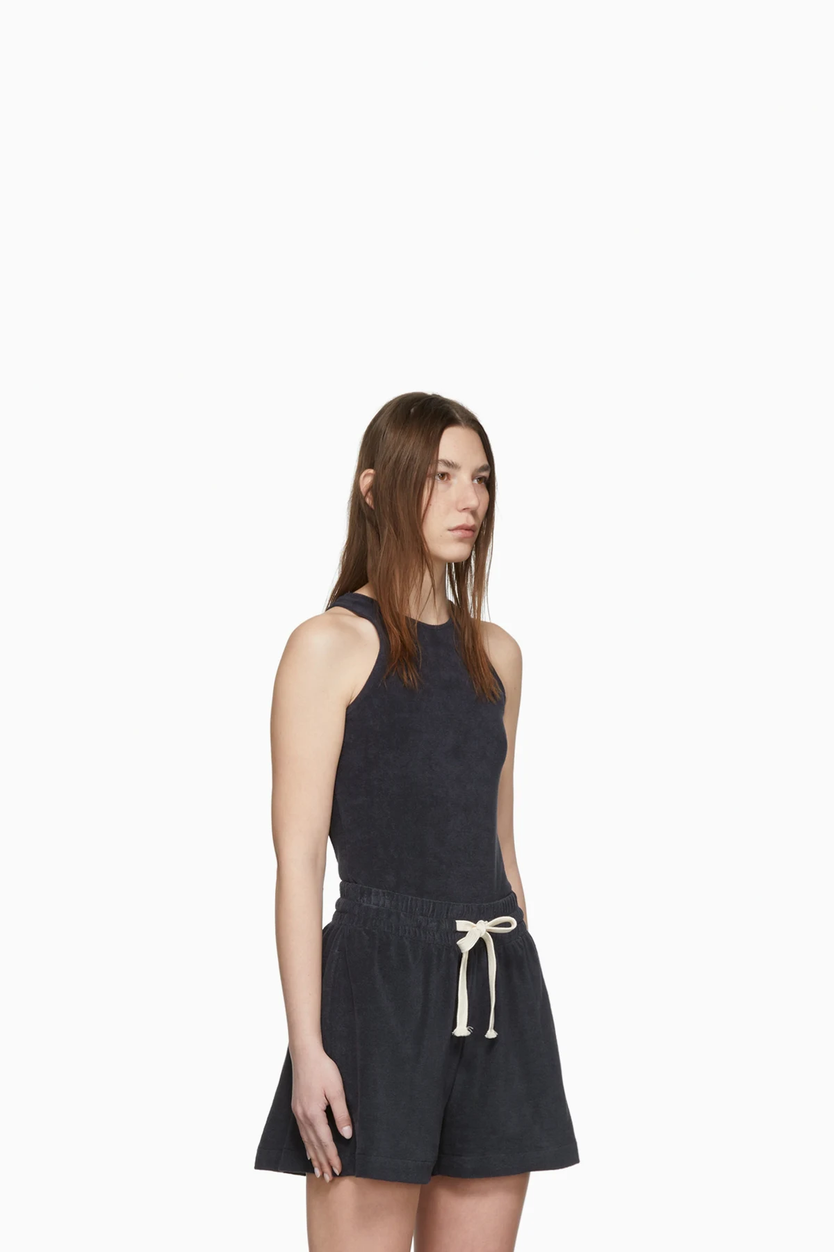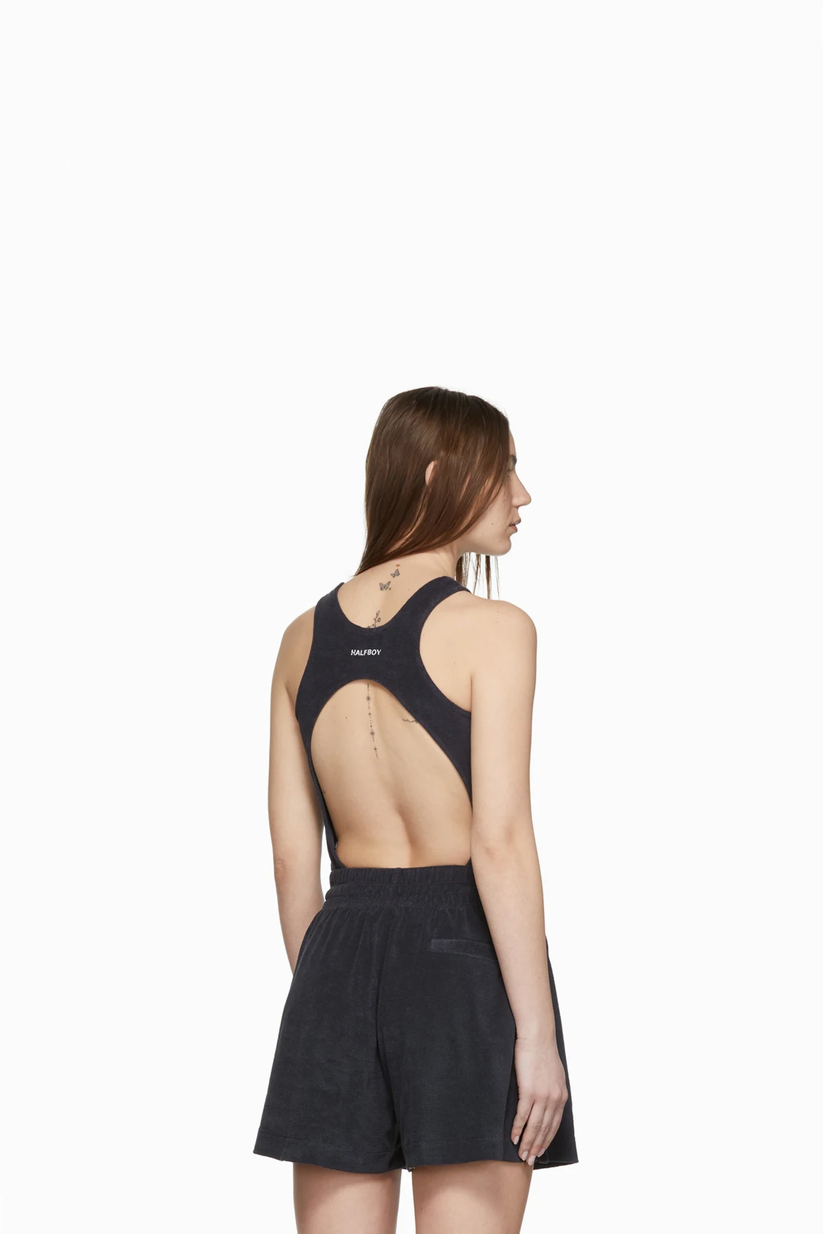 Sleeveless cotton and nylon-blend terrycloth bodysuit in navy. Logo embroidered in white at back collar.