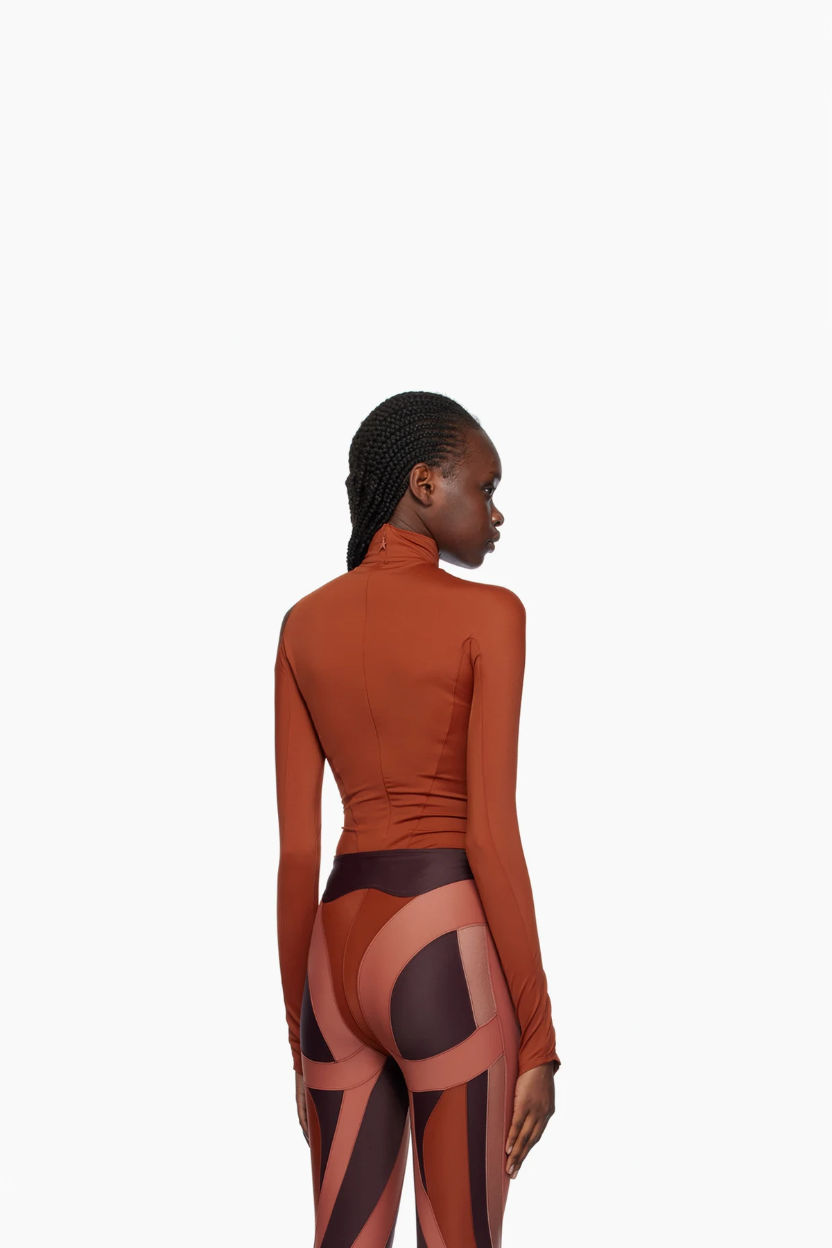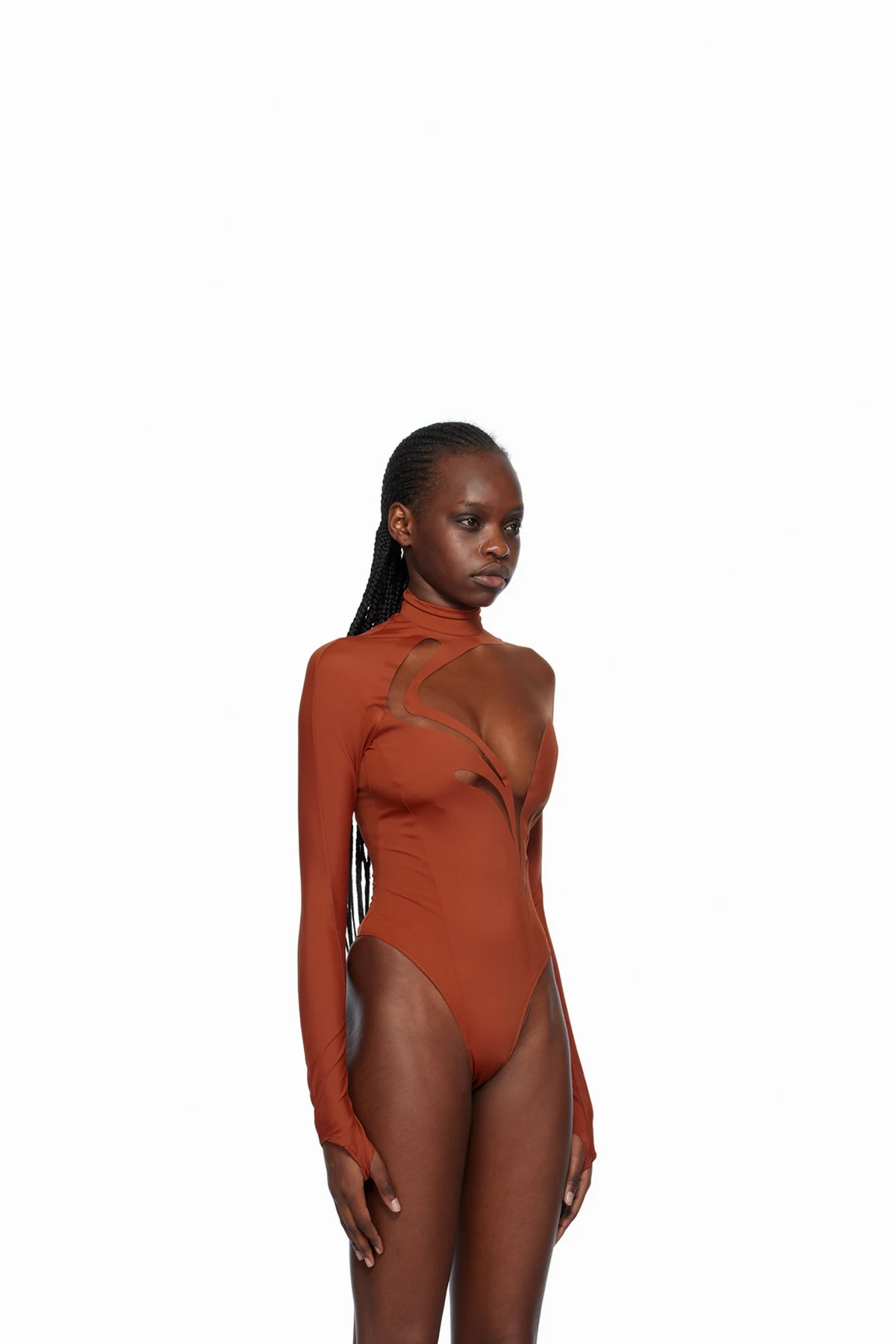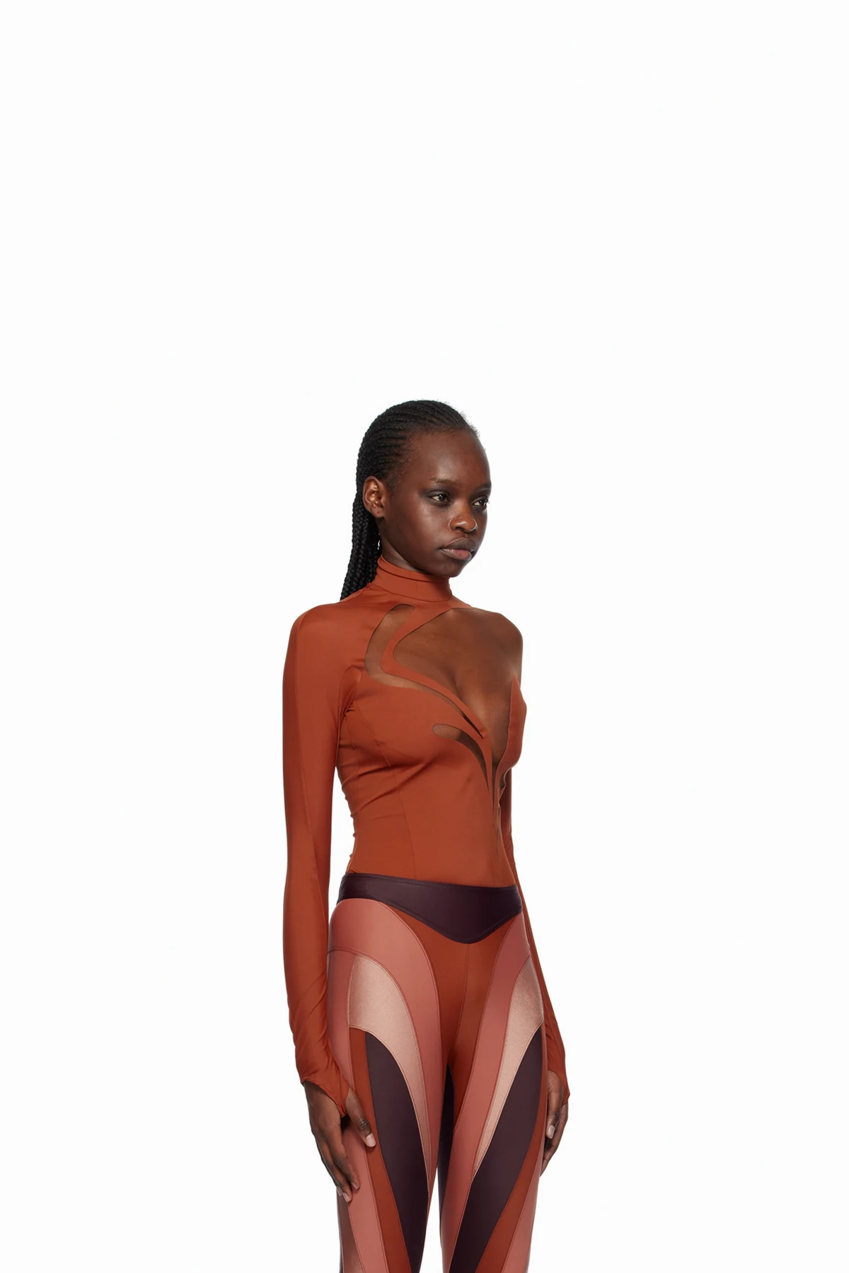 Stretch nylon jersey and sheer stretch nylon mesh bodysuit.