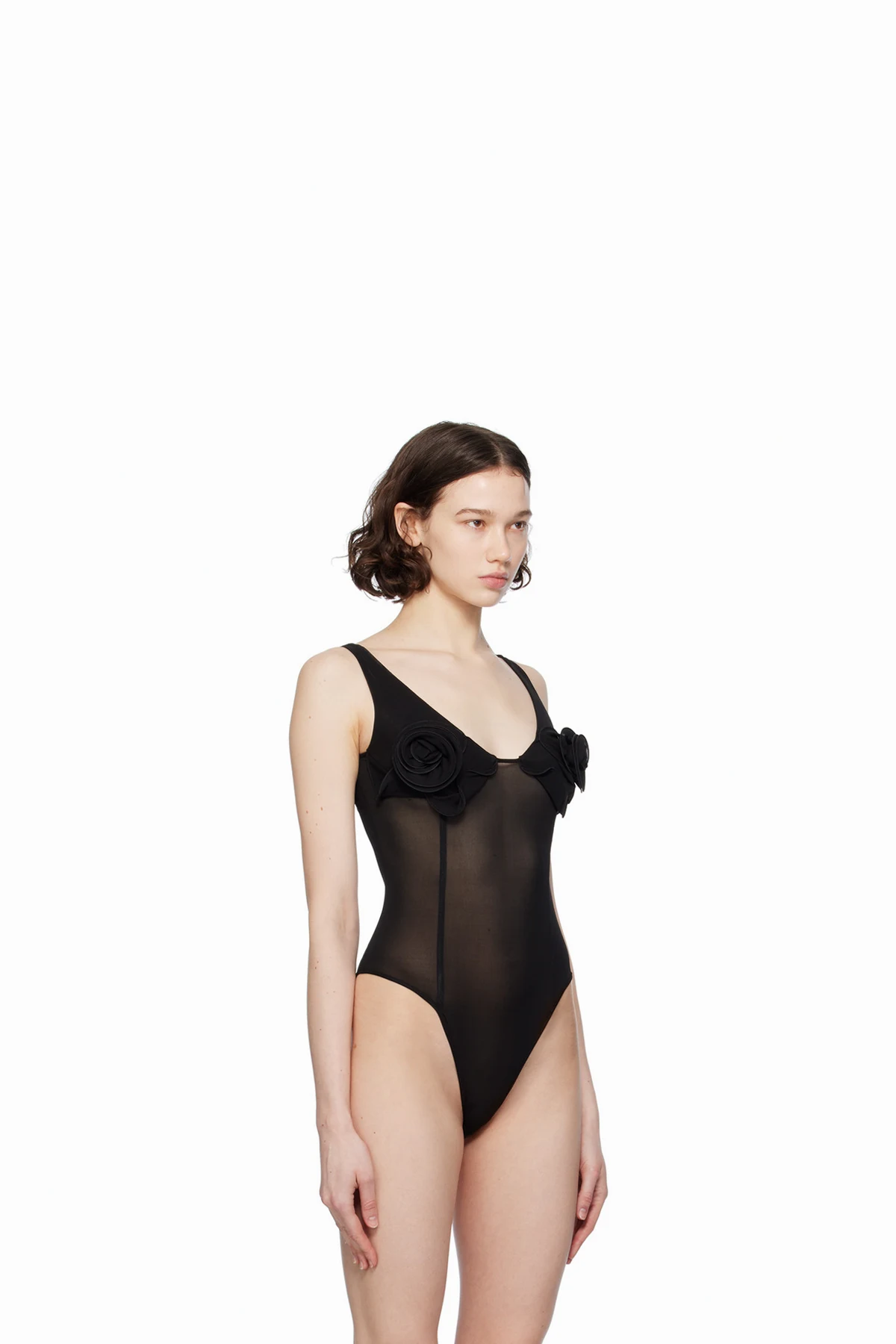 Semi-sheer stretch viscose jersey bodysuit. Boning throughout.