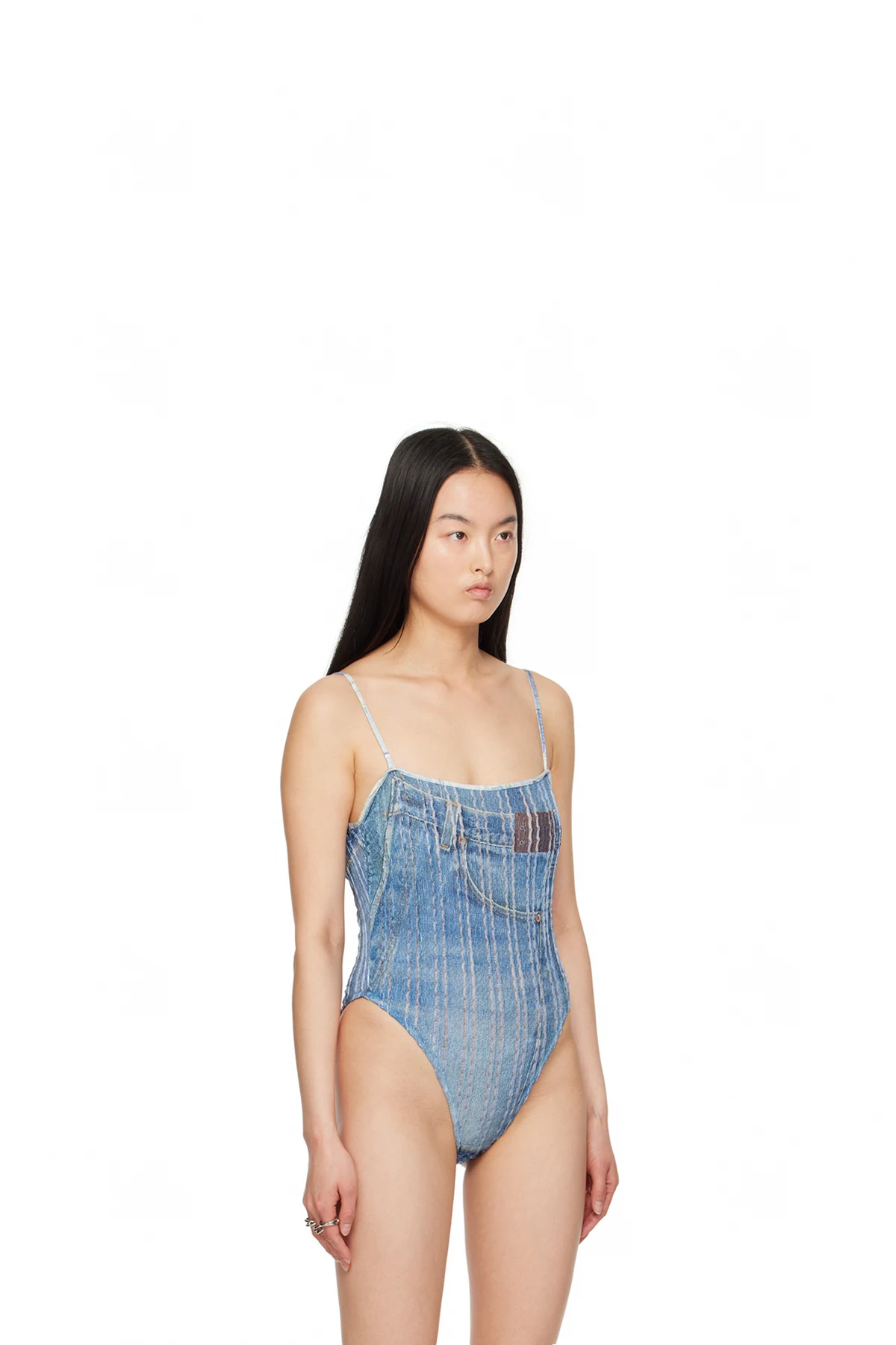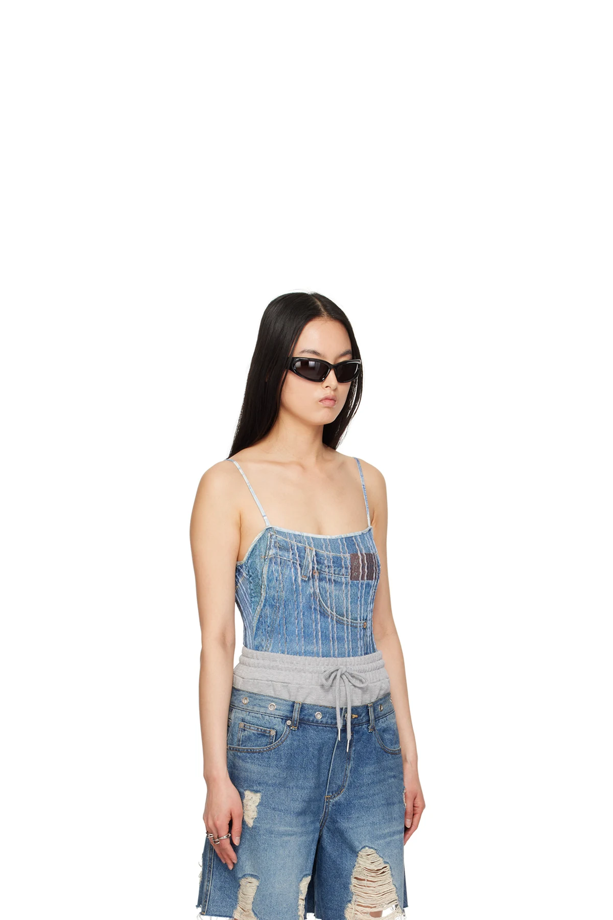 Knit stretch polyester bodysuit. Trompe l'oeil denim effect and laddering throughout.