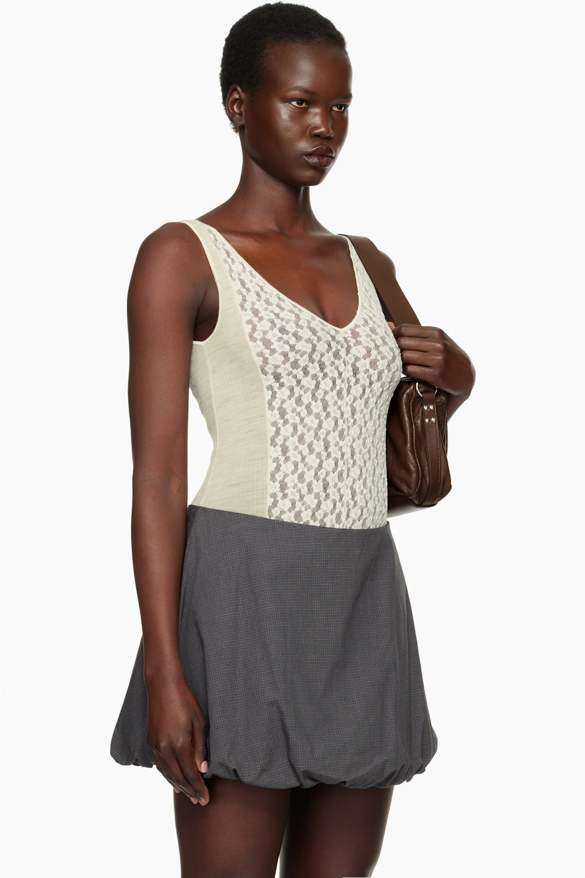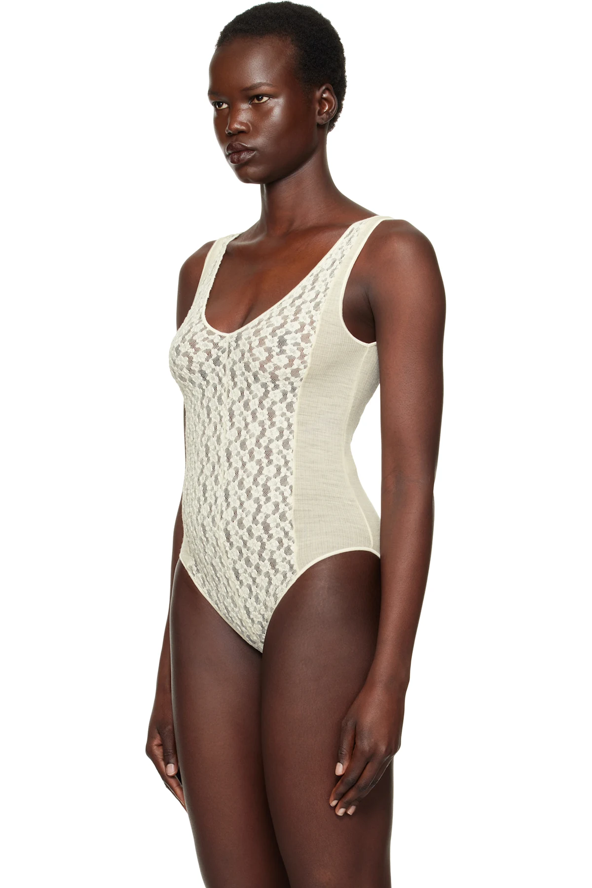 Semi-sheer stretch nylon- and organic cotton-blend lace bodysuit. Jacquard floral pattern throughout.