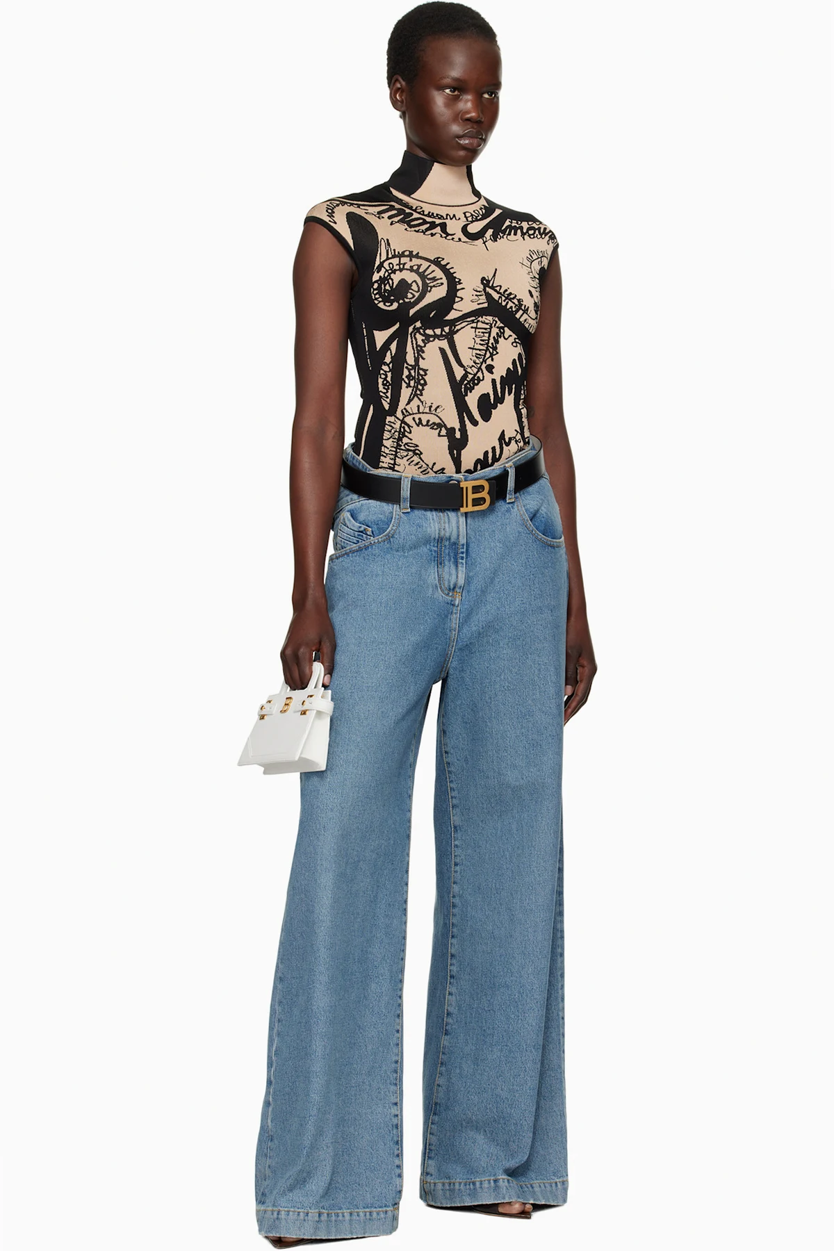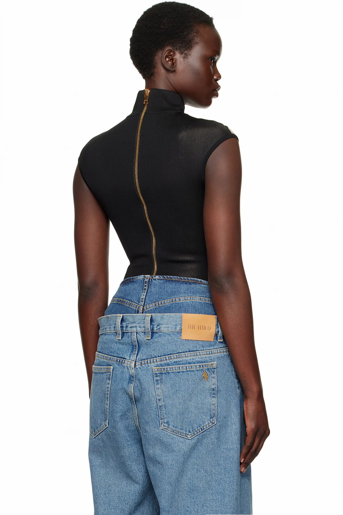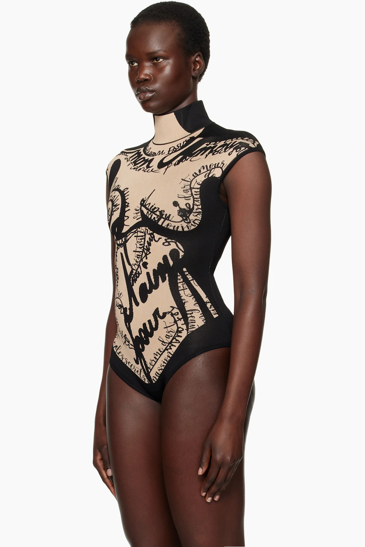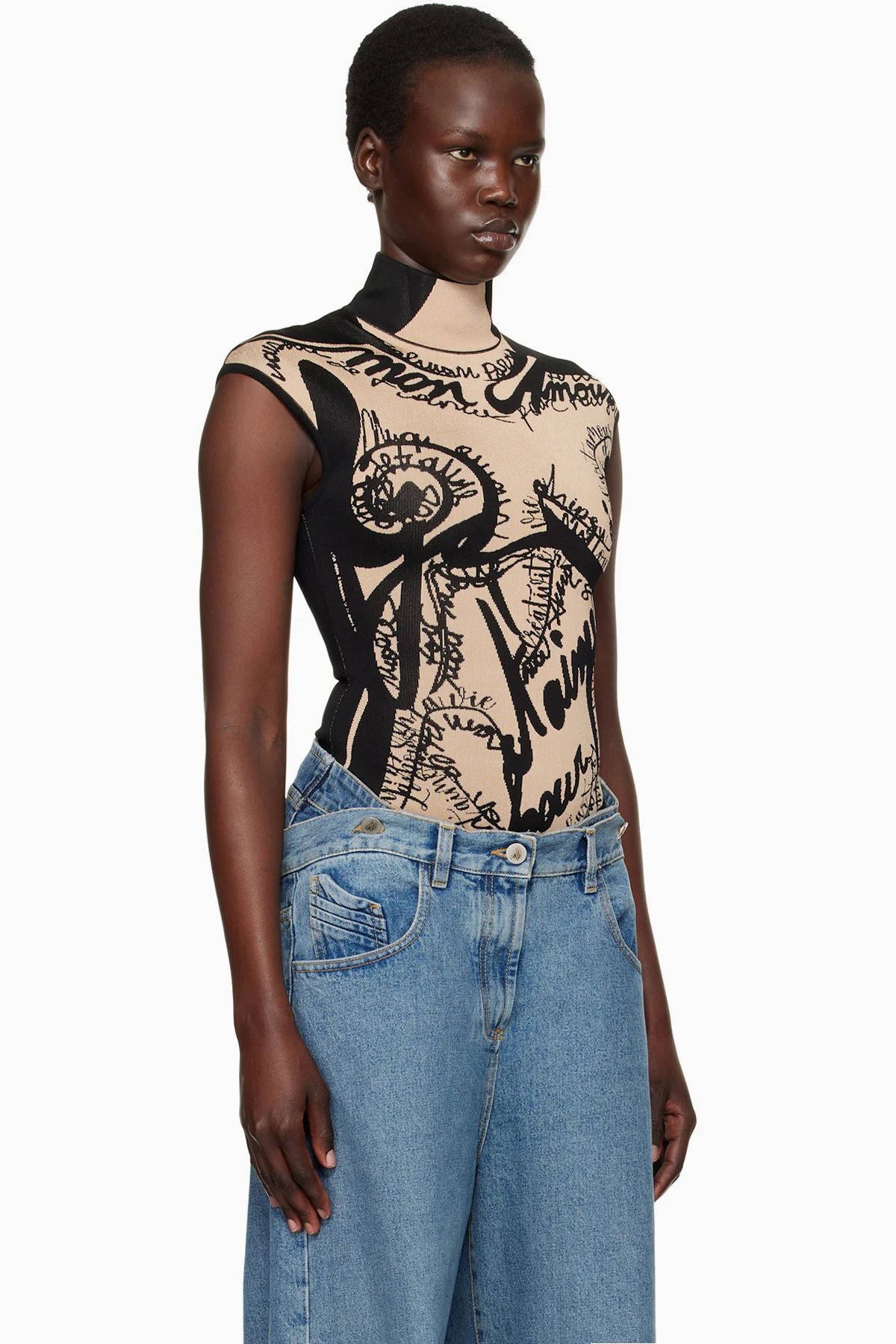 Balmain Black & Beige Jacquard Knit Torso Motif Bodysuit