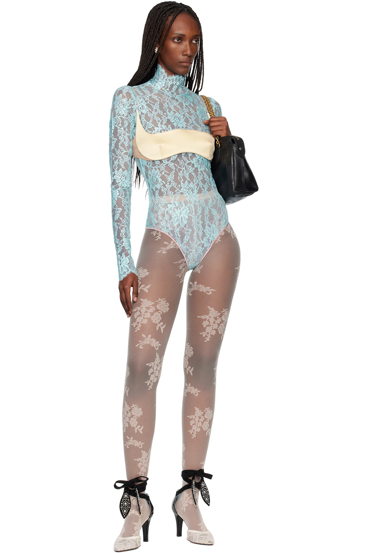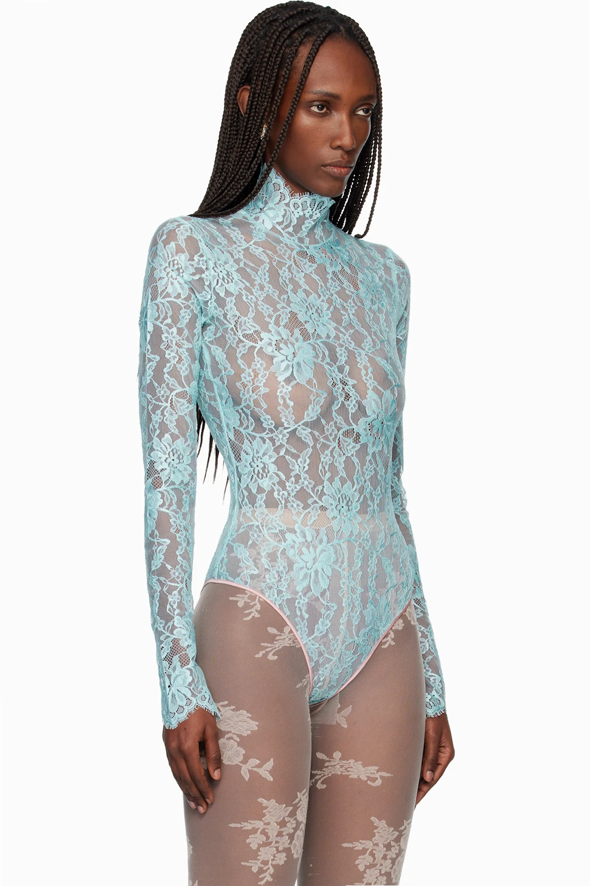 Semi-sheer stretch nylon lace bodysuit.