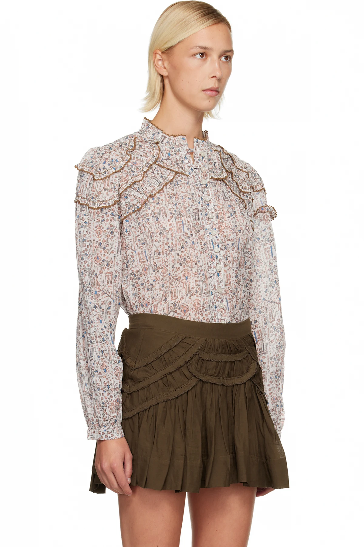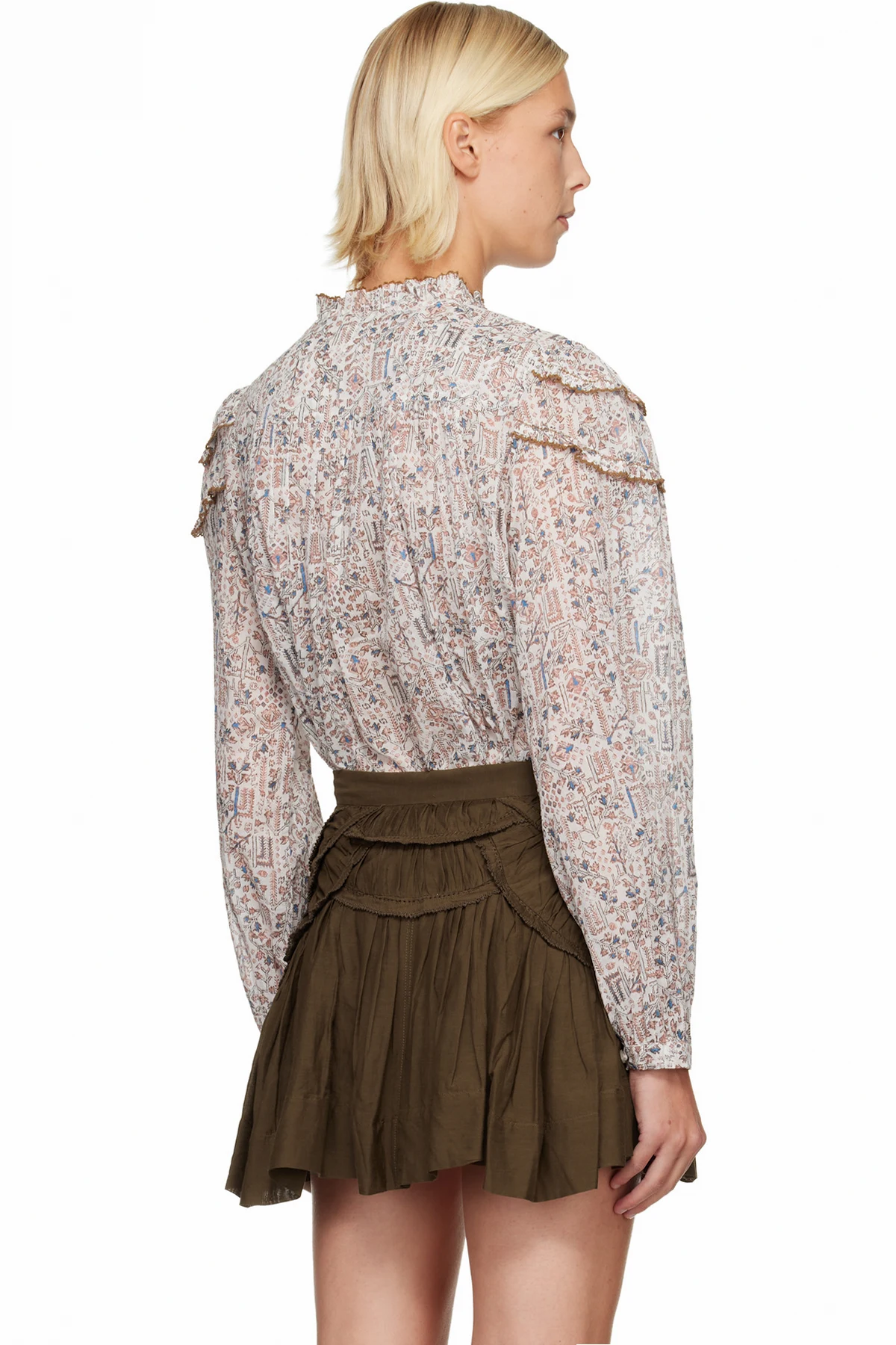 · Gathering at cuffs and back yoke