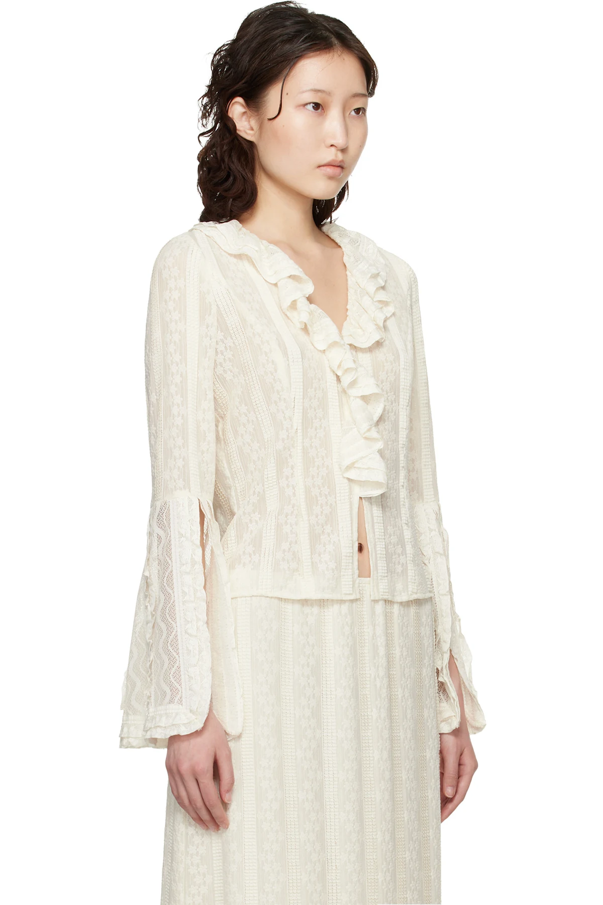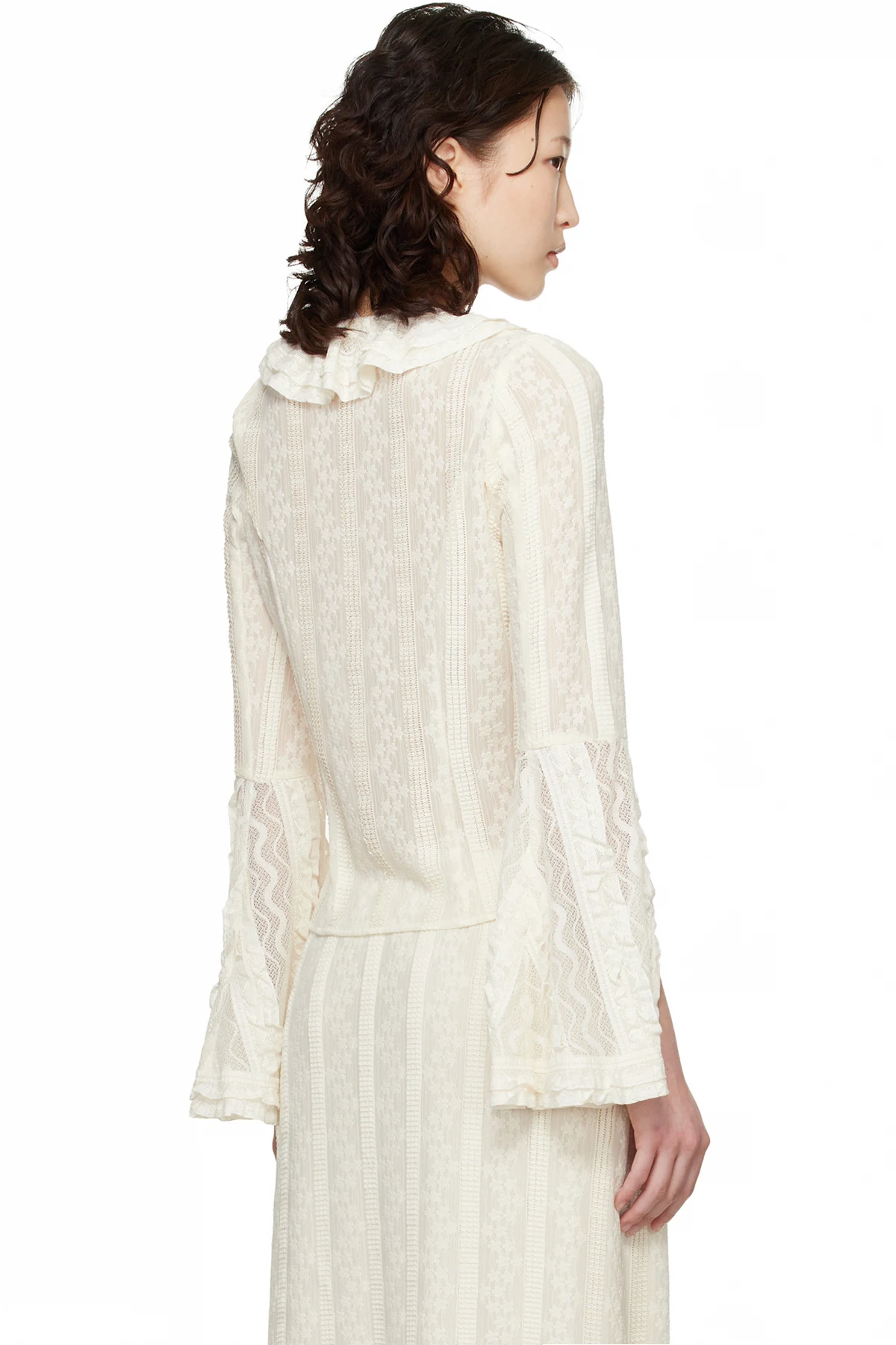 Anna Sui Off-White Floral Ruffle Stretch Lace Blouse