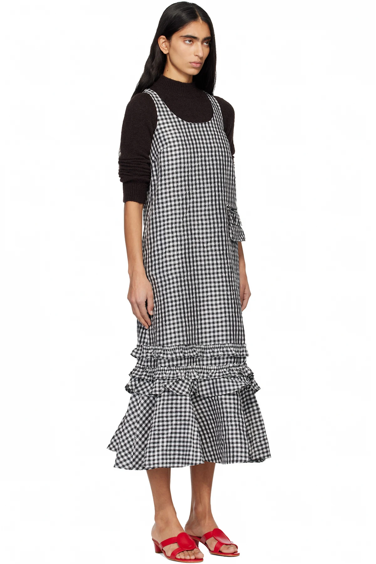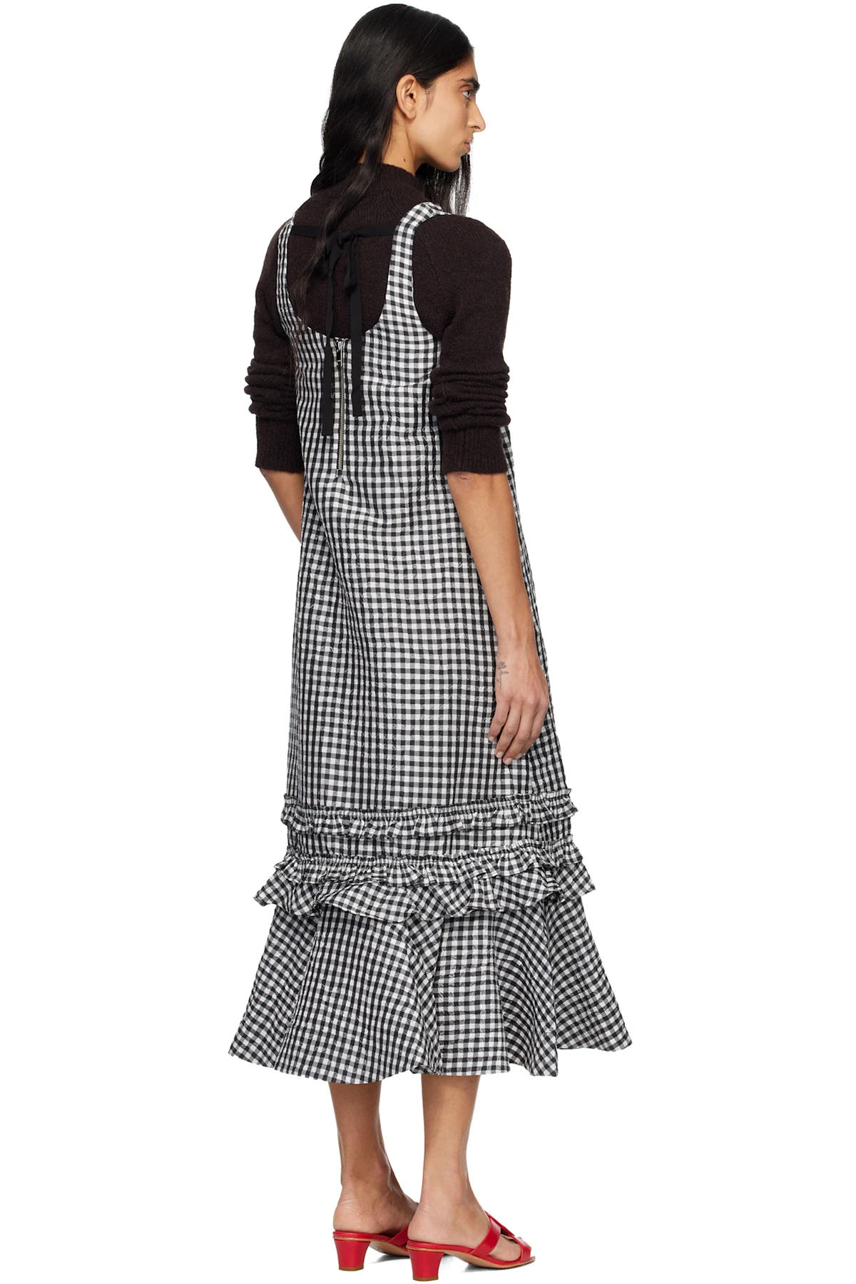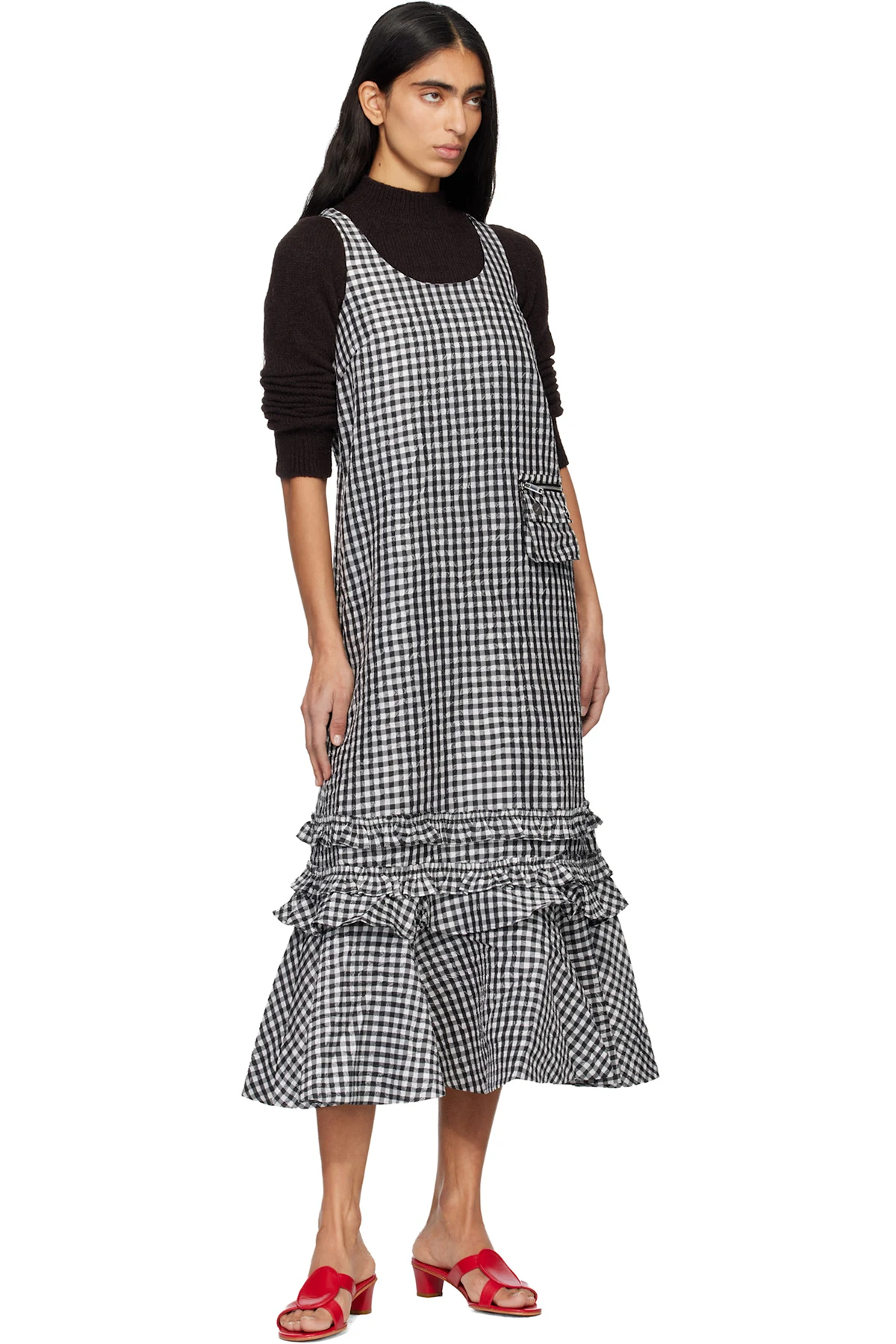 Ganni Black & White Crinkled Check Midi Dress