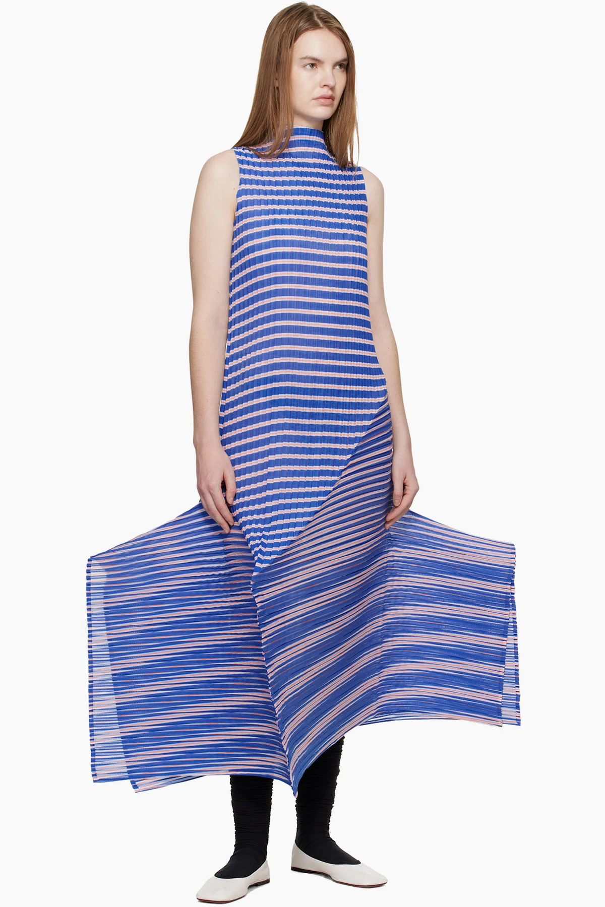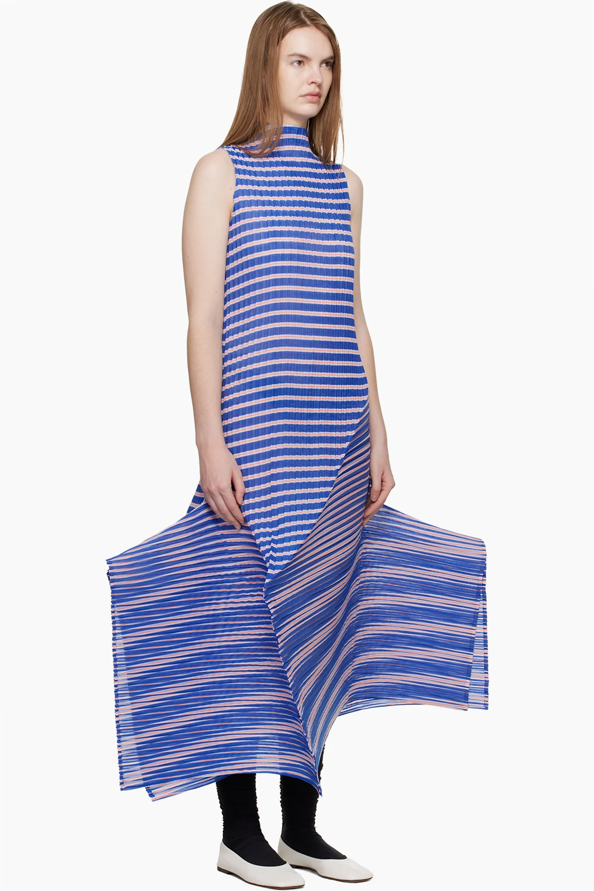 Issey Miyake Navy Generic Stripes Machine Pleats Midi Dress