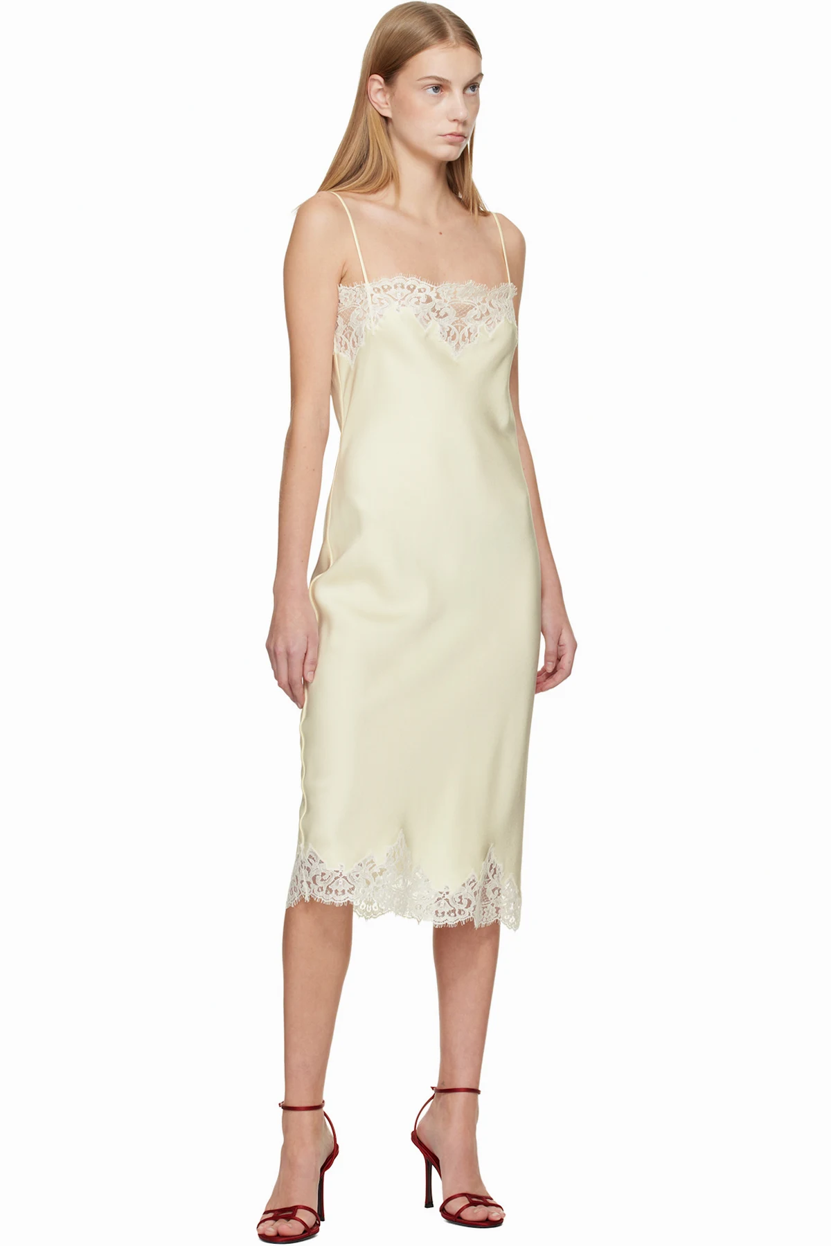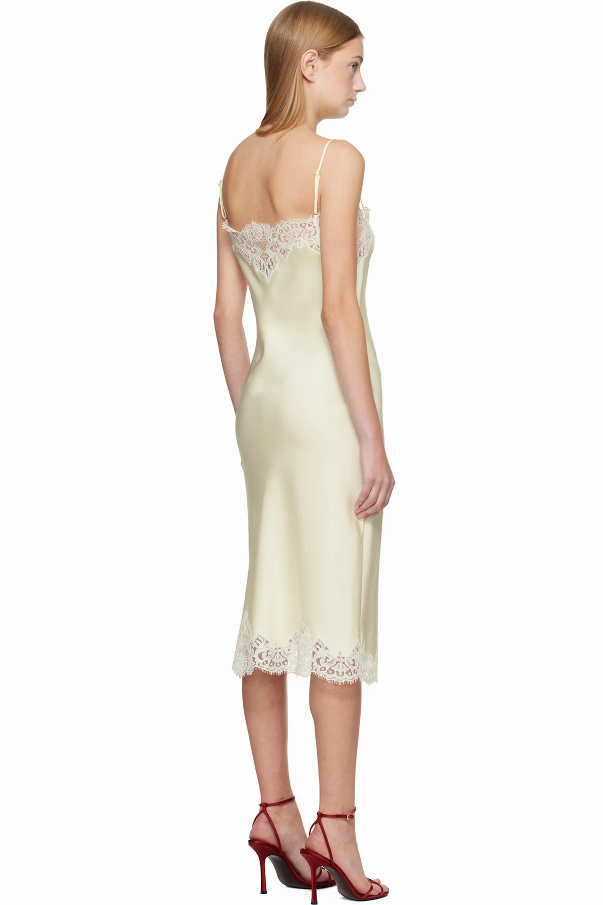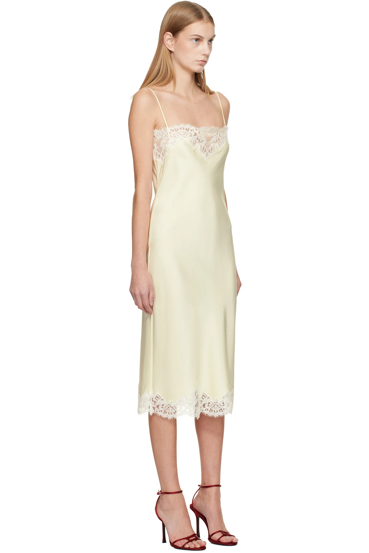 FSC-certified viscose-blend satin midi dress. Lace trim with scalloped edge at square neck and hem.