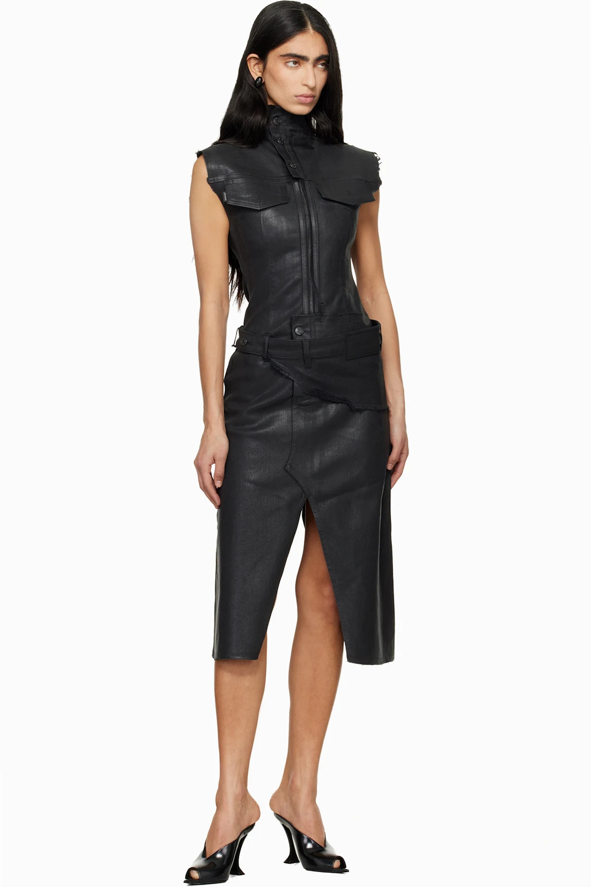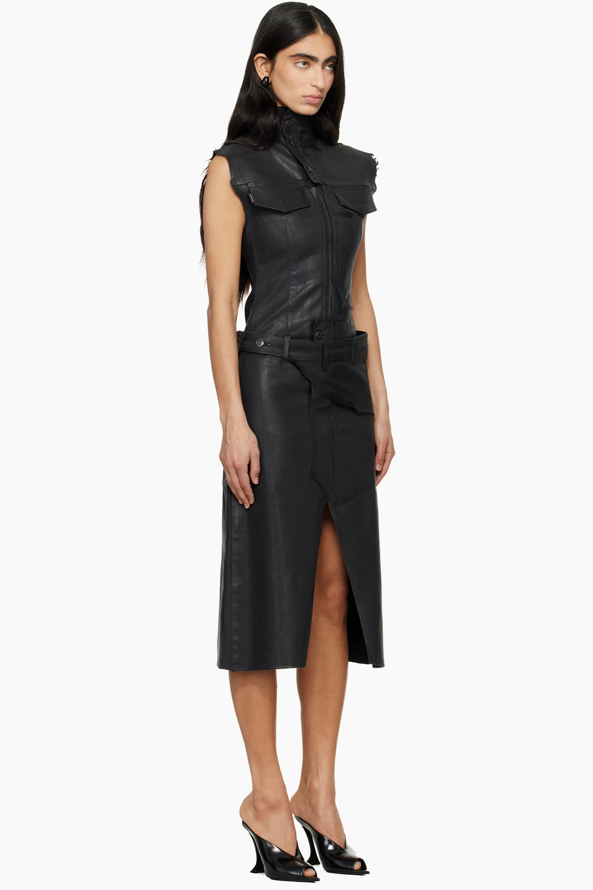 Coated stretch denim midi dress.