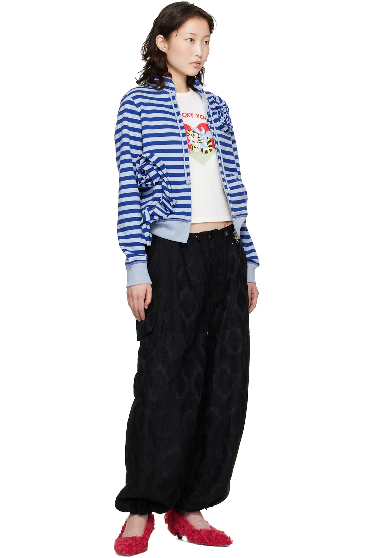 · Floral appliqués and patch pockets at front