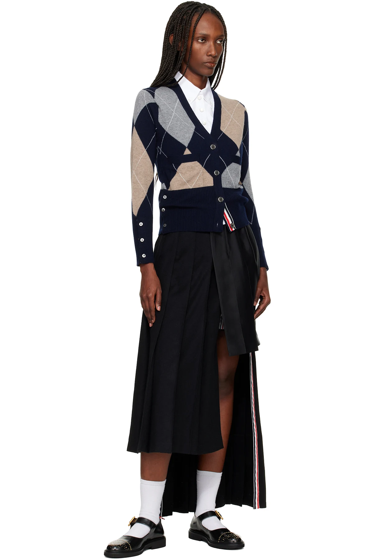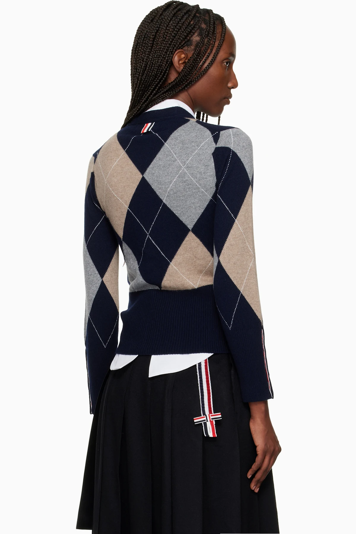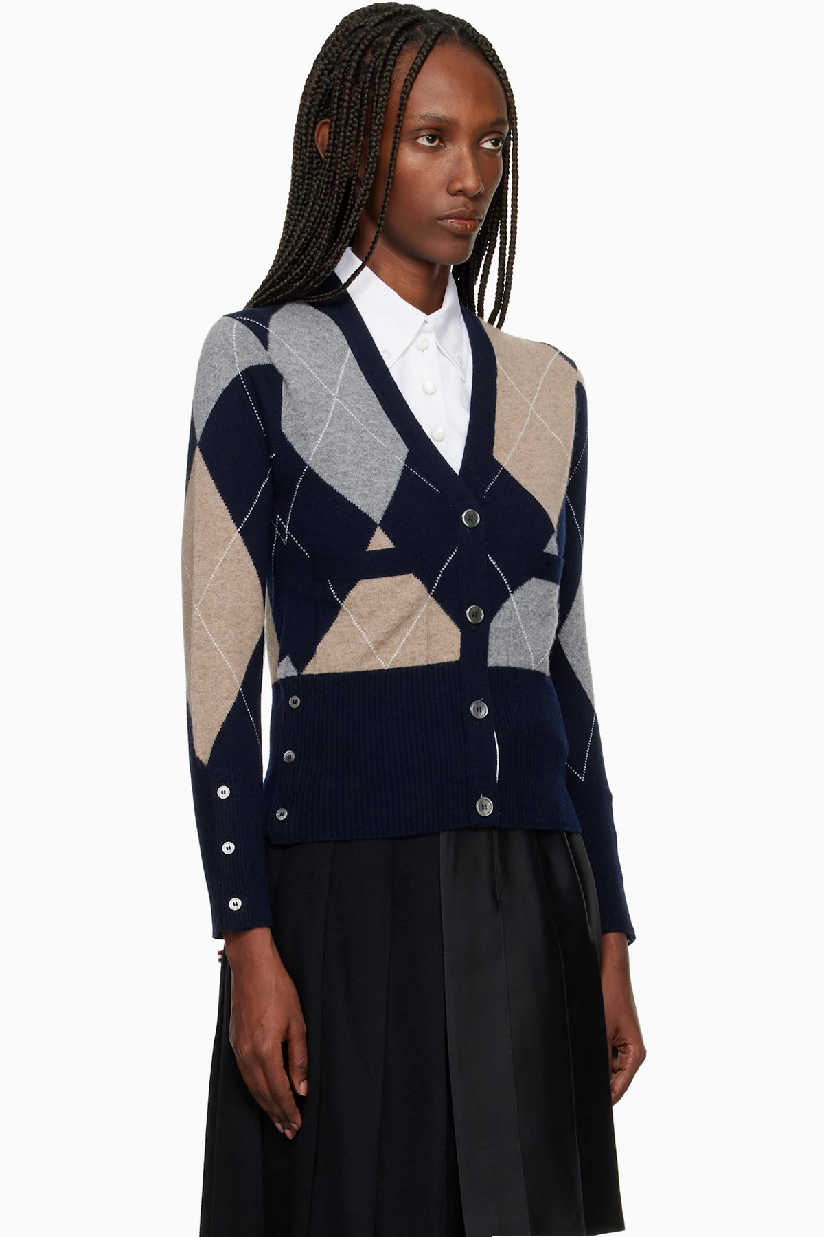 Thom Browne Navy Argyle Intarsia Cashmere V Neck Cardigan