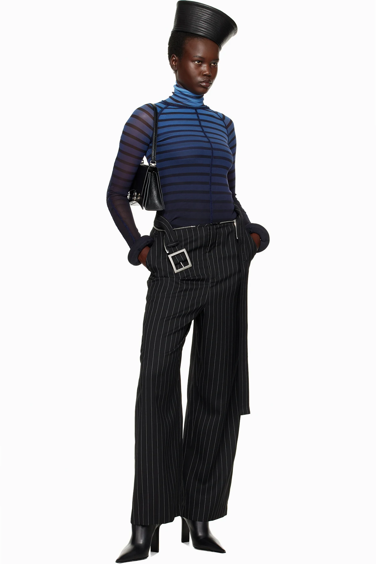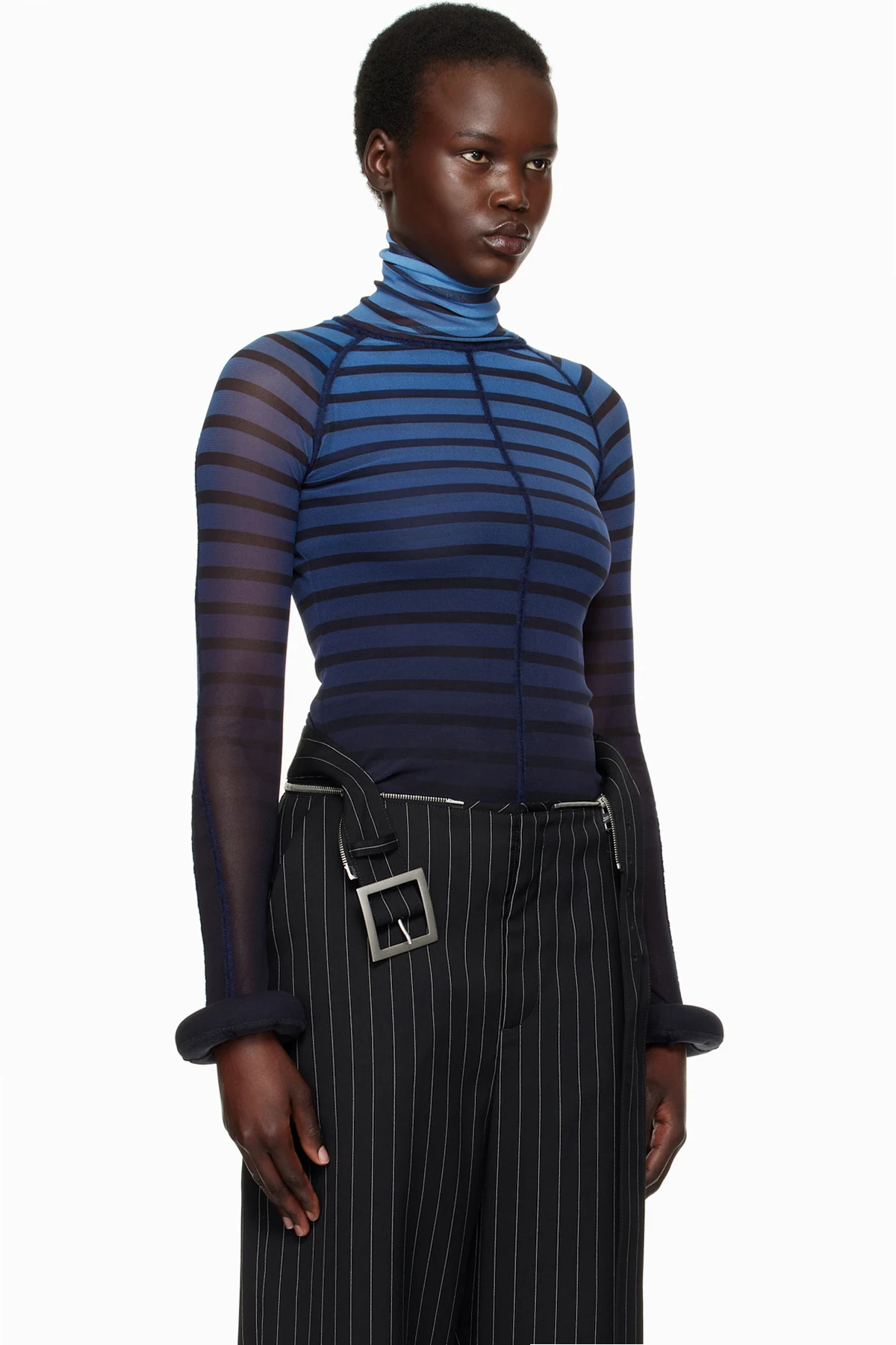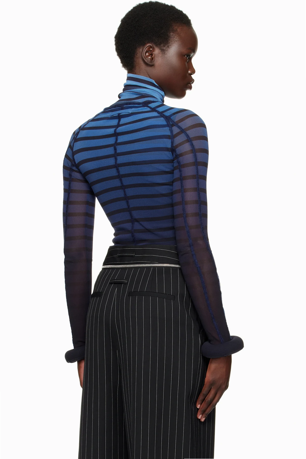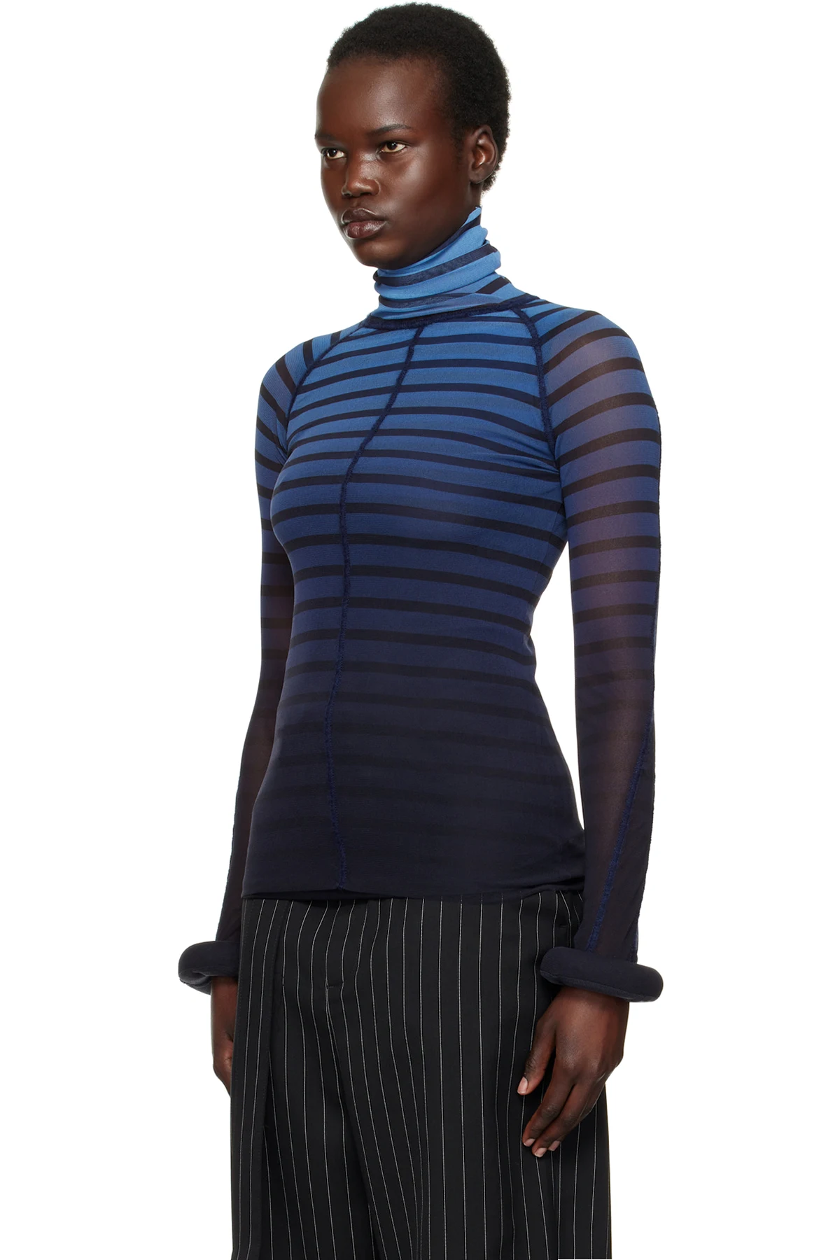 Semi-sheer nylon tulle turtleneck. Stripes and raised seams throughout.