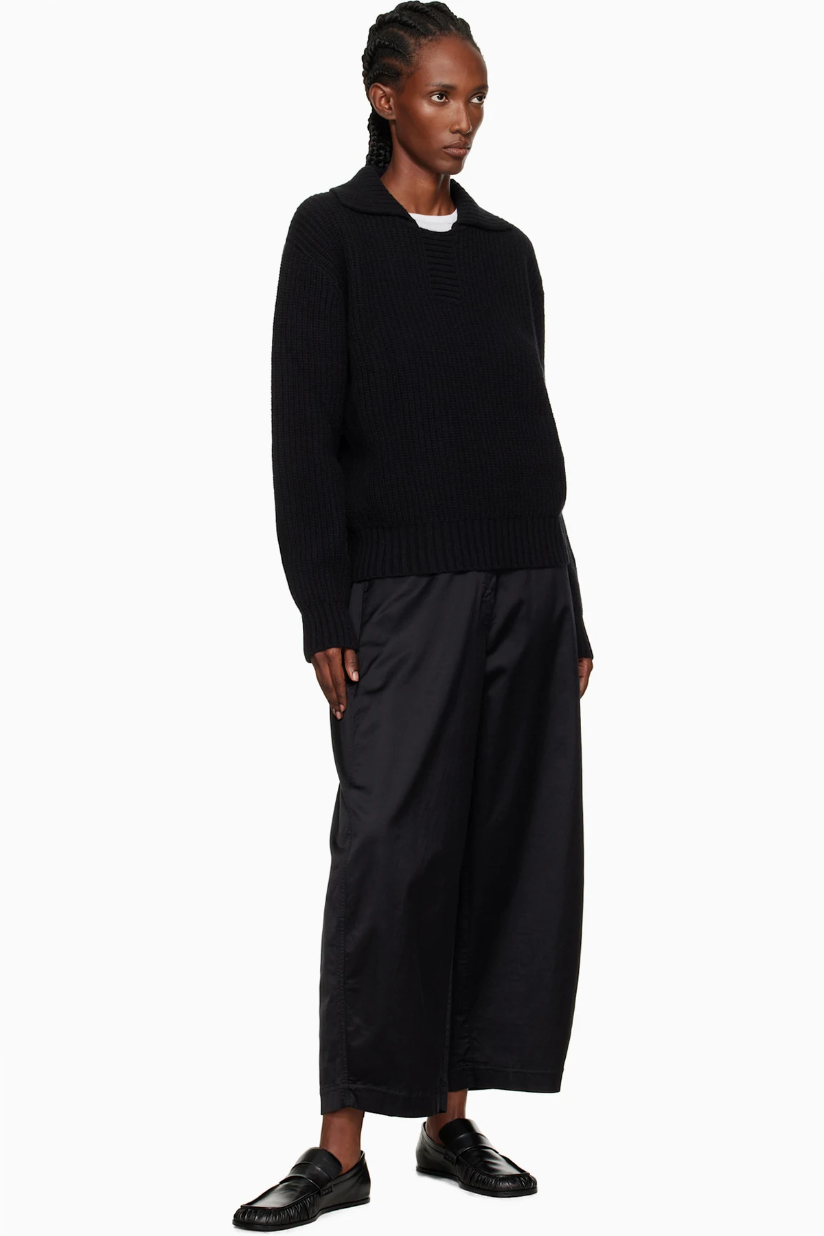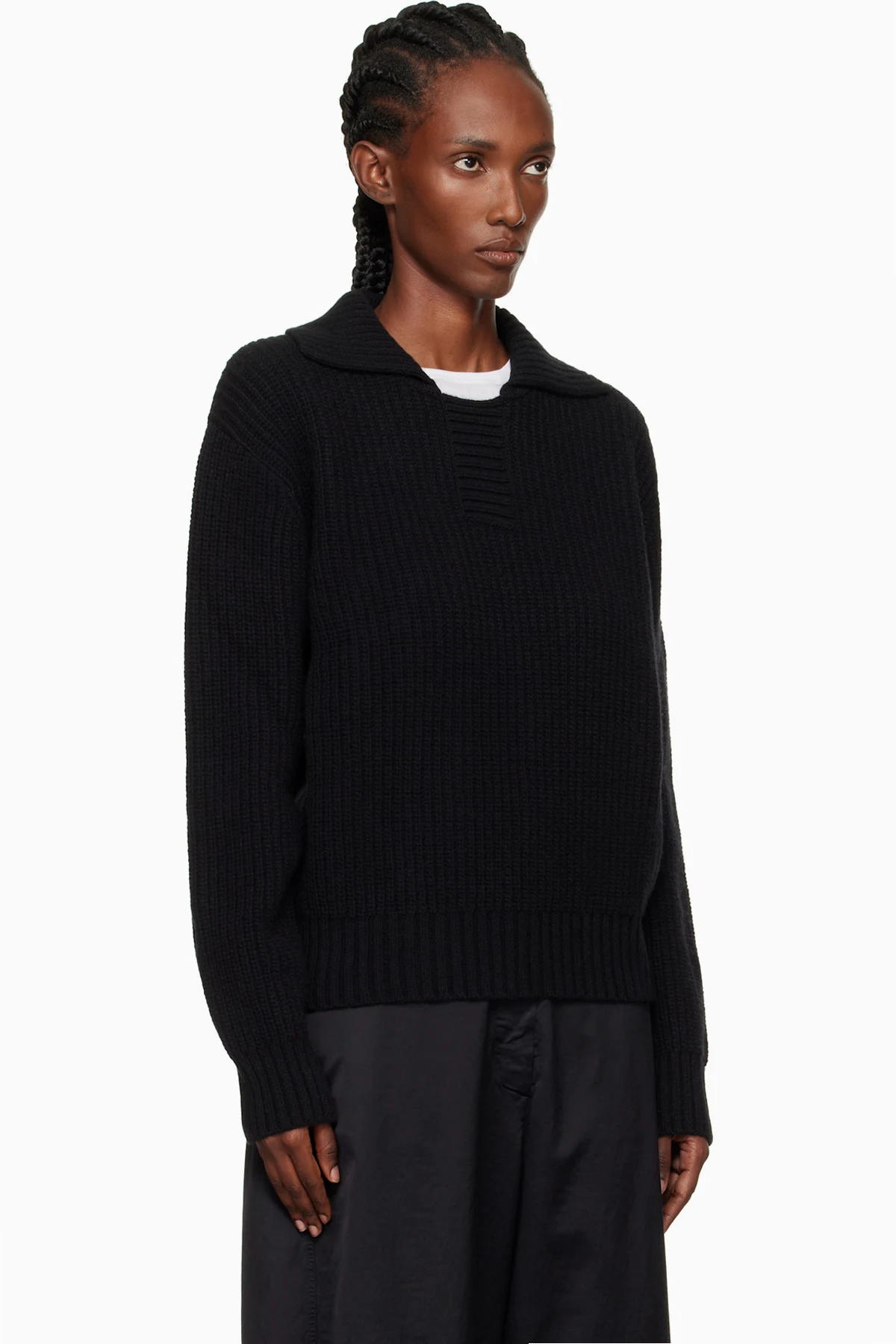 Rib-knit wool sweater. Spread collar.