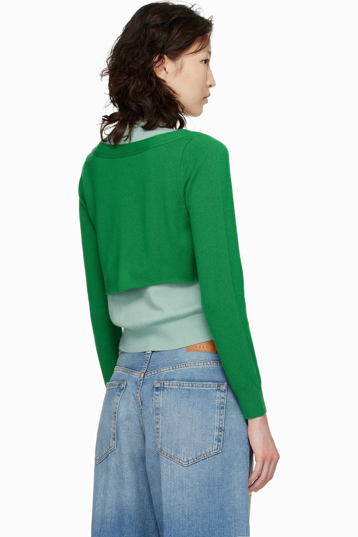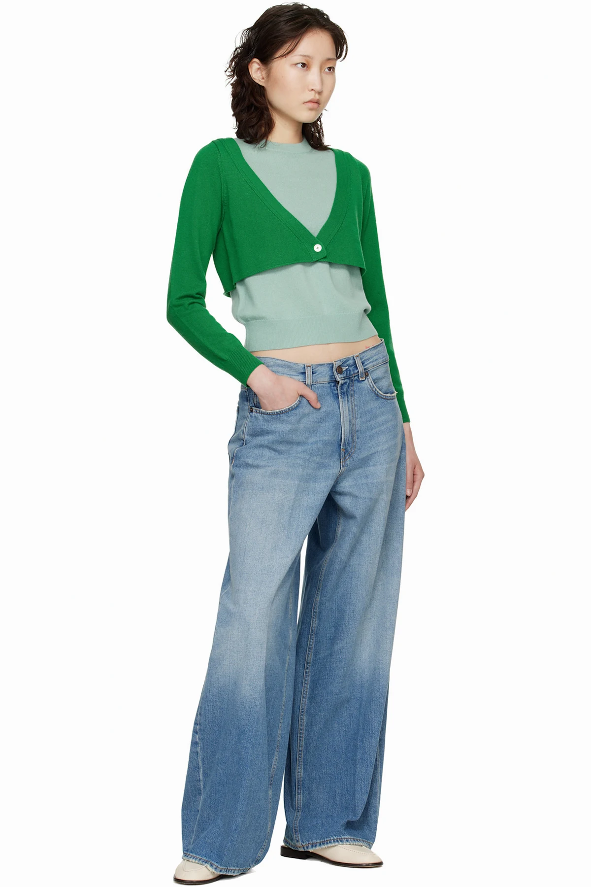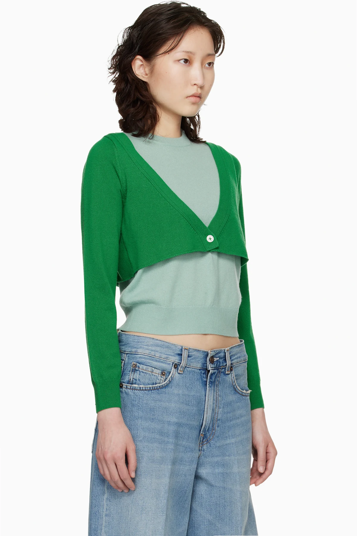 · Button fastening at integrated cardigan-style overlay