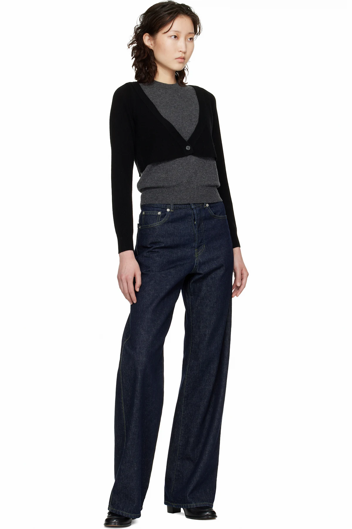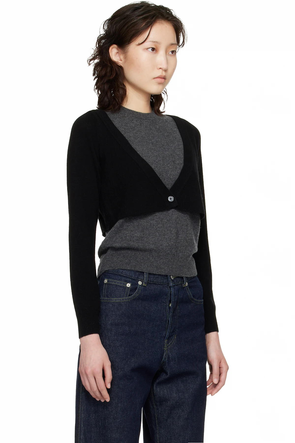 · Button fastening at integrated cardigan-style overlay