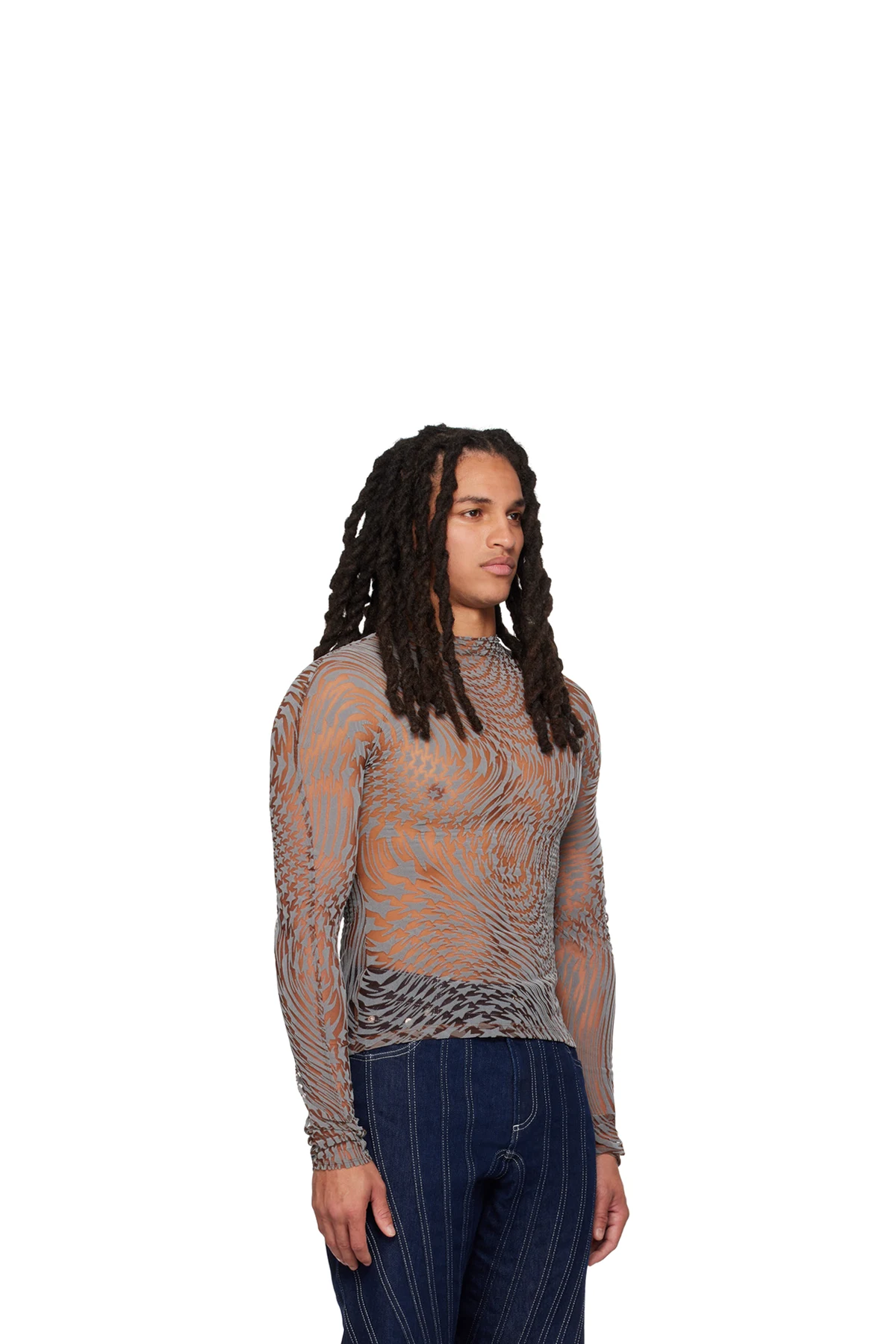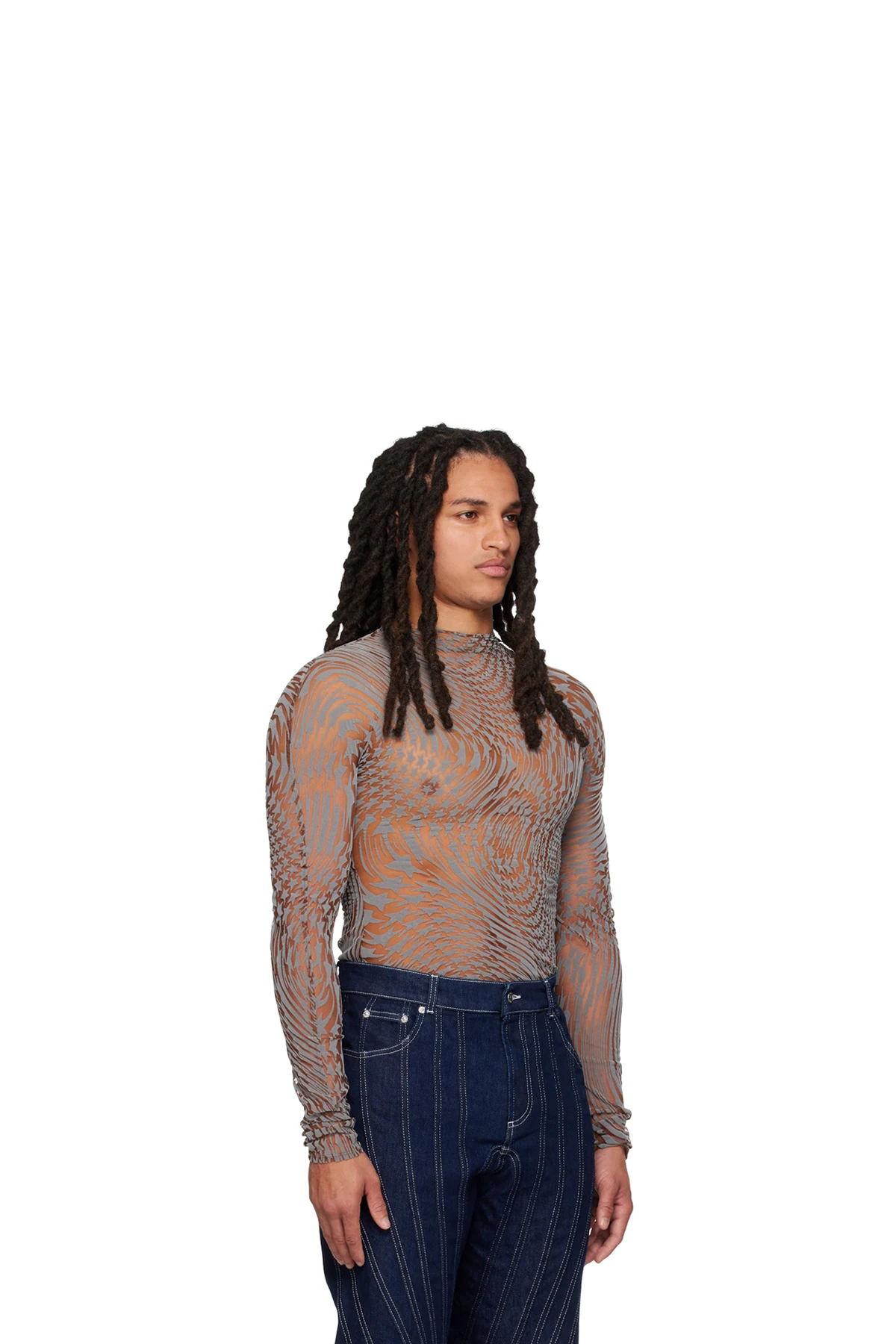 Semi-sheer stretch nylon mesh turtleneck.