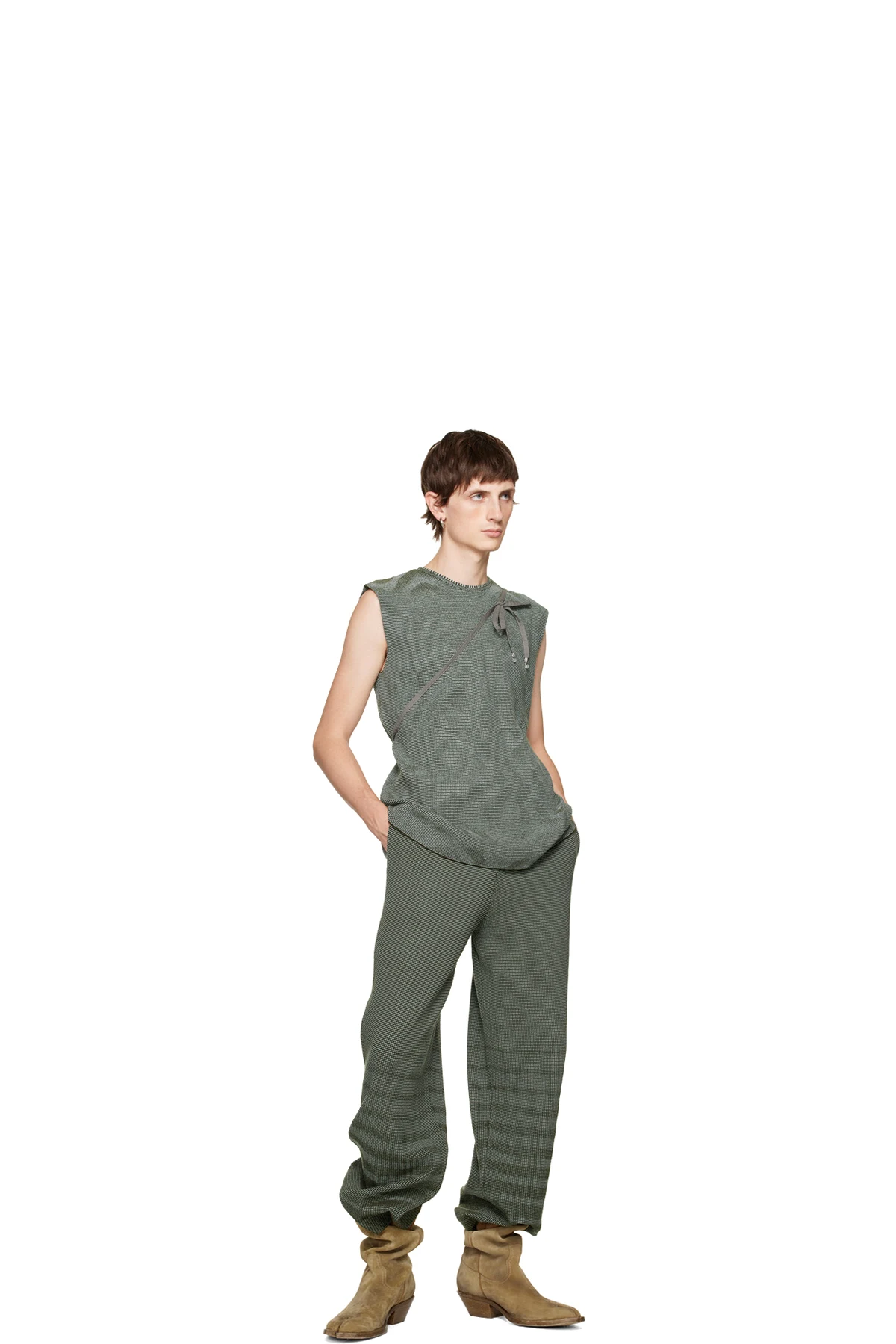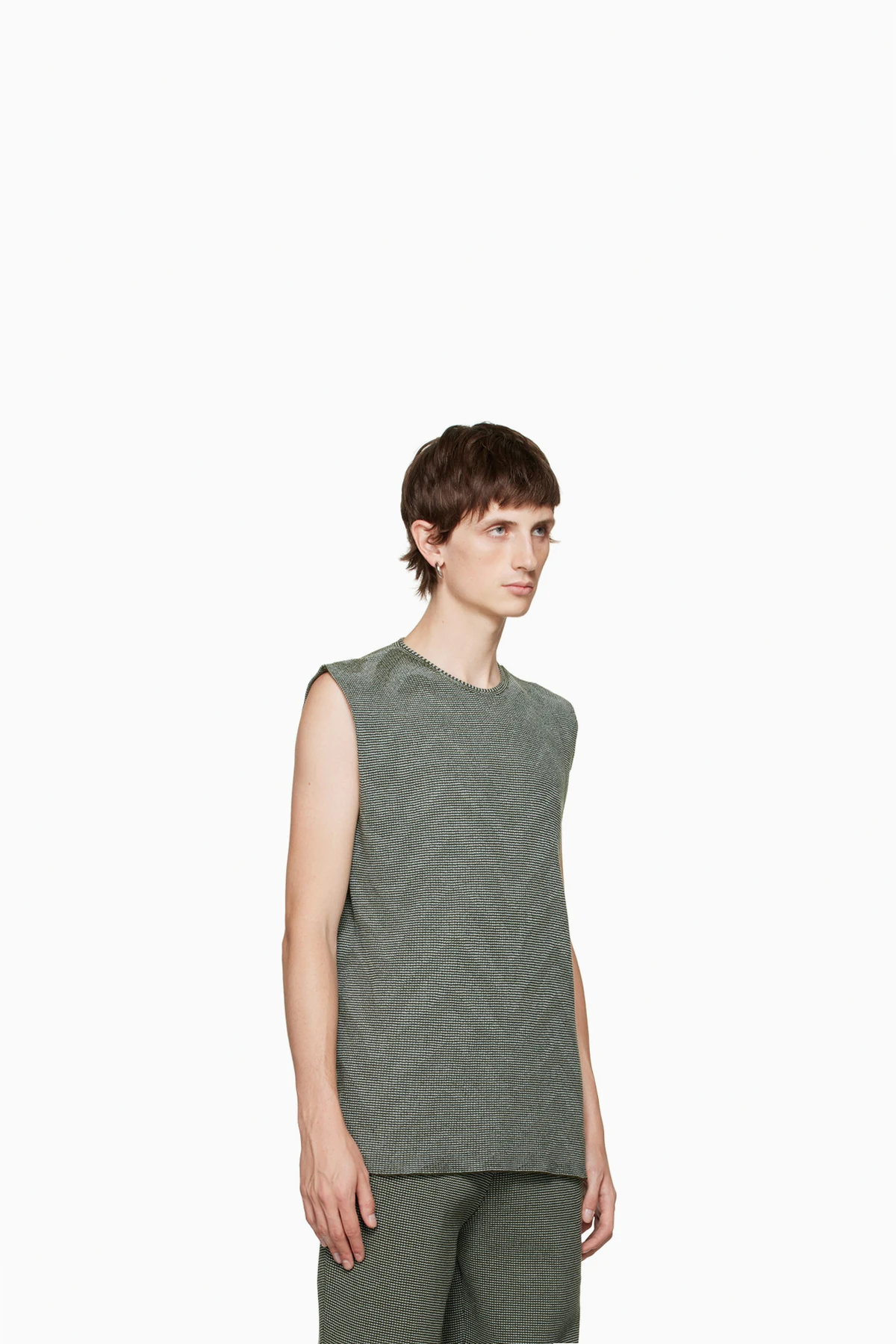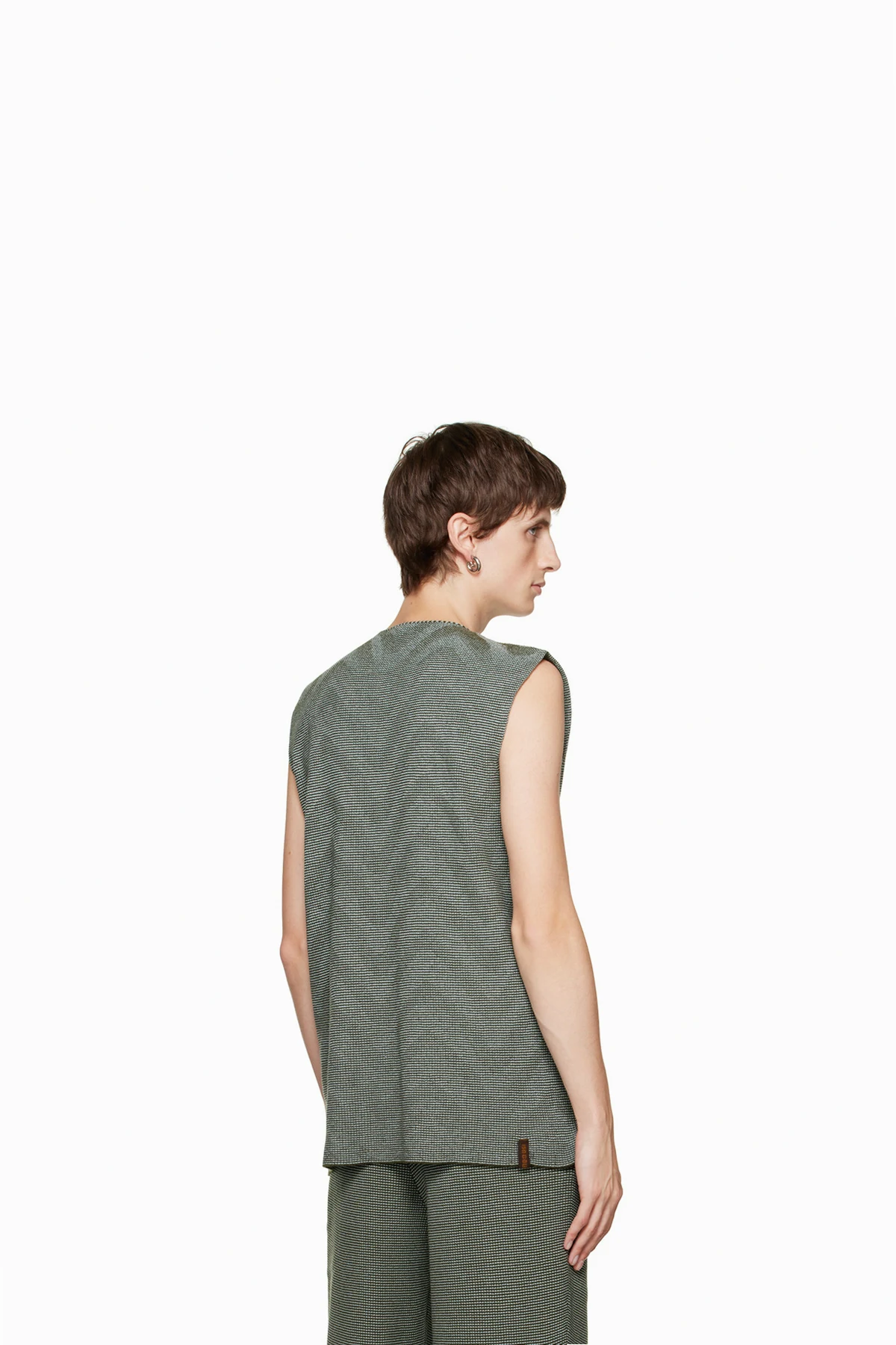 Handcrafted waffle knit stretch acrylic tank top. Graphic pattern throughout.