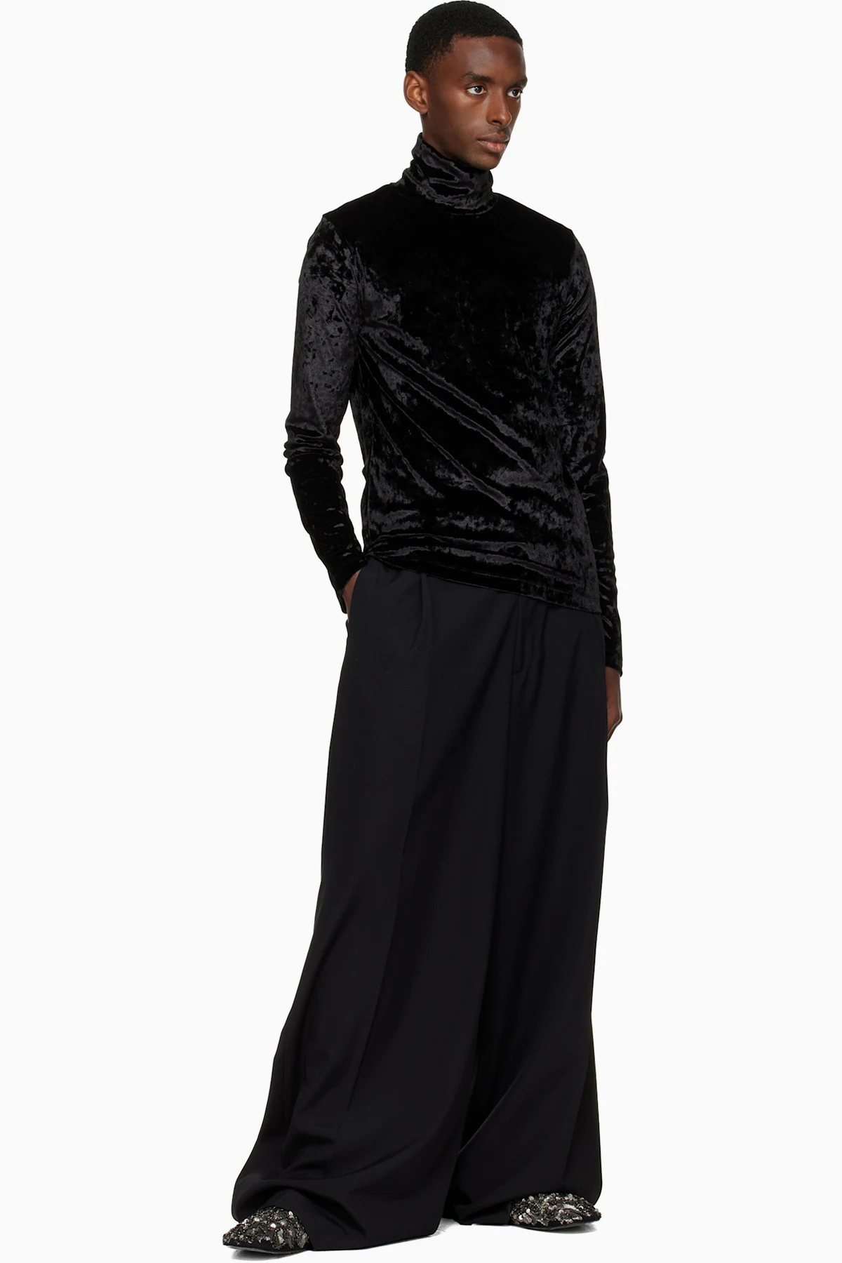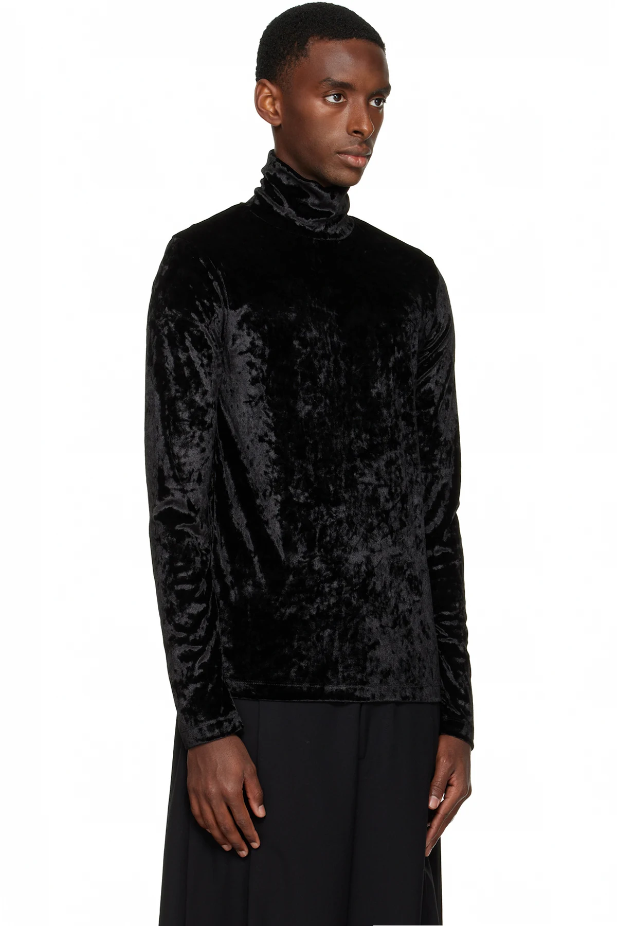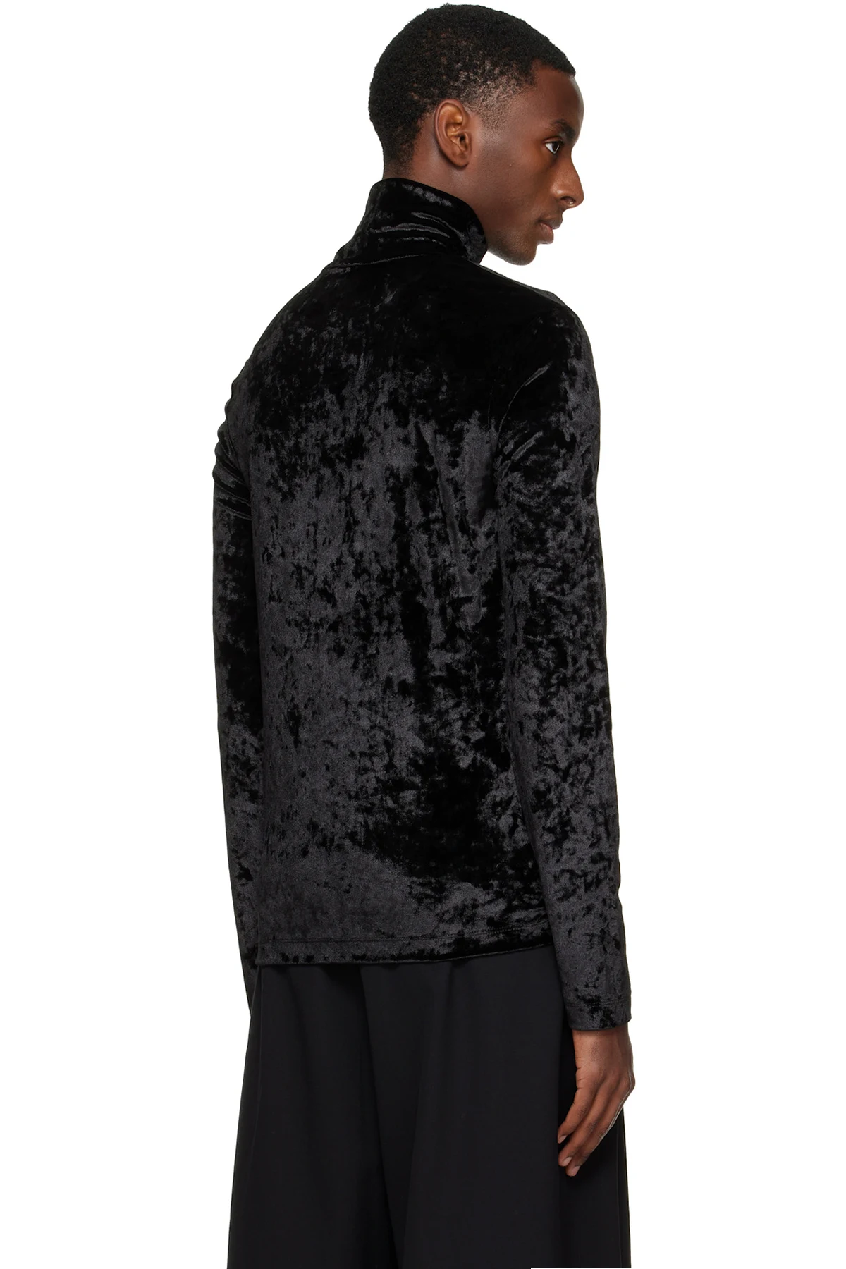 Stretch crushed velvet top. Mock neck.