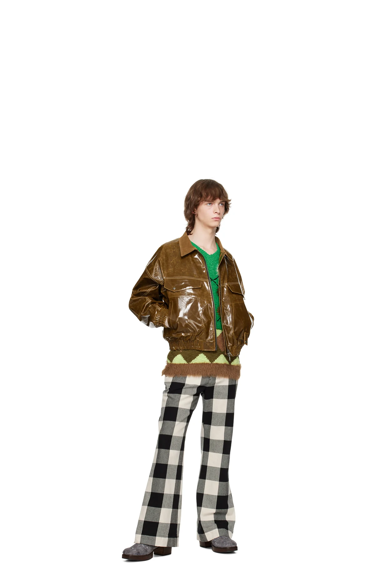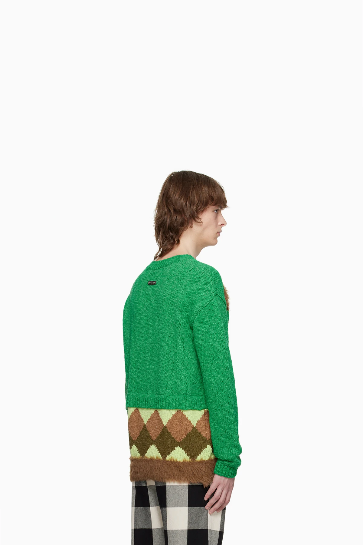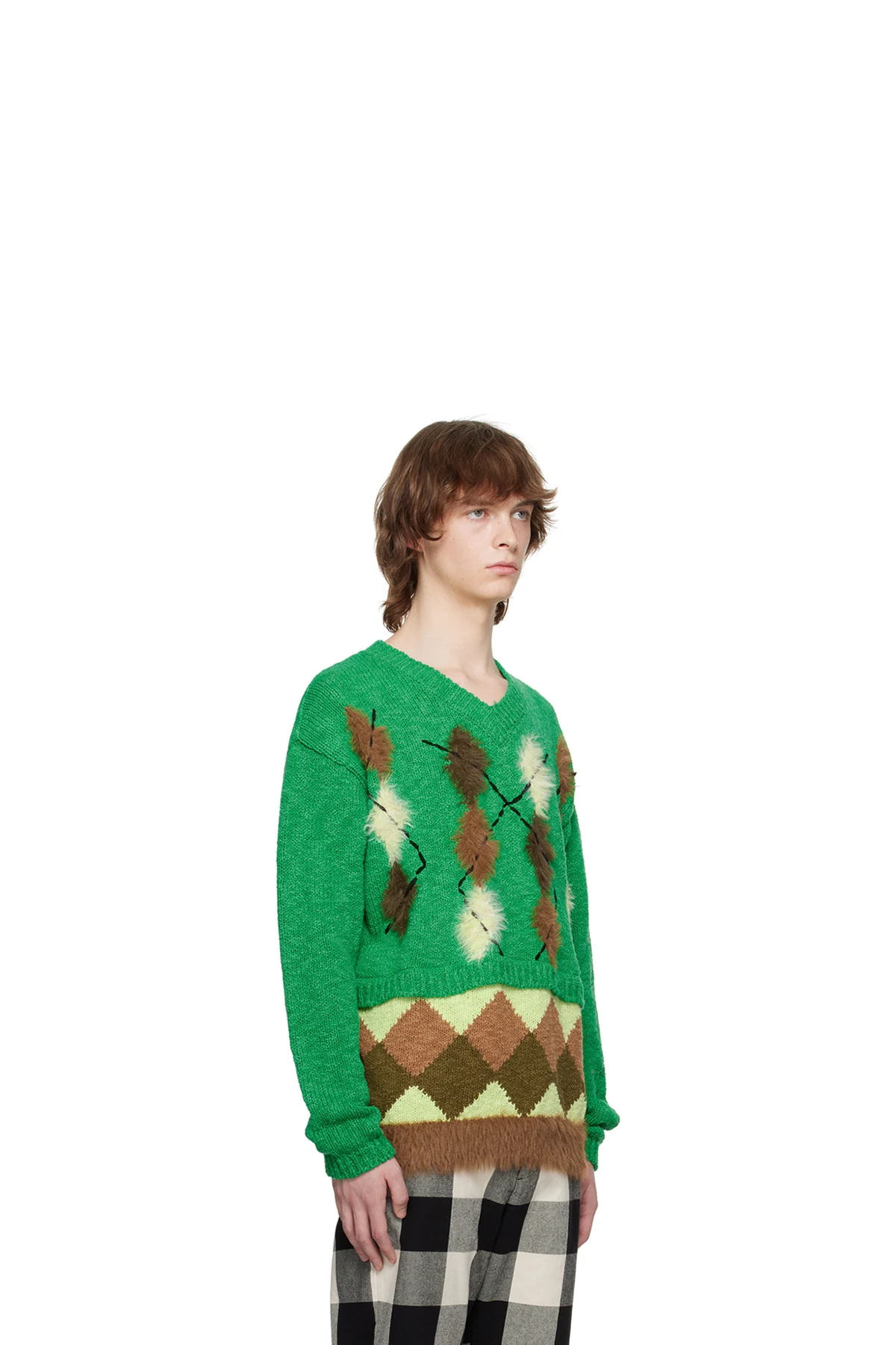 Handcrafted knit cotton- and acrylic-blend sweater. Shag knit trim and intarsia argyle pattern throughout.