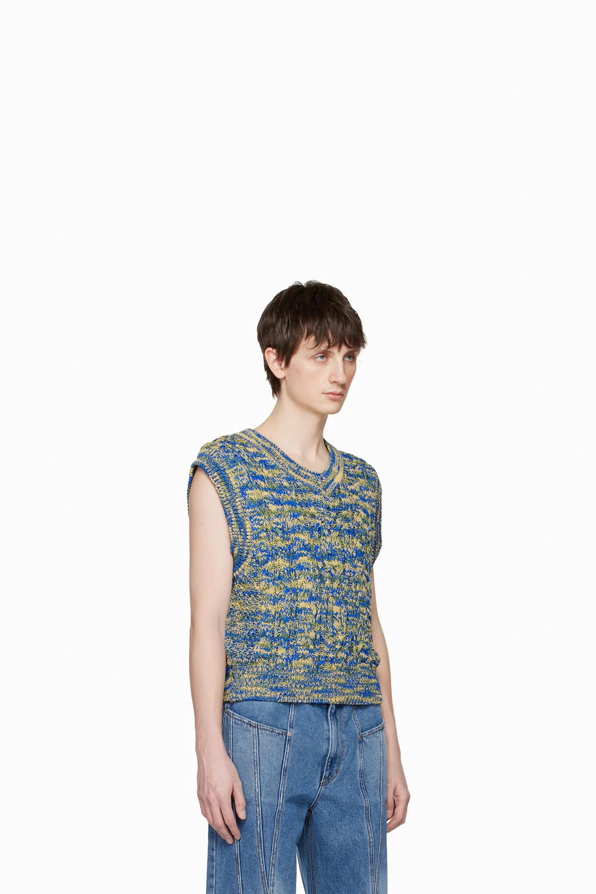 Cable knit cotton-blend vest. Rib knit V-neck, armscyes, and hem.