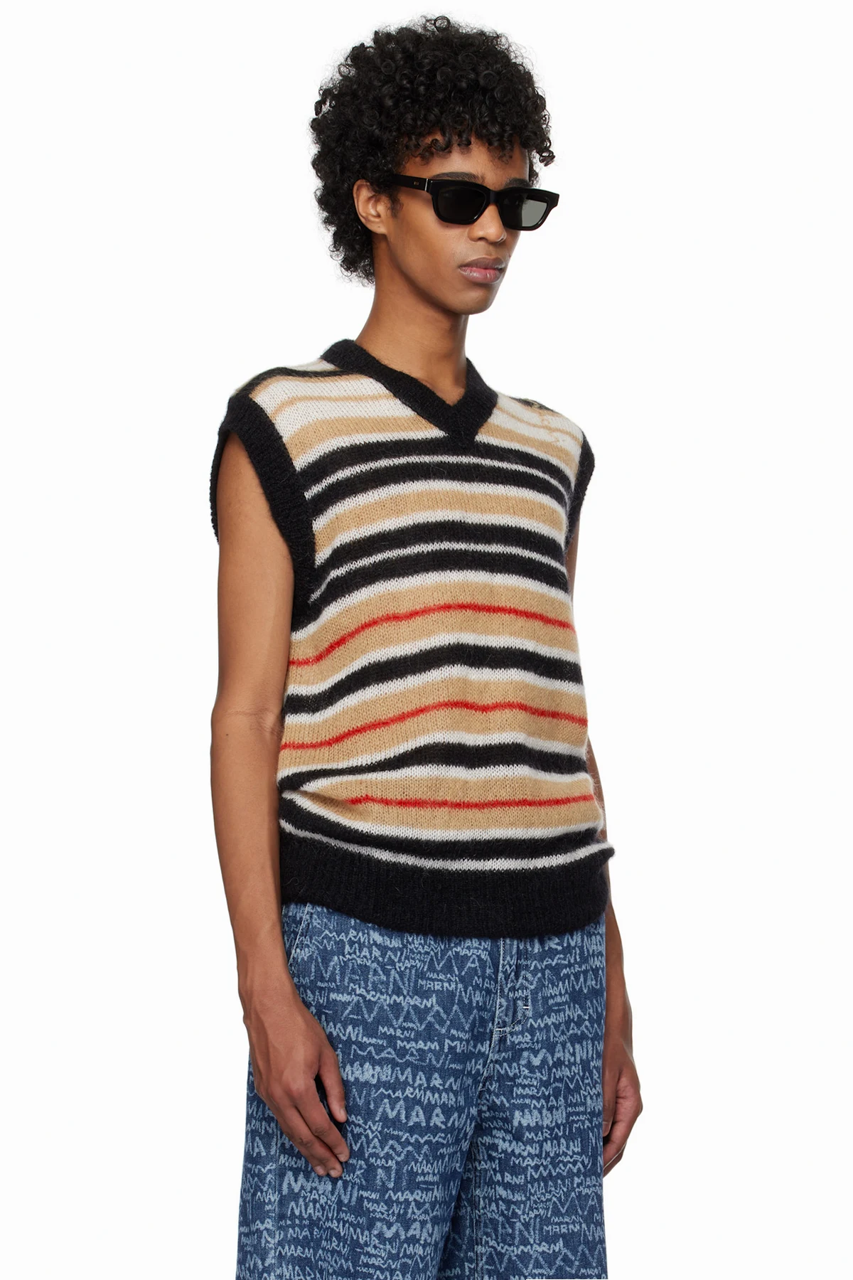 Brushed knit mohair-blend vest. Intarsia stripe pattern throughout.
