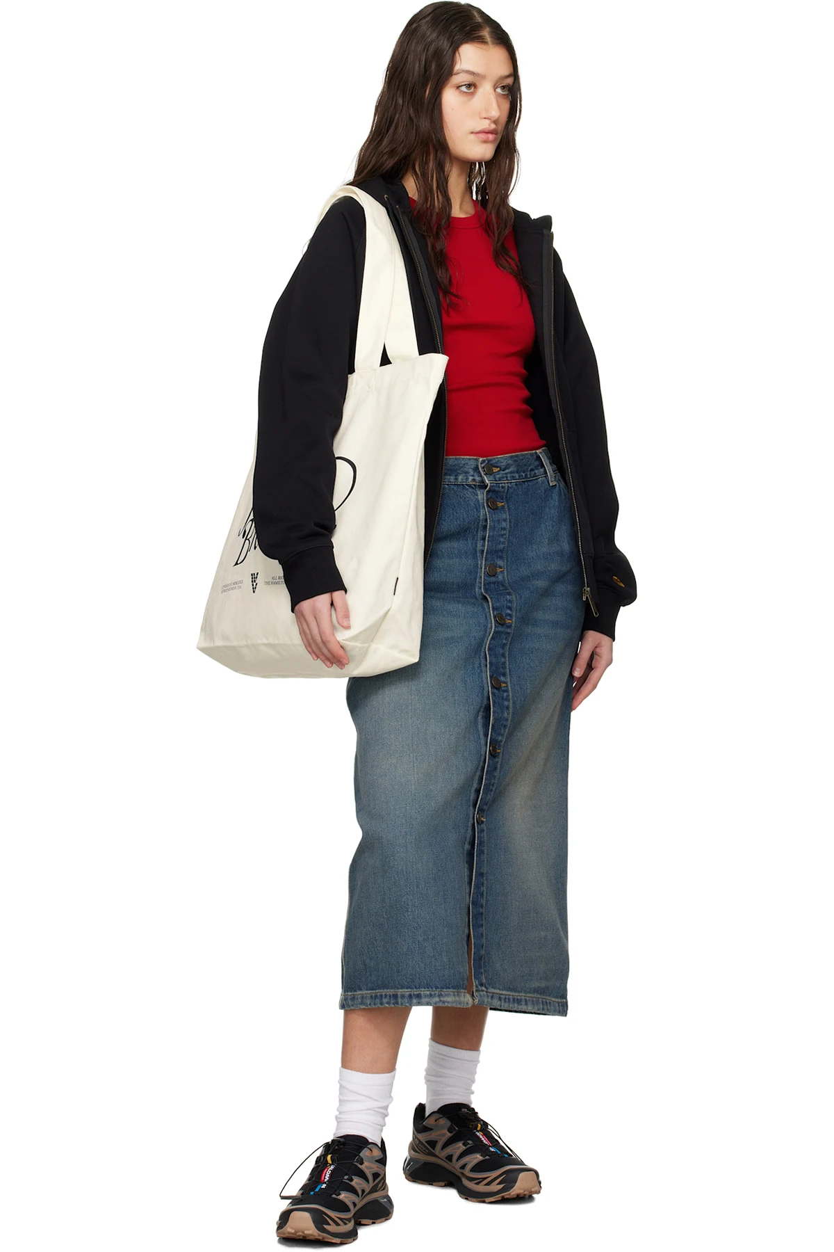 Heavyweight 13.5 oz non-stretch denim midi skirt. Fading, whiskering, and subtle distressing throughout.