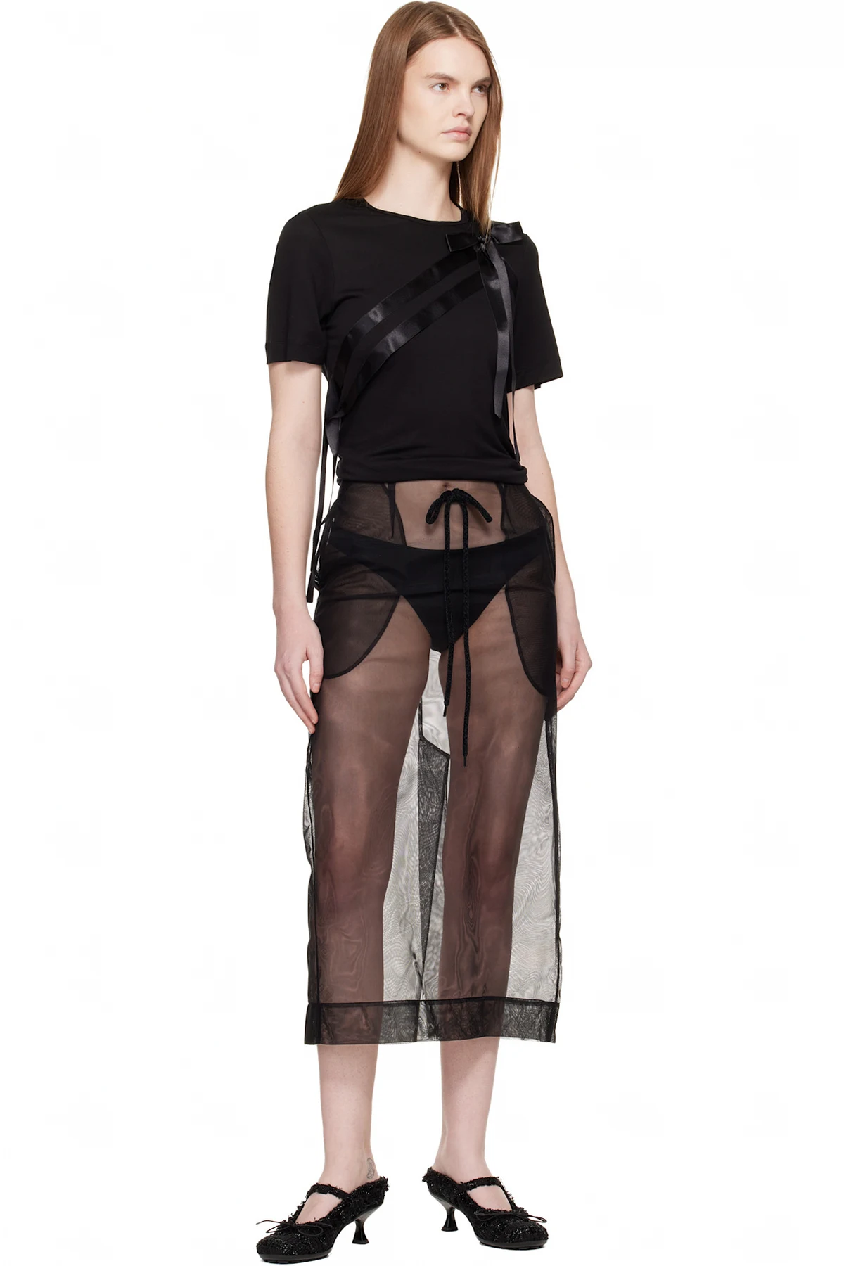 Simone Rocha Black Sheer Frayed Column Pencil Midi Skirt