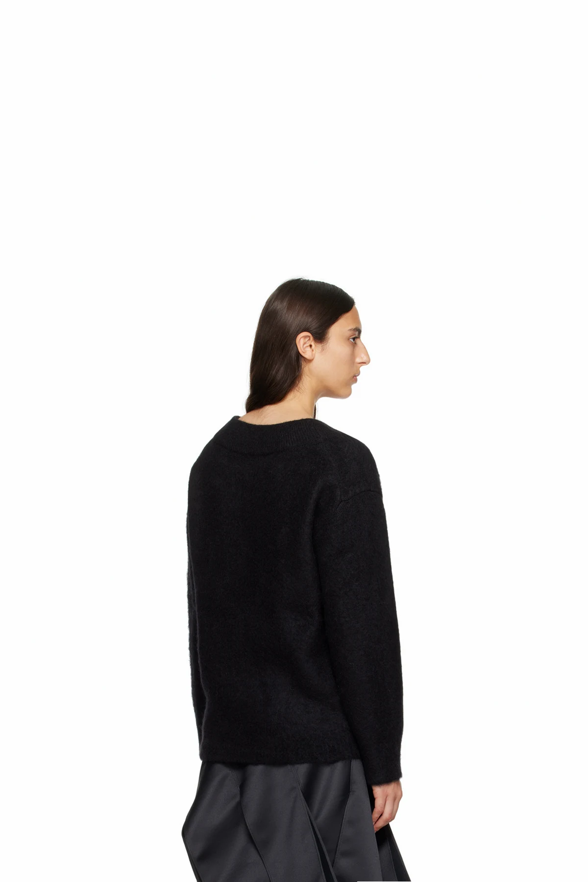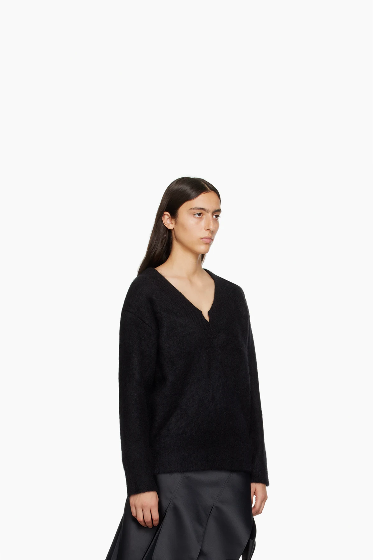 Knit mohair-blend sweater. Rib knit V-neck, hem, and cuffs