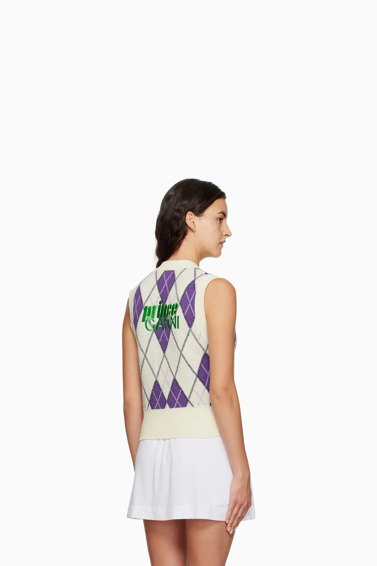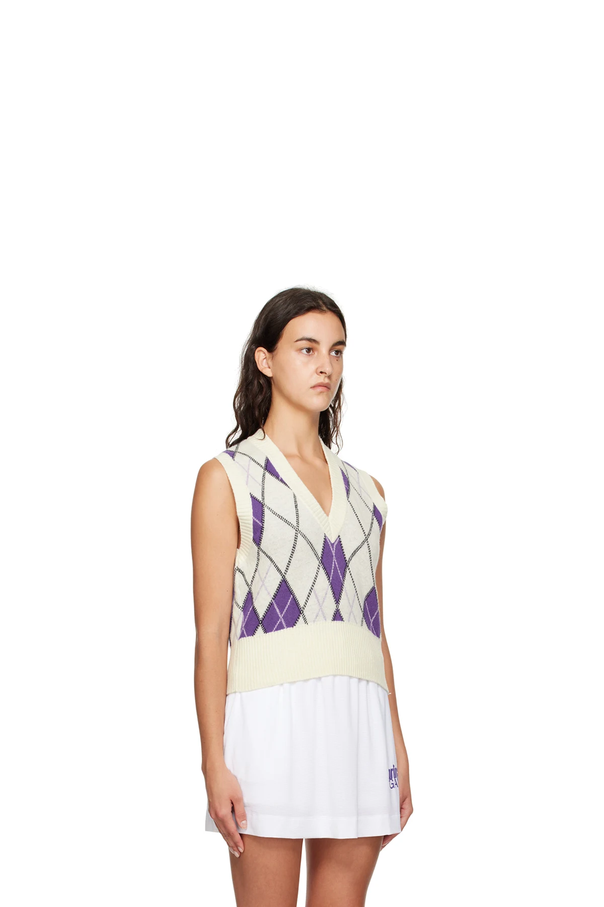 Knit wool- and recycled wool-blend vest. Jacquard argyle pattern throughout.